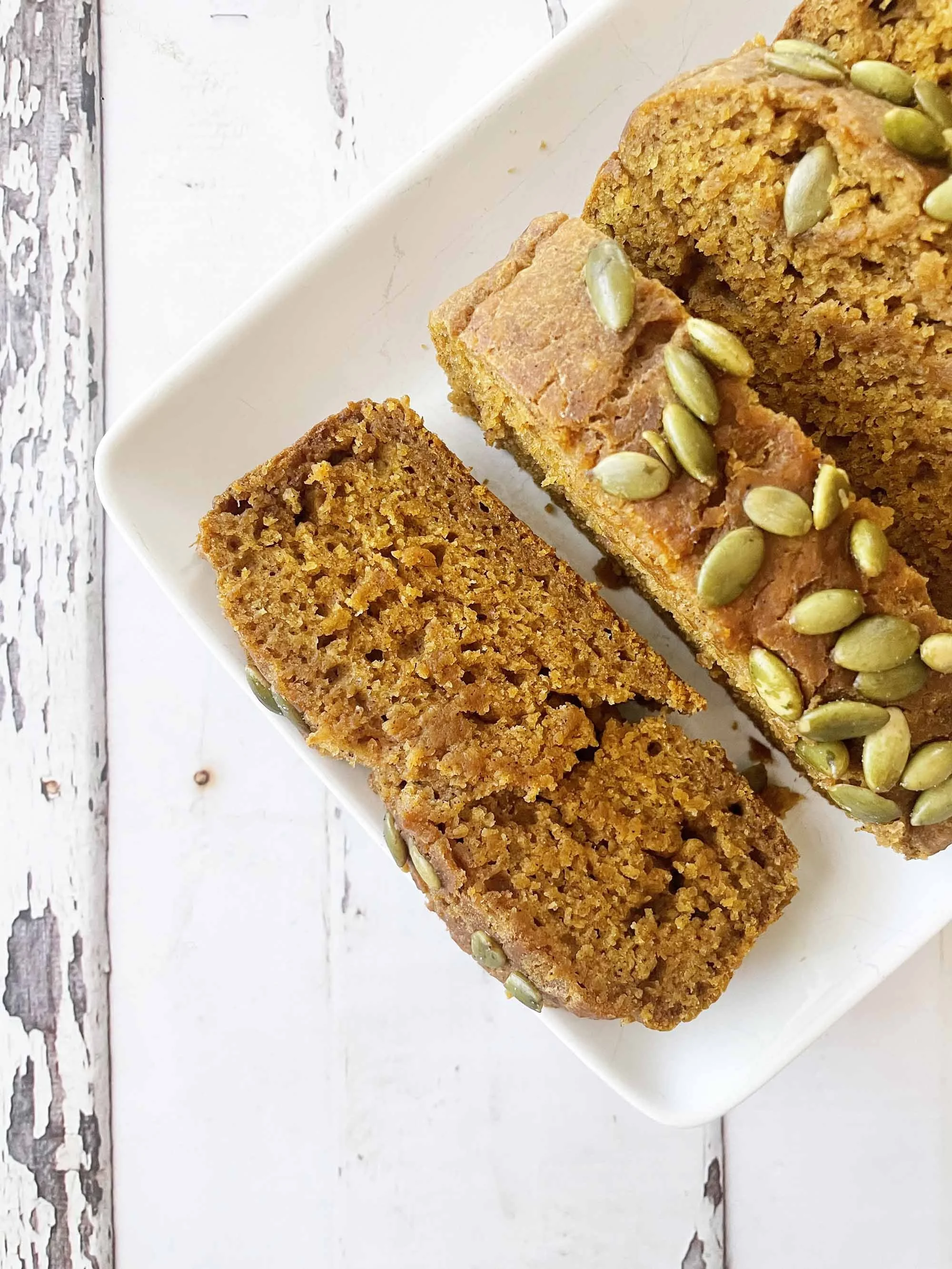 In American, Breakfast, Brunch, Desserts, Fall, Kid Friendly, Snacks, Thanksgiving, Vegetarian, Winter, Holiday Tags pumpkin, pie, spice, bread, loaf, cake