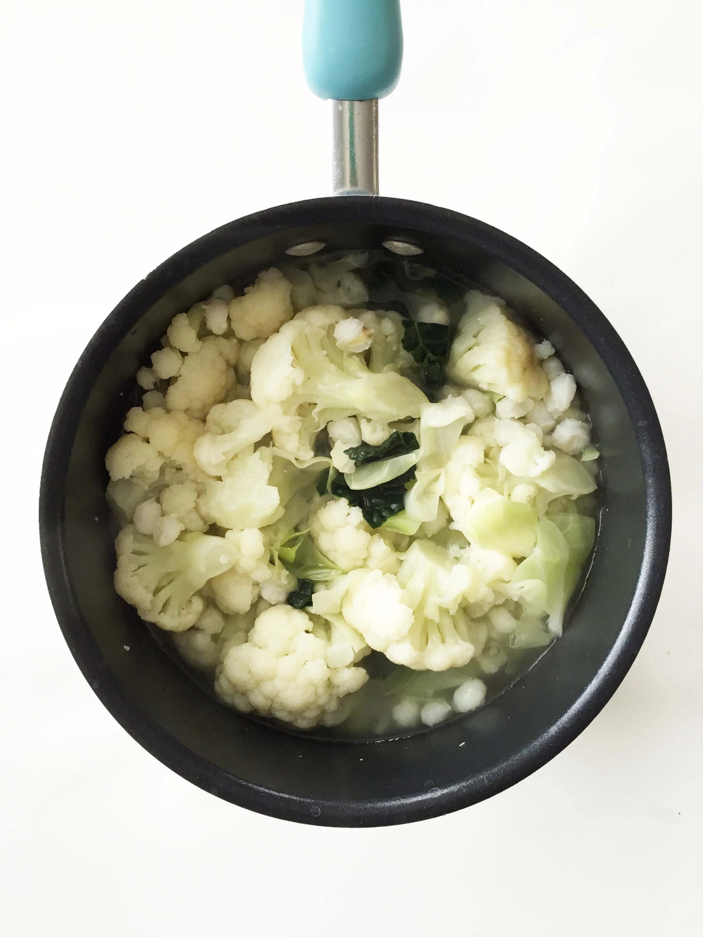 Bring a large pot of water to a boil and add in the hominy, cauliflower, cabbage and kale.