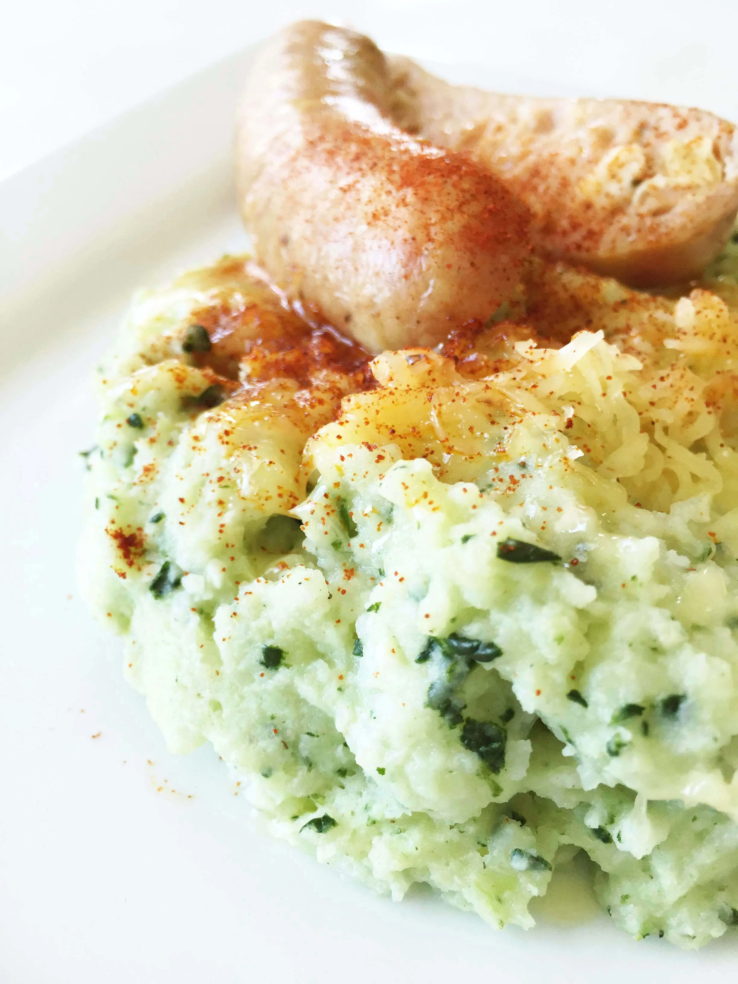 I had my Colcannon with some chicken 'bangers' to have a loose and lighter Irish play on 'bangers and mash'. I was a little skeptical about serving this to my mom for lunch, since she was sort of starting to question the idea of cabbage and kale being in a cauliflower and hominy smash, but in the end she was saying just how good it was. Though of course, she had to poke some fun at my uniqueness.