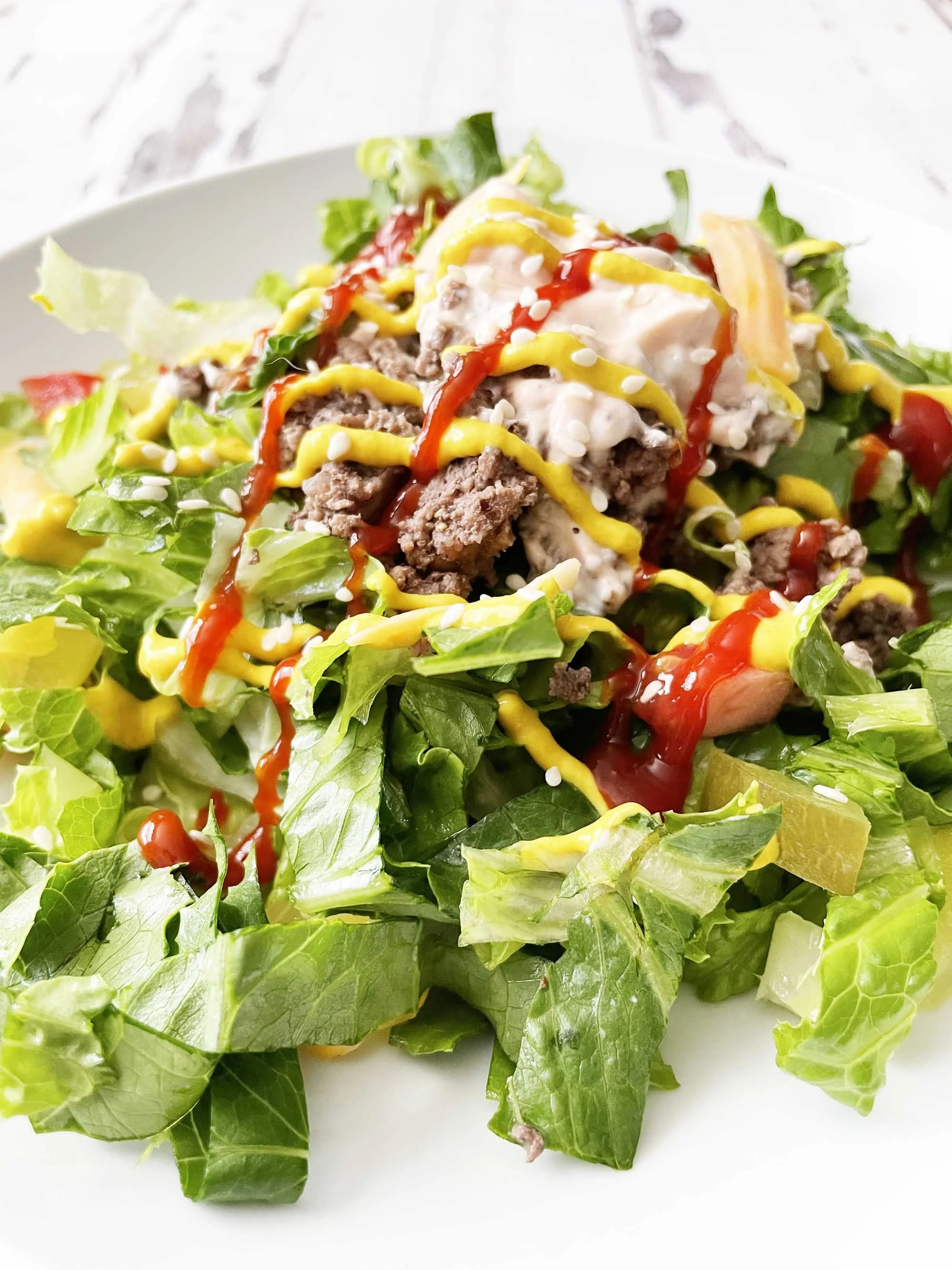 I kept this salad light by using a lean ground beef. I also subbed in some greek yogurt for sour cream when it came to making the ‘special sauce’ dressing. And light mayo was a must too! Other than that, this salad is super simple and didn’t need any other adjustments to keep it healthified.