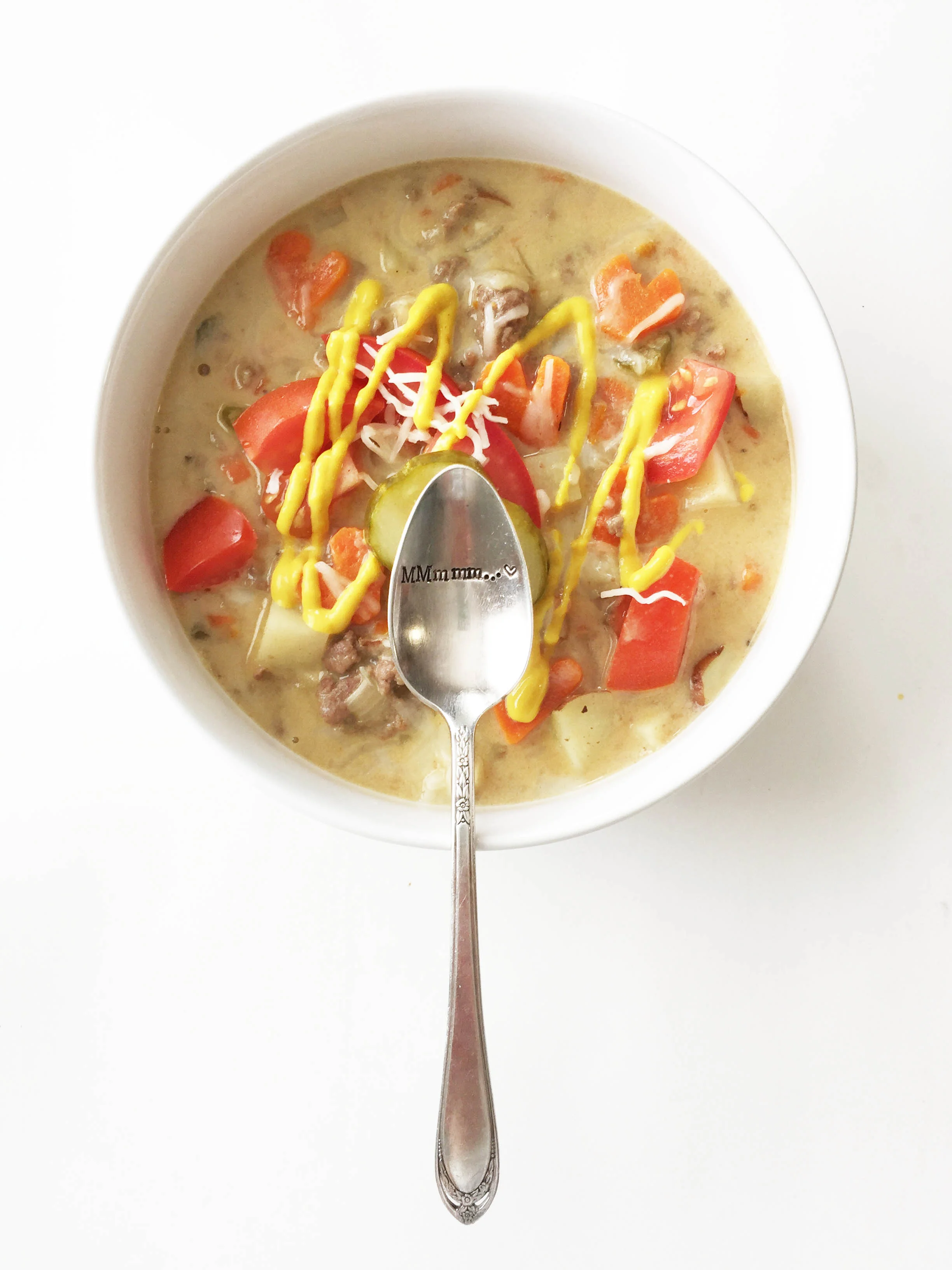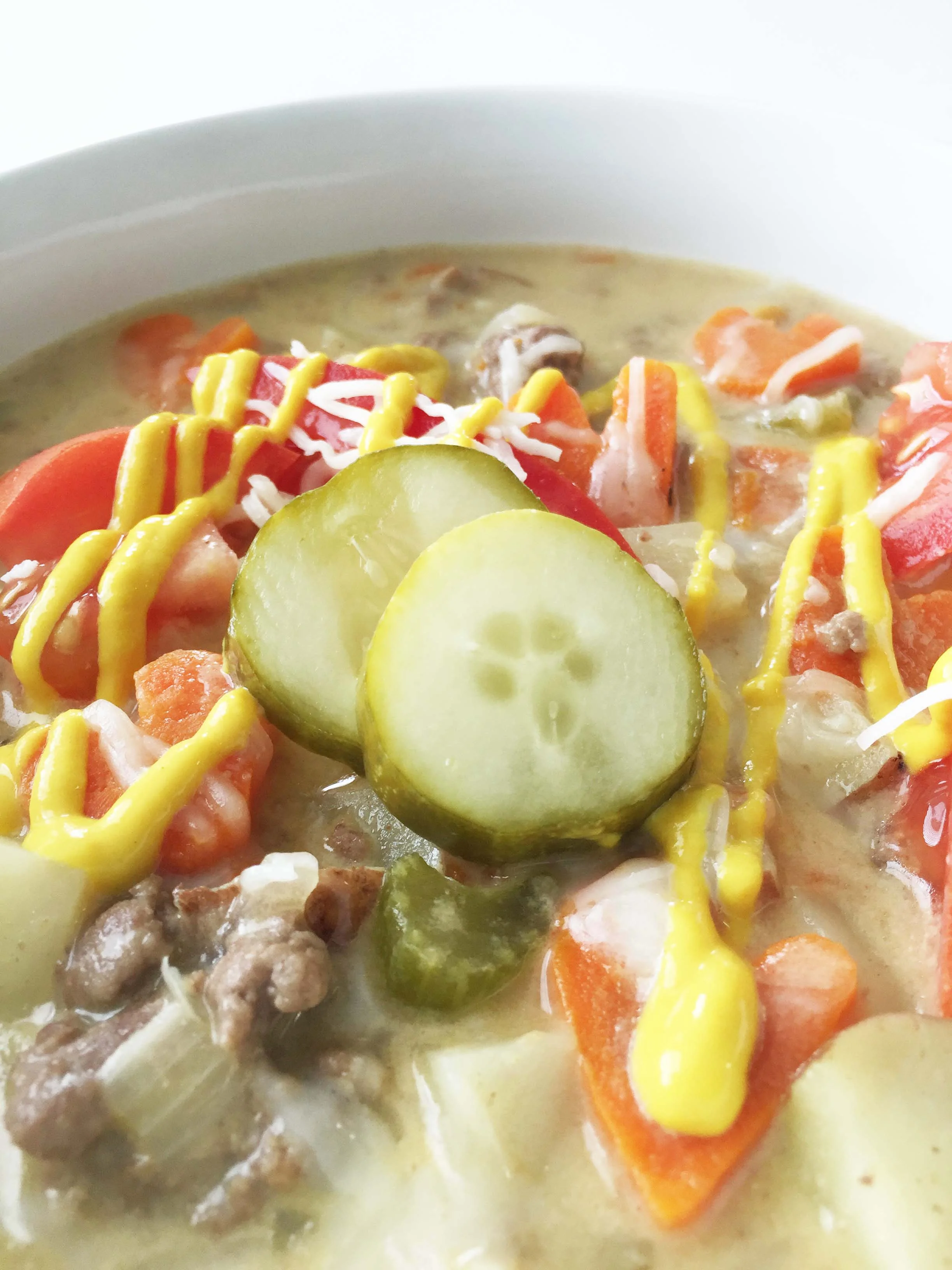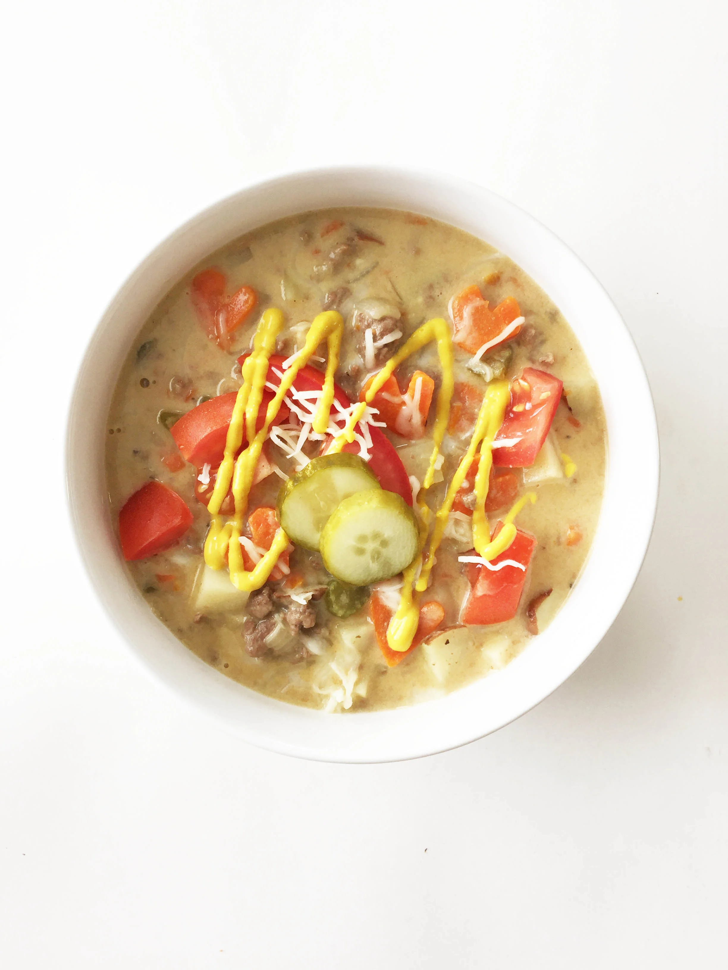 The end result was this fabulous cheesy burger infused soup. The only thing that made it better was topping it off with the burger favorite accoutrements like cheese, mustard, tomatoes and pickles!