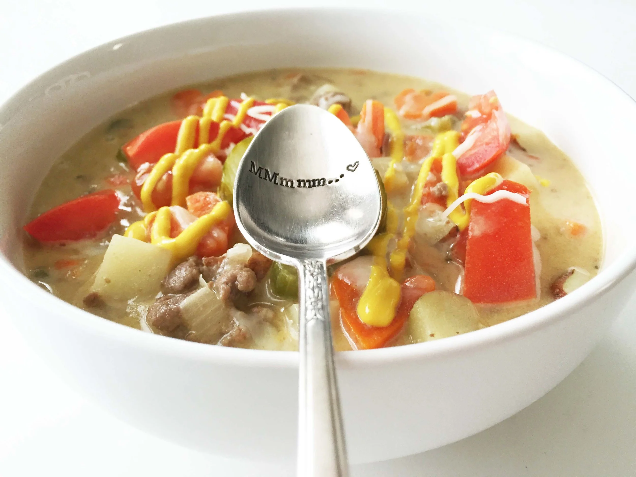 One of our traditional family favorites no matter the time of year is definitely cheeseburgers. Generally, if we can't think of anything else to grill/cook we end up with burgers and hotdogs. Today I'm taking this delicious staple and transforming it into a better-for-you hearty soup!