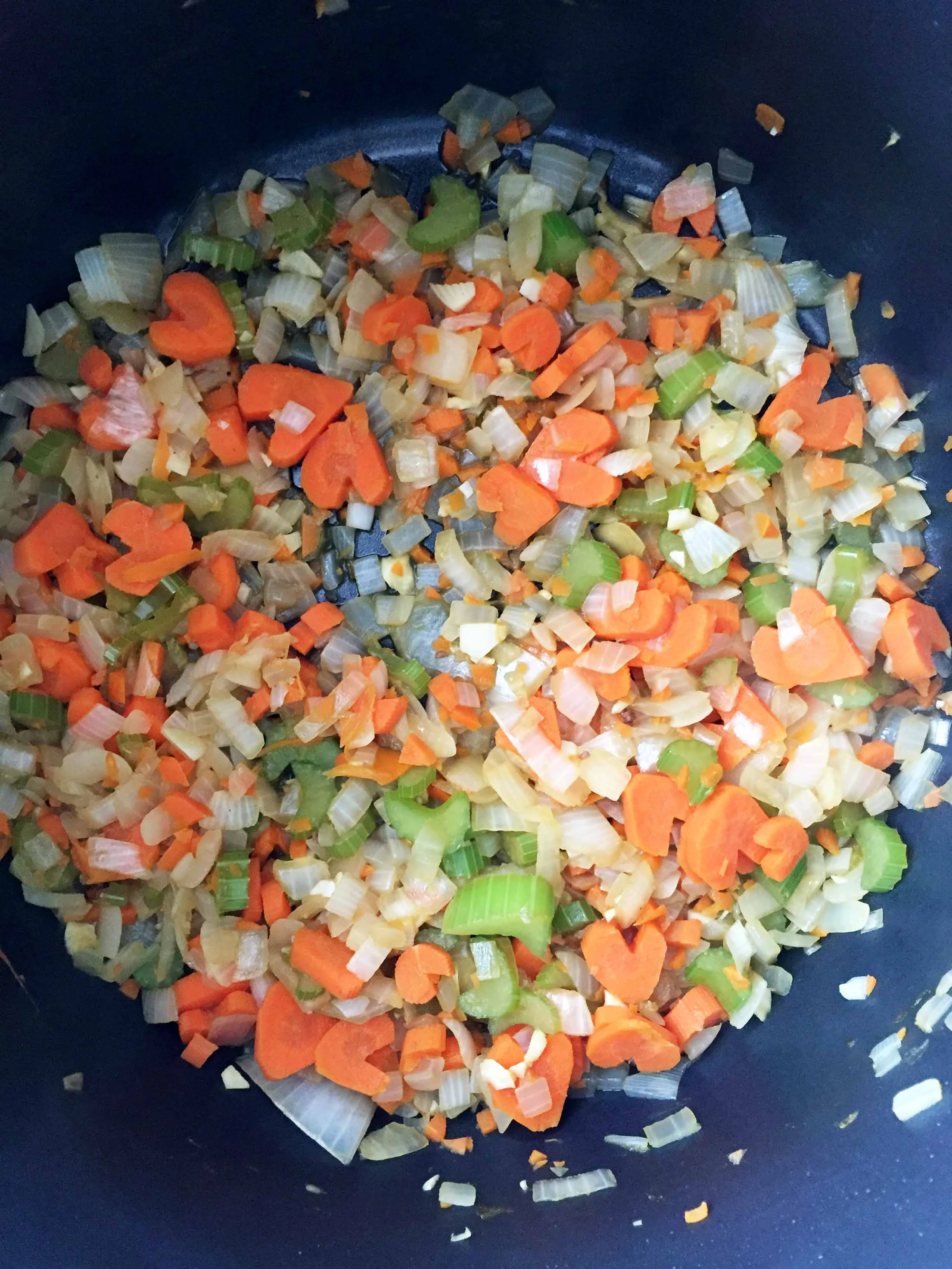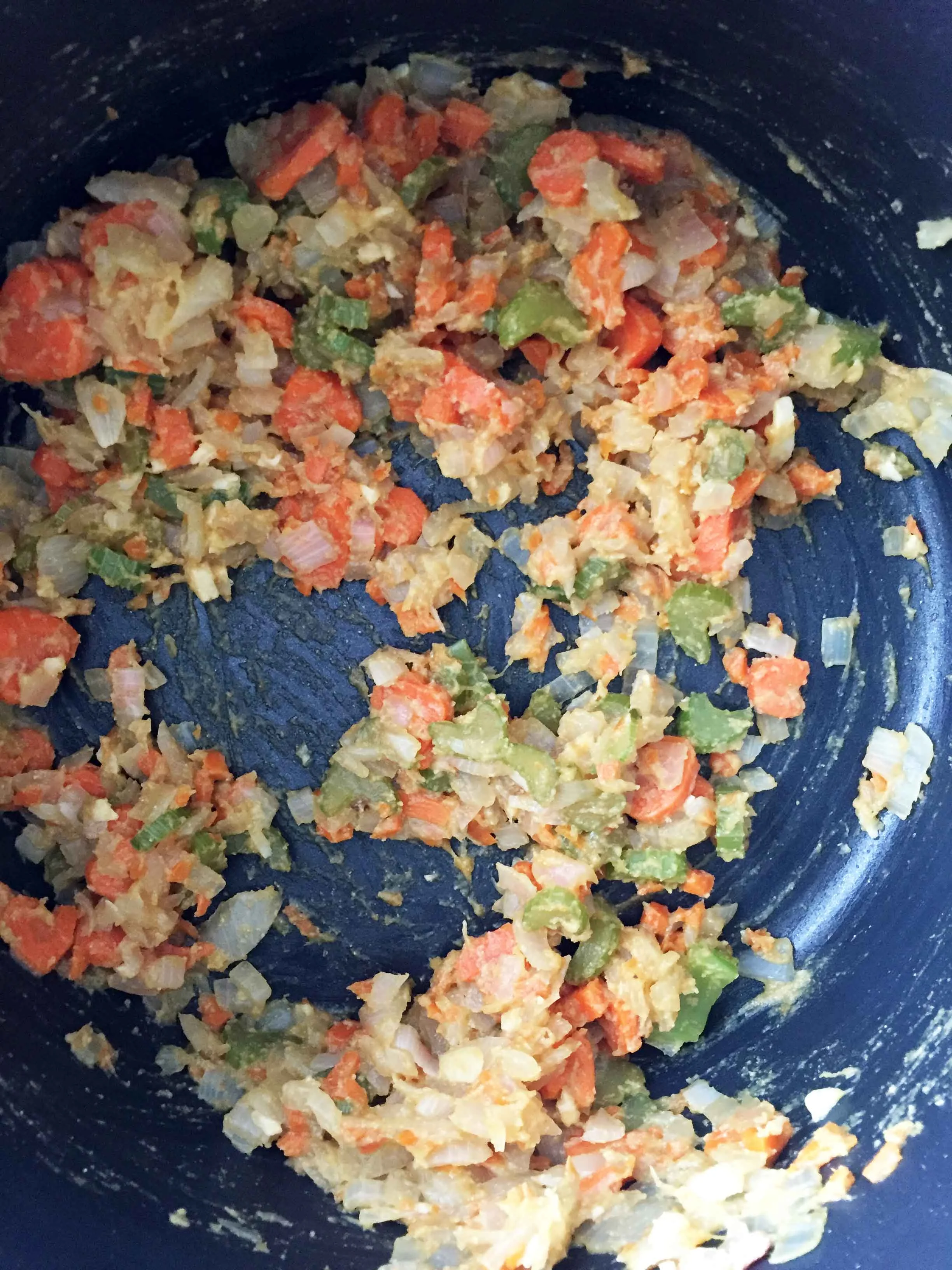 Add the, onion, celery carrots, garlic, Worcestershire, and 1/4 c. of the chicken stock into the large pot.