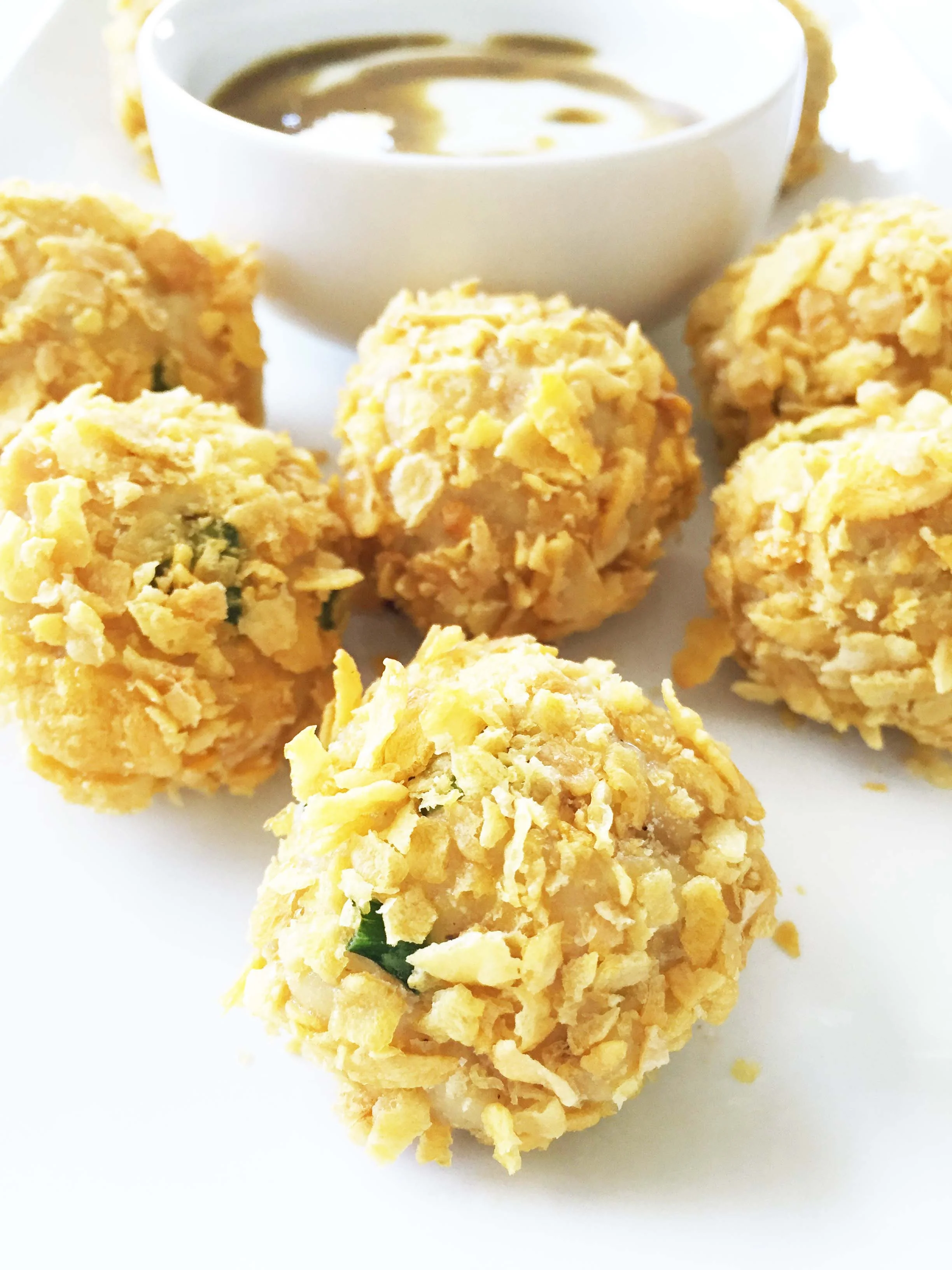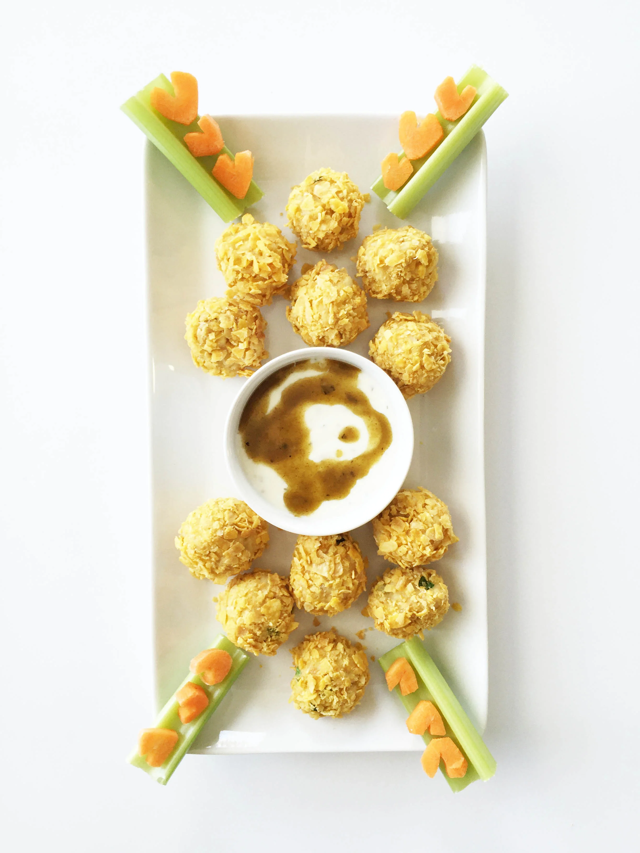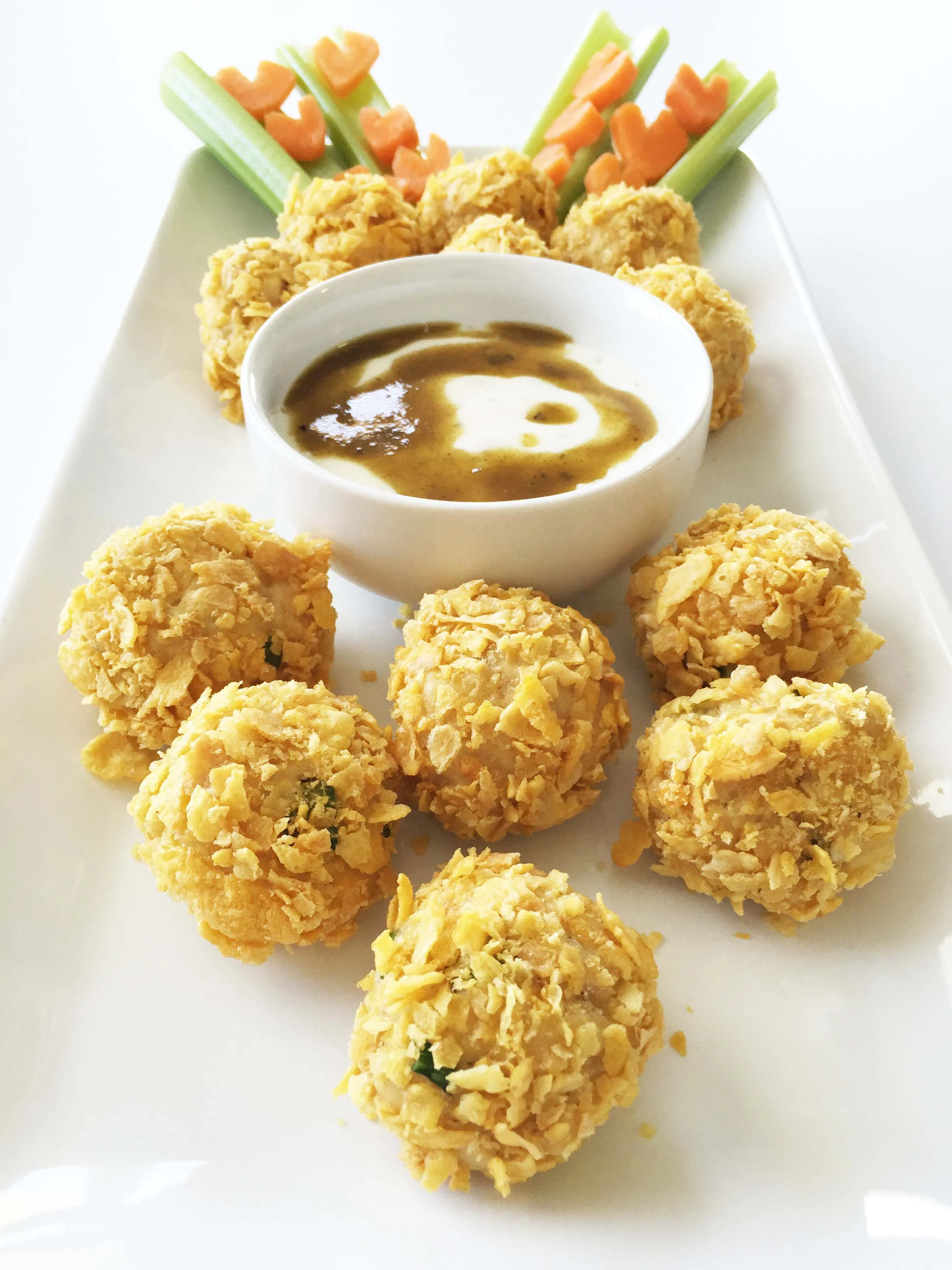 I crusted these bites on the outside with a corn cereal to give that needed crunchy contrast of texture to go against the shredded chicken, melted cheese, and dip on the inside. Of course, I had to serve my bites with some fresh crisp veggies and a spiced up ranch with added green enchilada sauce.
