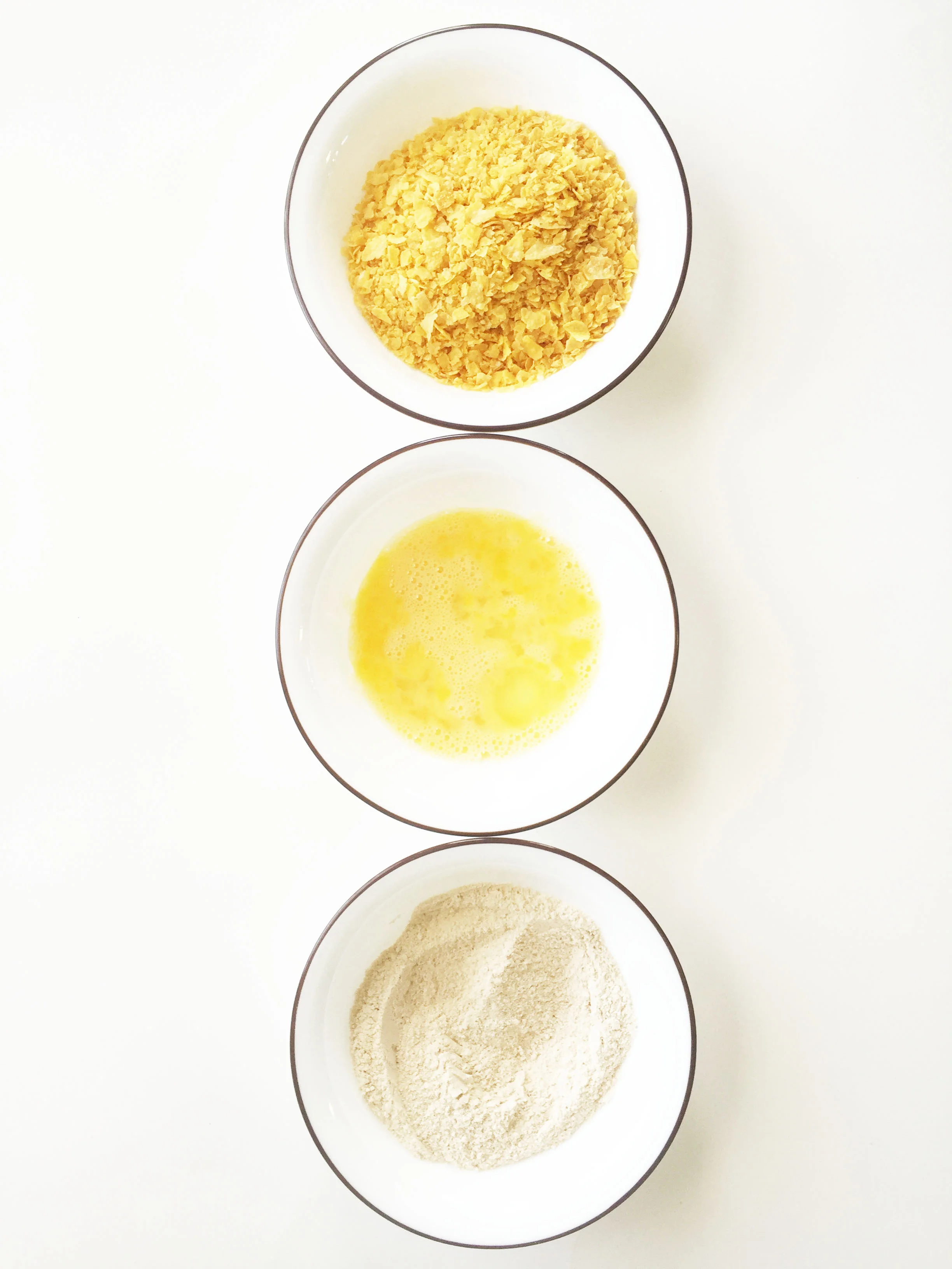 Using 3 separate bowls, set out the 1/2 C. flour, 1 egg, 2 egg whites and 3 C. crushed cereal.