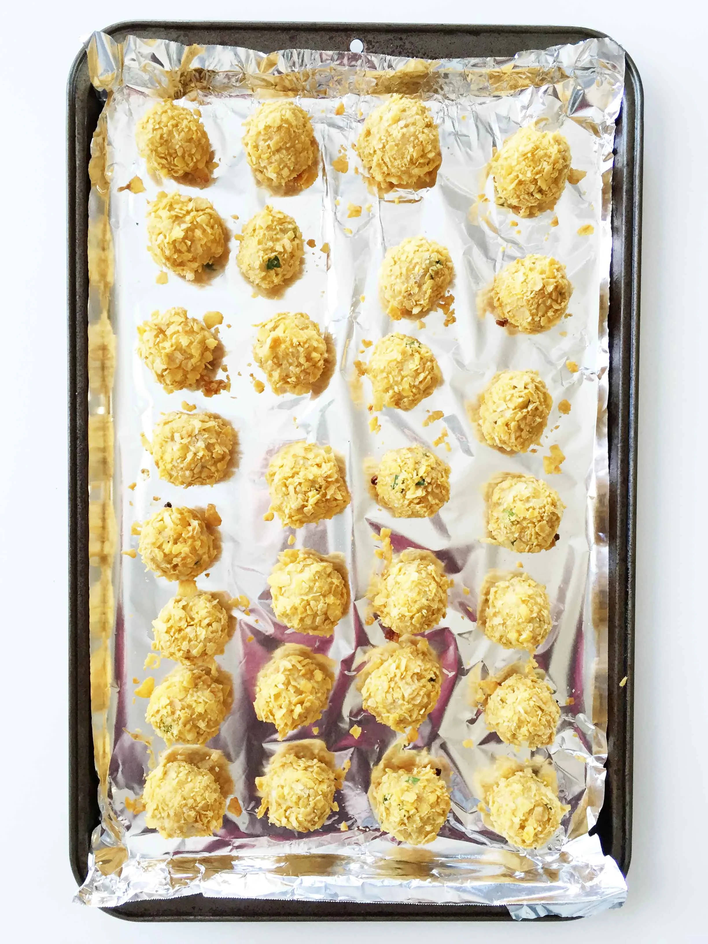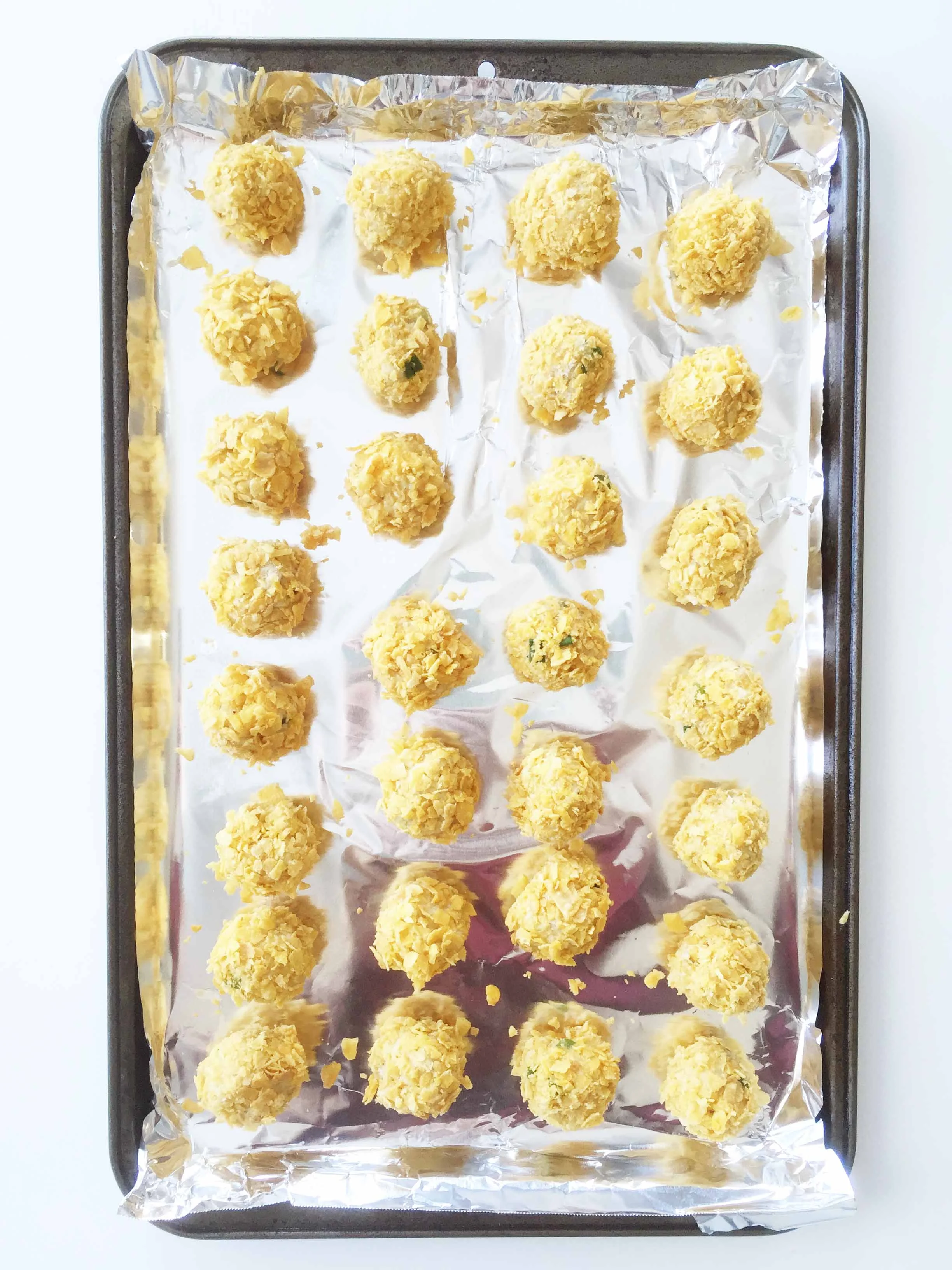 Set the coated balls aside on the prepared baking sheet and repeat this until you have about 30 balls.