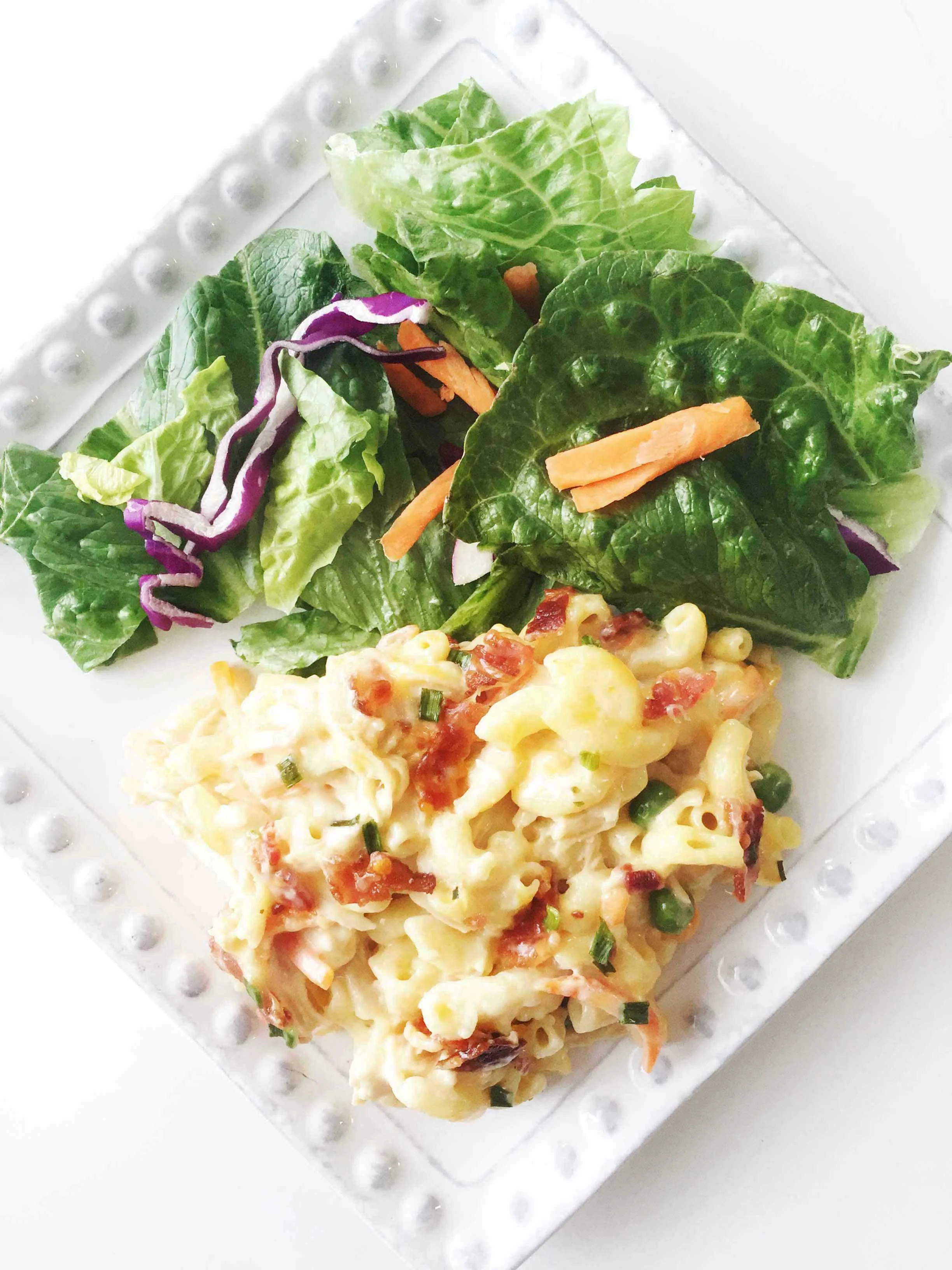 I did my best to make this macaroni into a more guilt-free and gluten-free variation by using gluten-free pasta, low sodium center cut bacon, light ranch dressing, and greek yogurt. What does all that mean? Well, you have a dish that's better for you without seeming like it at all!
