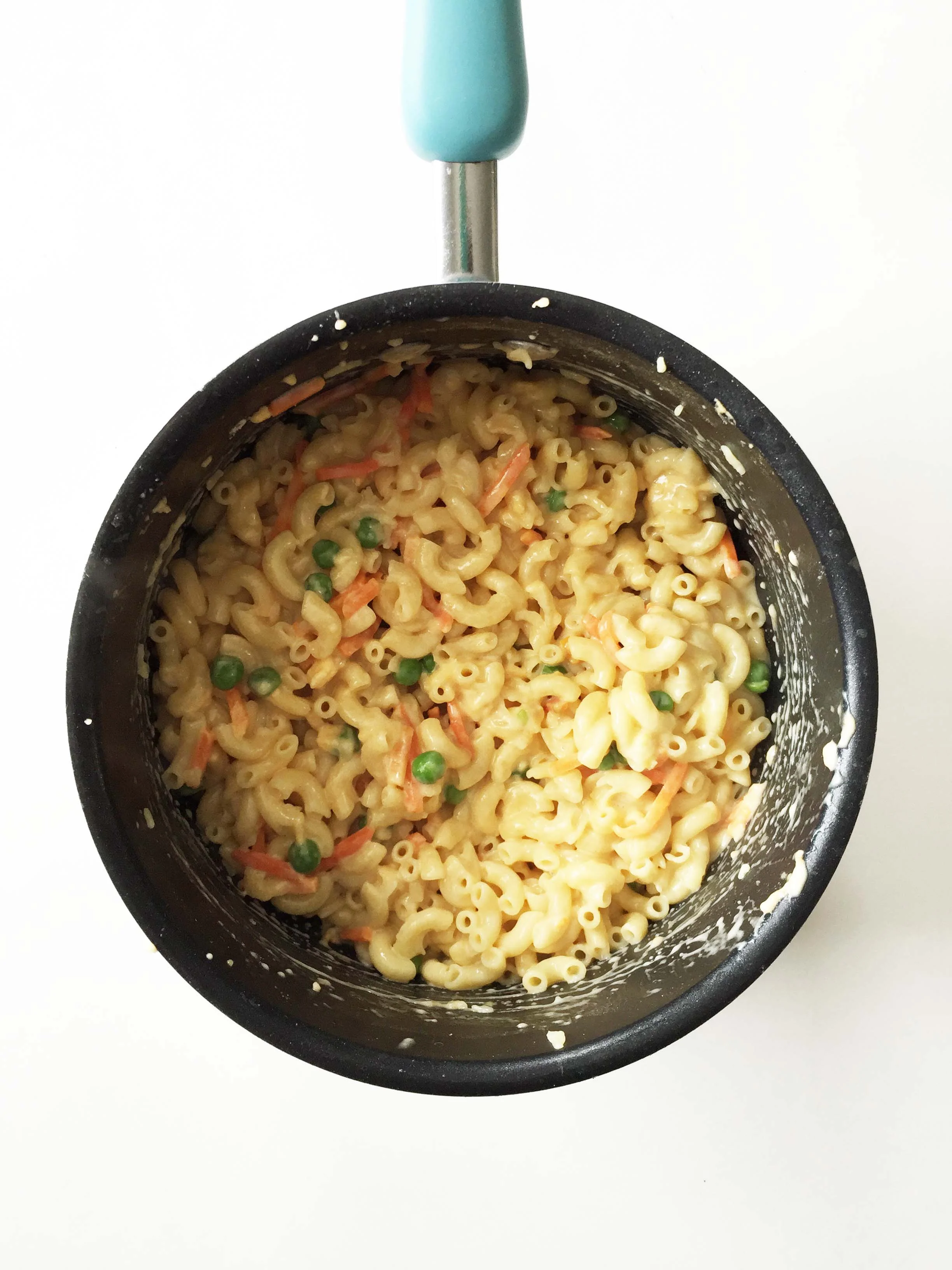 When the noodles are about halfway cooked through, add in the peas and carrots and continue to cook for the remaining time; and follow the package directions through.