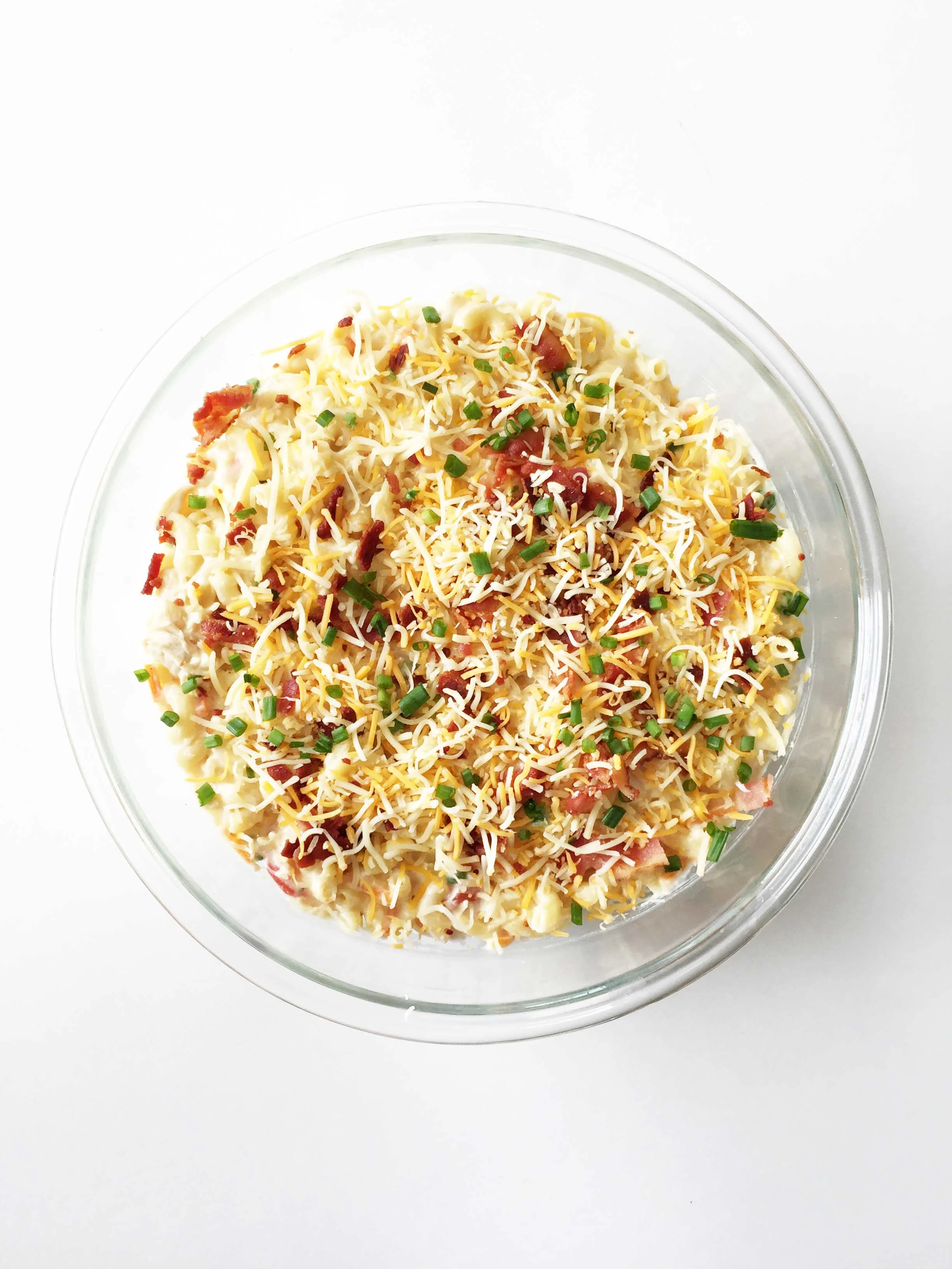 Transfer the mixture into a large oven safe baking dish; top with the remaining cheese, bacon, and chives.