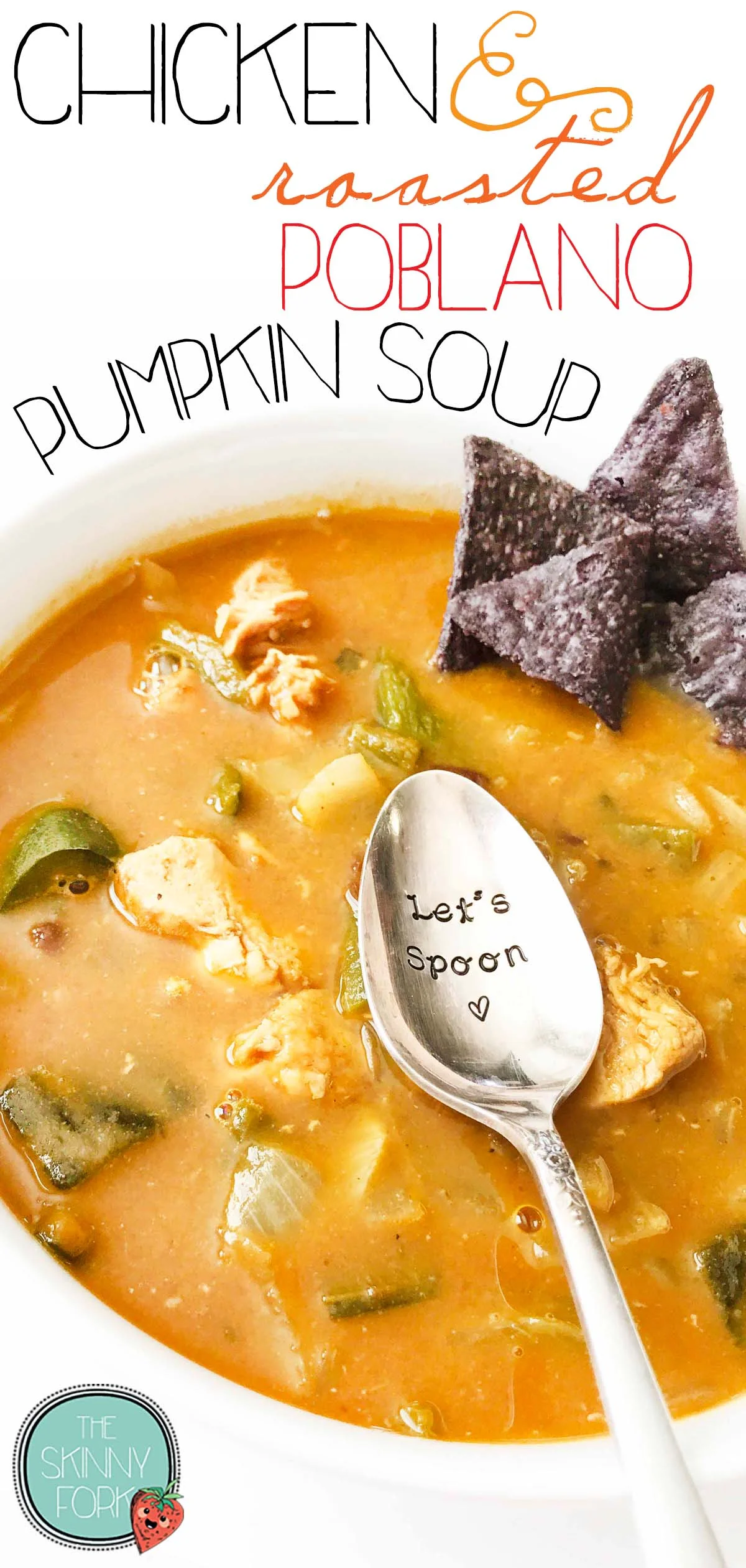 TheSkinnyFork.com A fun Fall twist on a Tex-Mex style soup. Poblano peppers, chicken, beans, and plenty of spices help to make up this delicious and rather easy to make meal-in-a-bowl! Prep Time: 15 Minutes • Cook Time: 30 Minutes