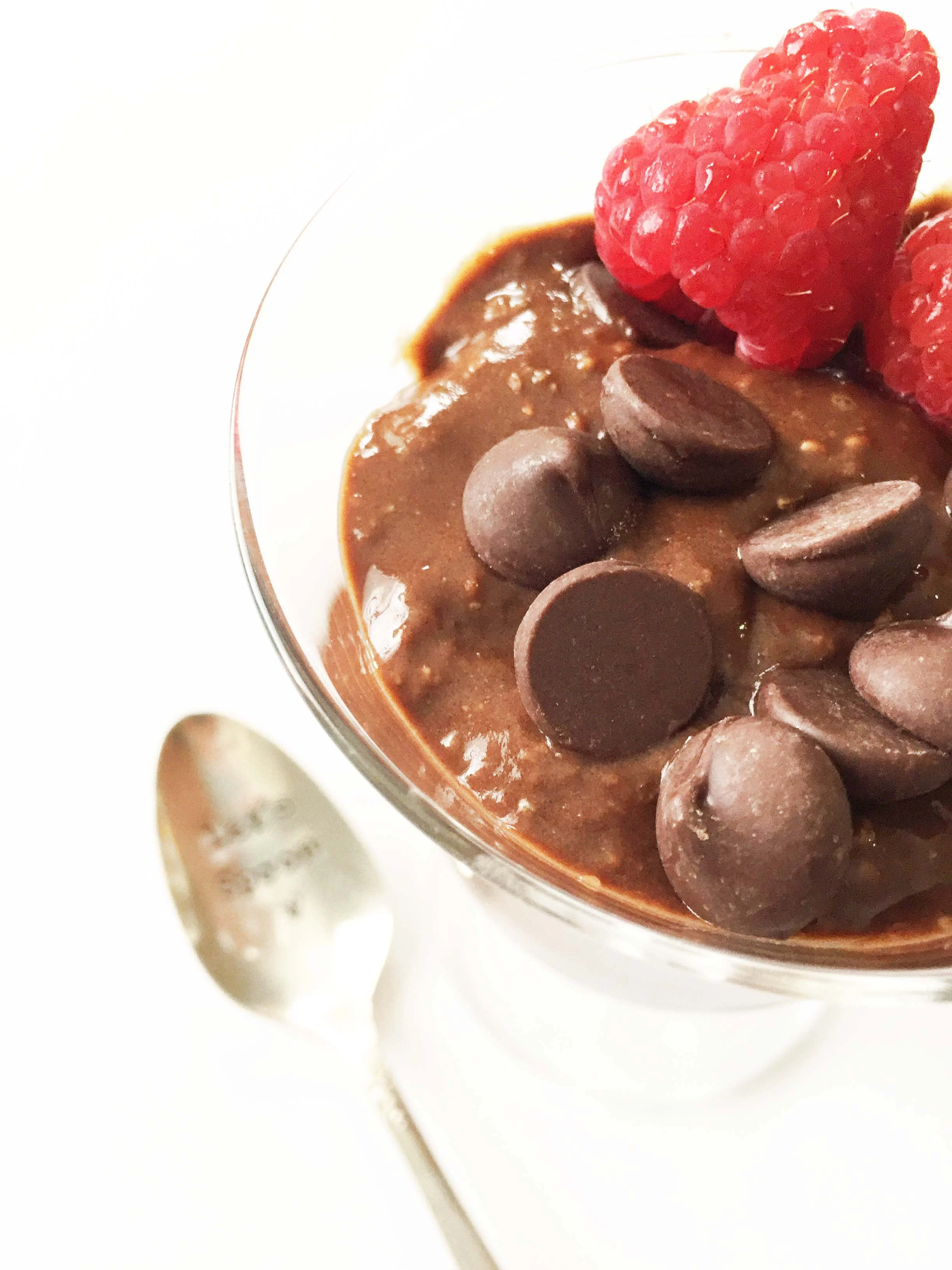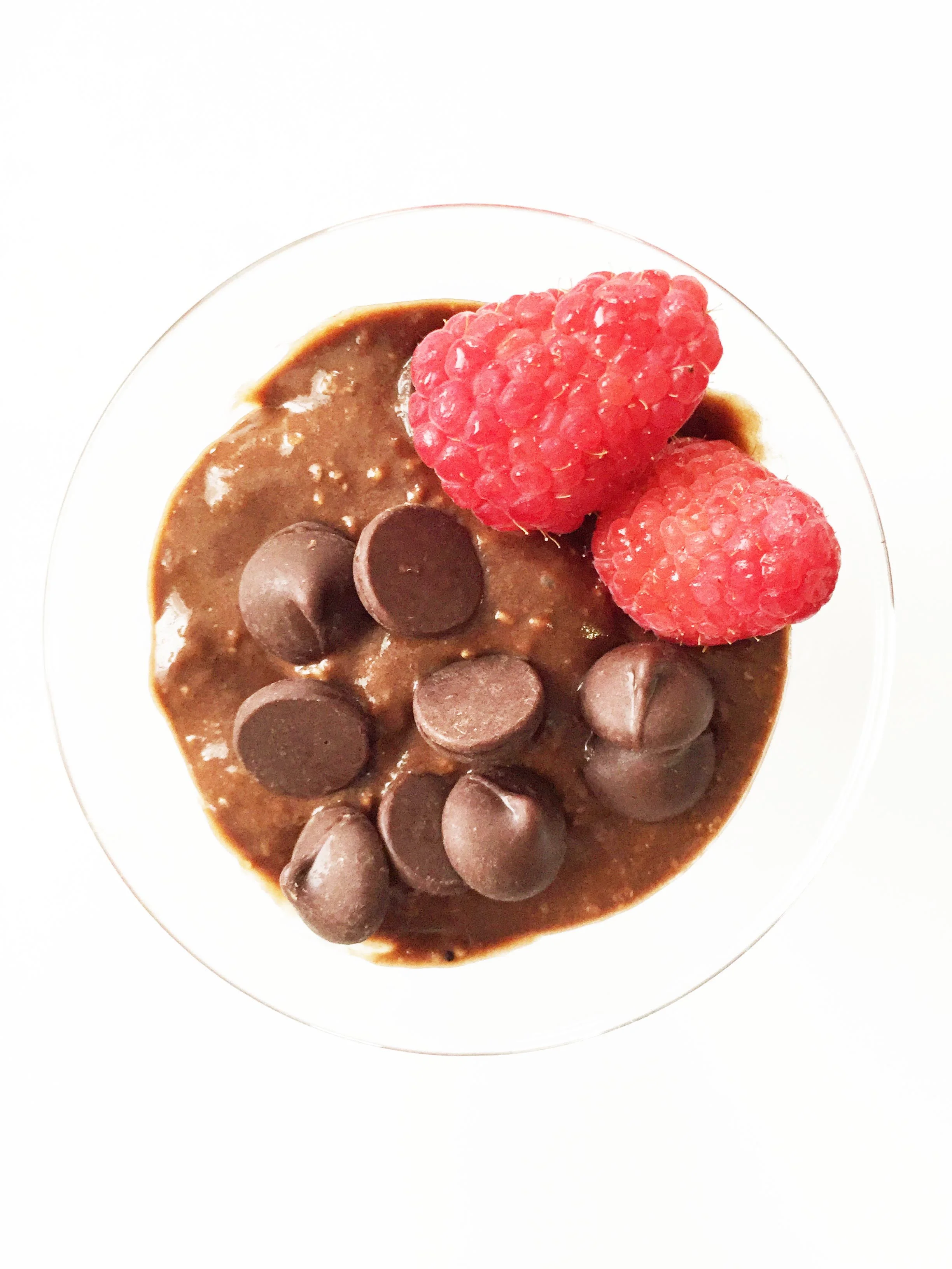 I added a few dark chocolate chips and a couple of fresh raspberries to top off my chocolate chia pudding, but some peanut butter or banana would taste pretty good too!