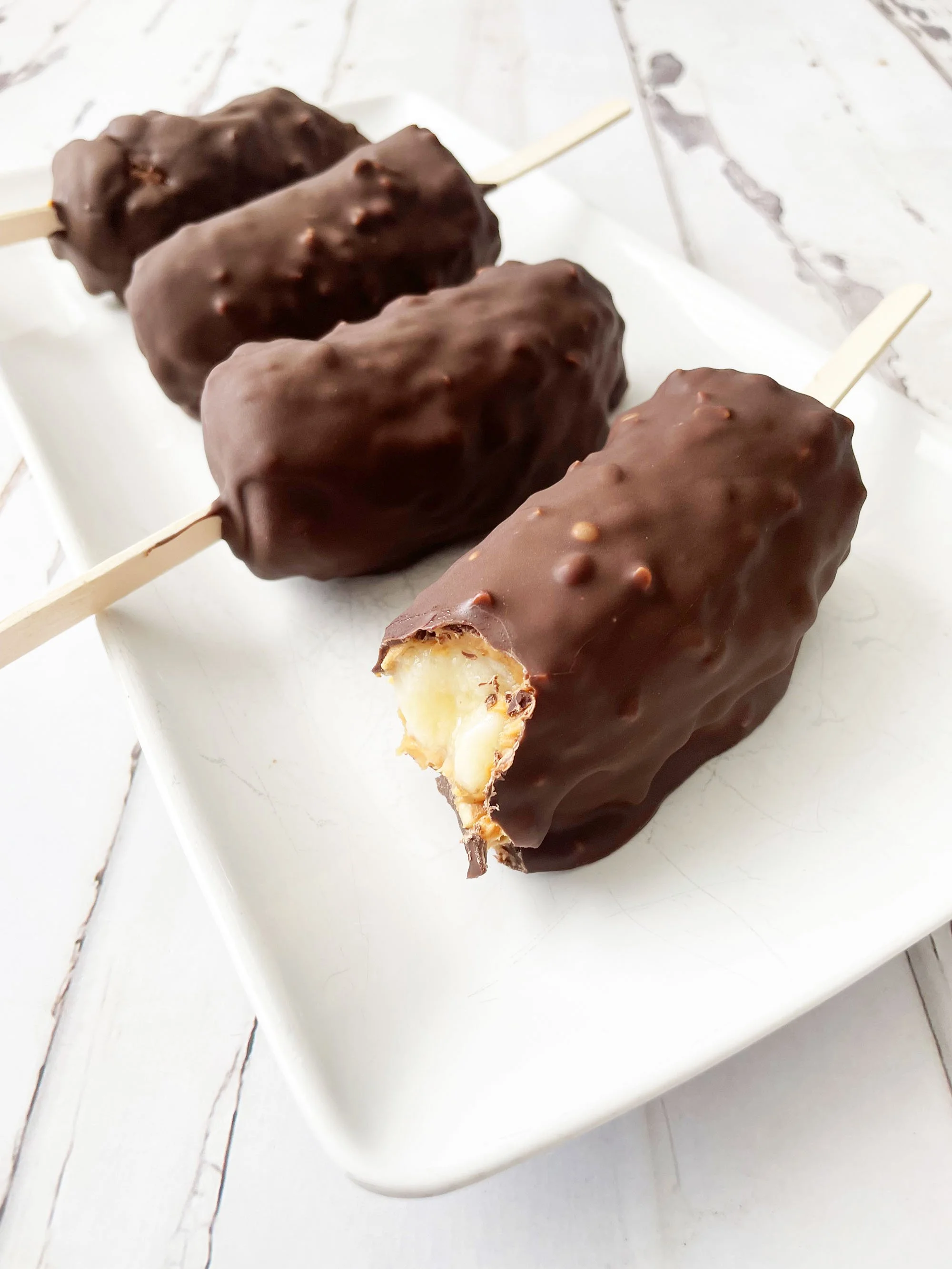 - Dip the frozen banana halves into the melted peanut butter then into the melted dark chocolate.
