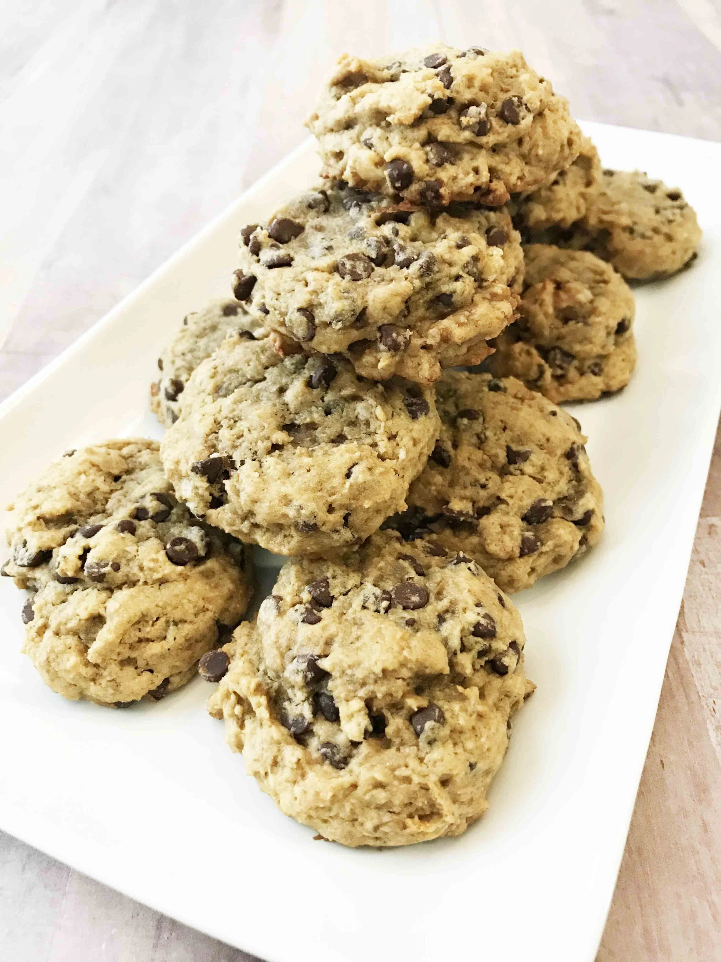 These aren’t SMALL cookies either. I kept thinking when I first took them out that they would fall and settle into a shorter cookie, but they didn’t! They remained risen and perfectly textured for a soft chocolate chip cookie. Yes, SOFT cookie. These don’t have much crunch to them other than the walnuts.