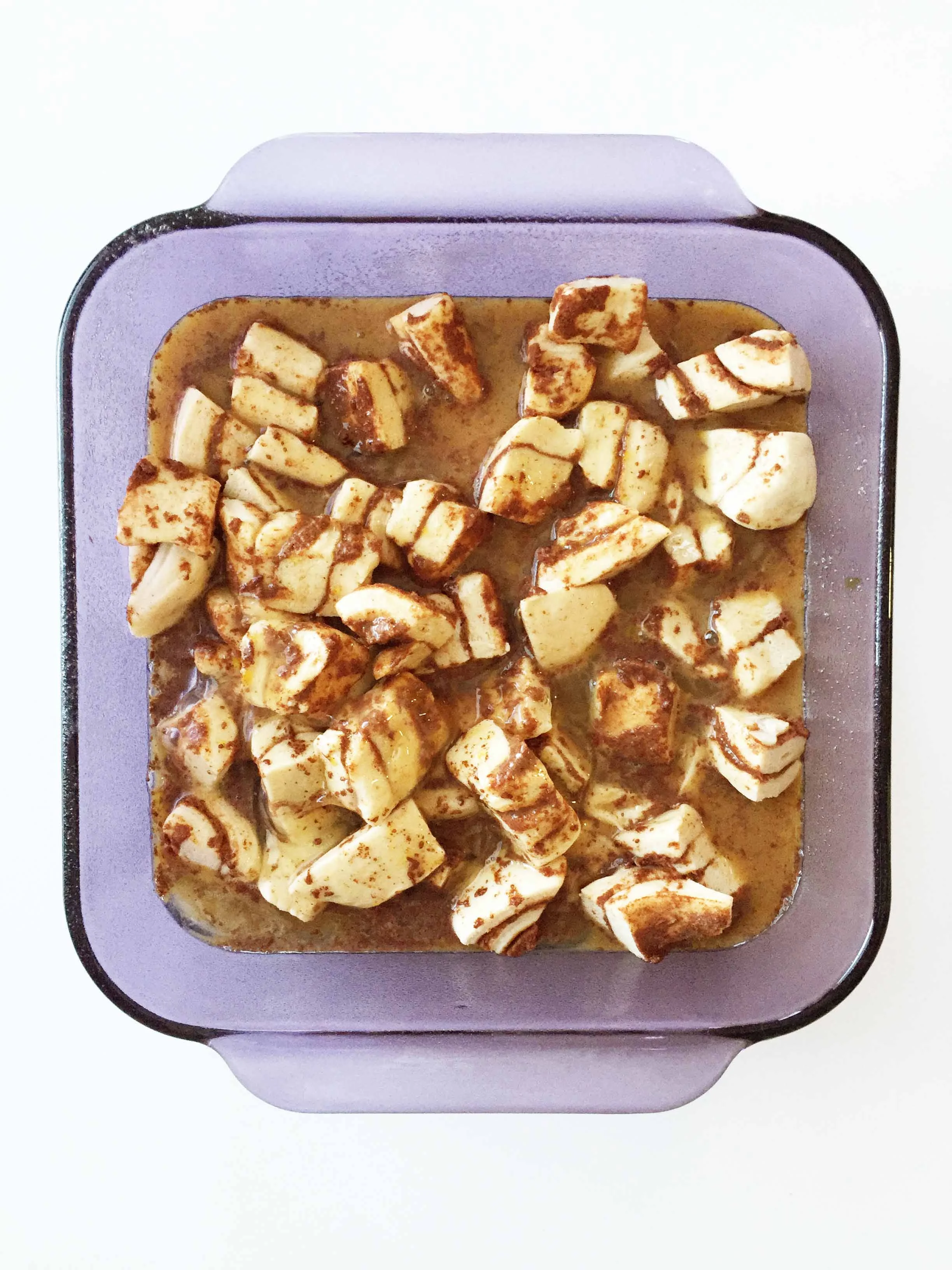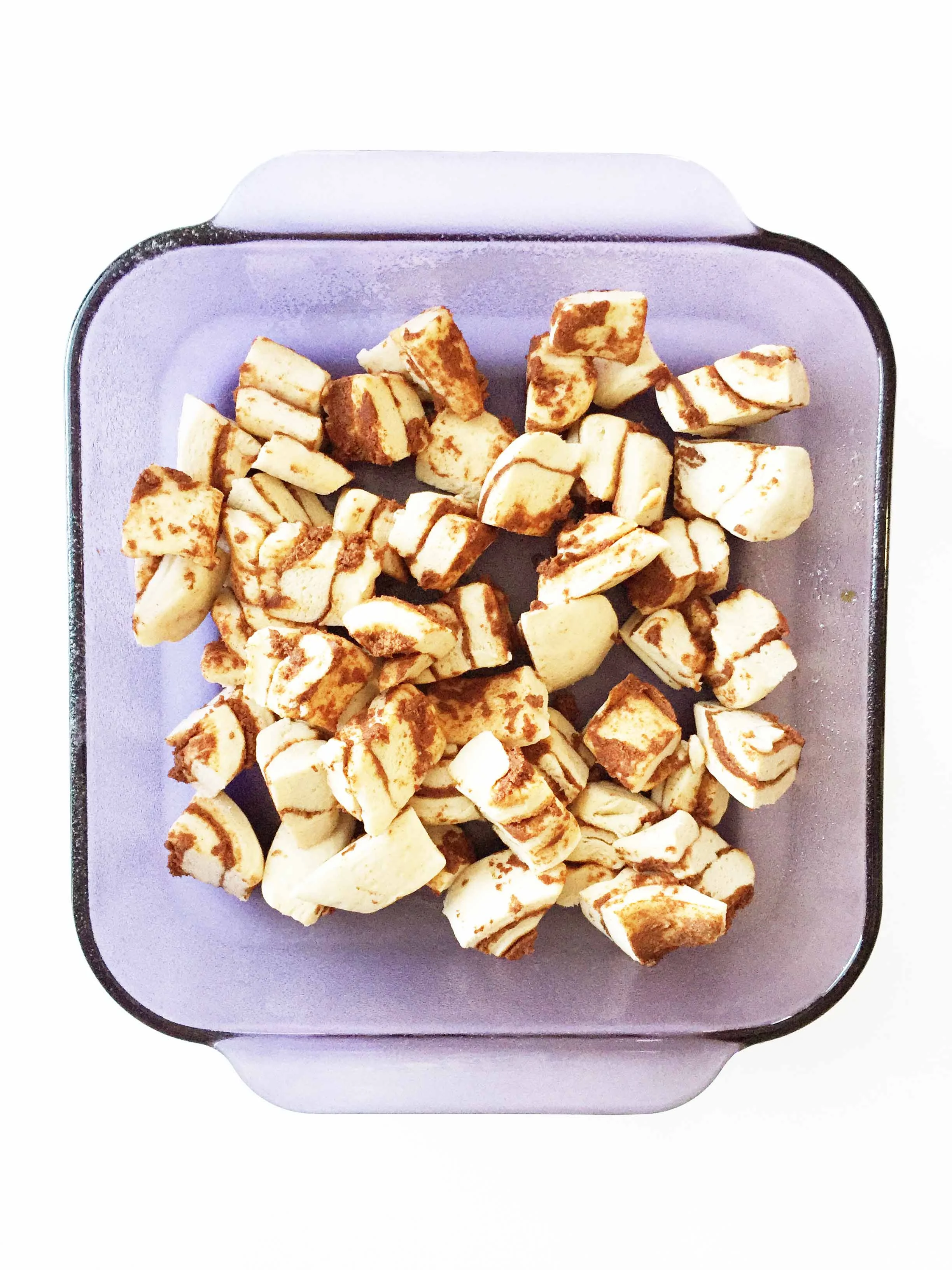 Cut the cinnamon rolls into around 6-8 pieces each and place them into the bottom of the prepared baking dish.