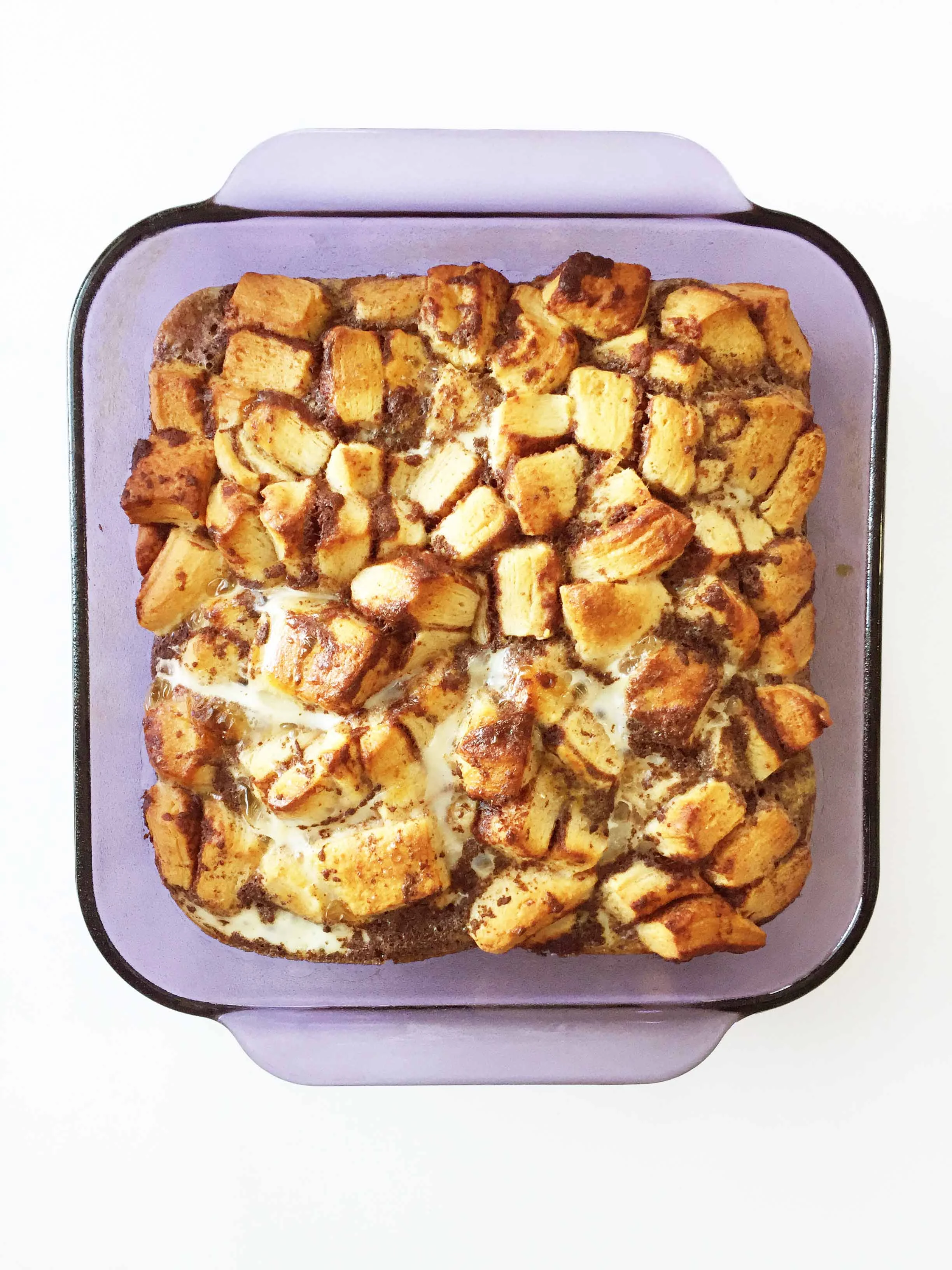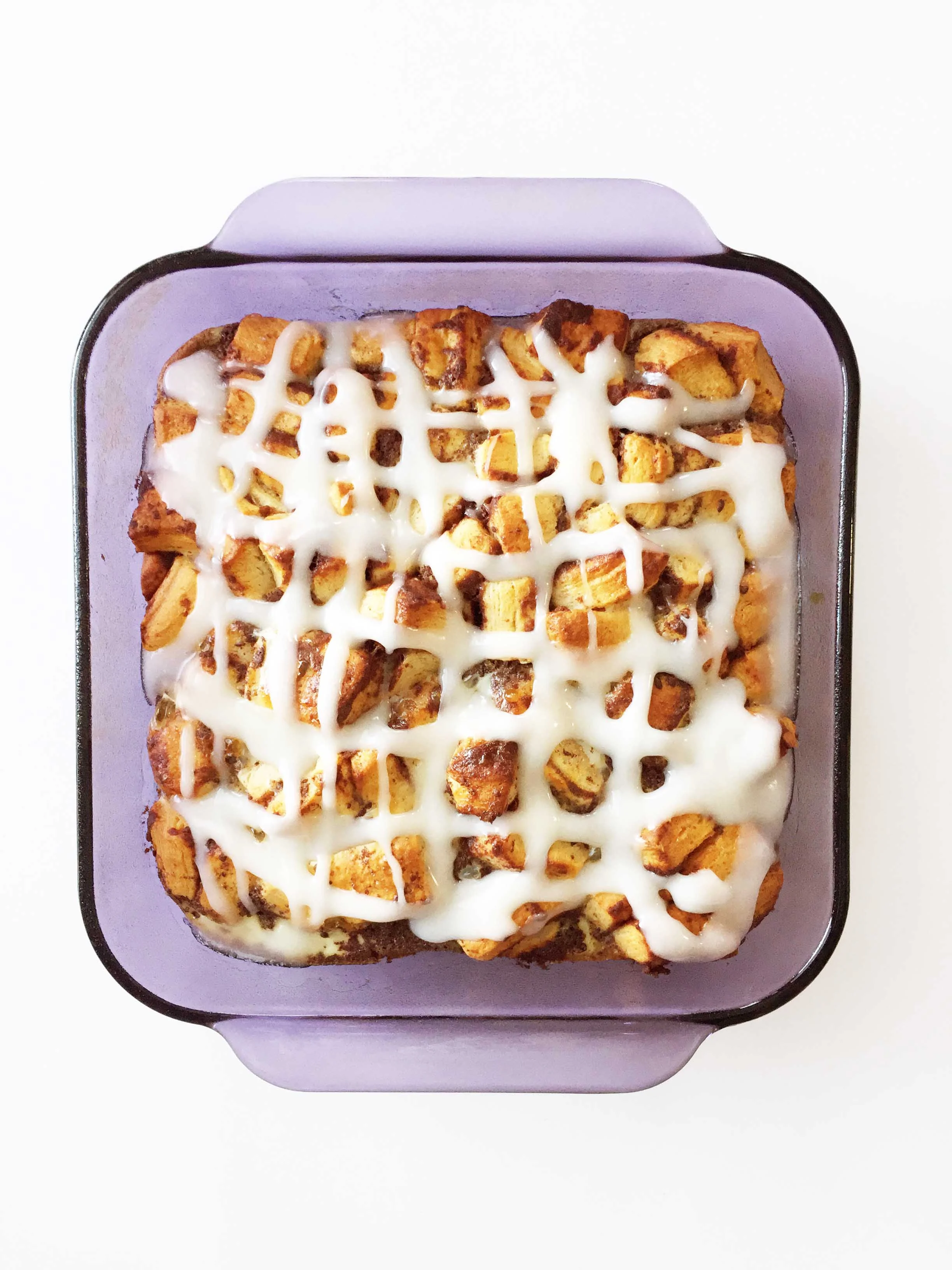 Remove the pan from the oven and drizzle the reserved cinnamon roll frosting over the top of the still hot bake.