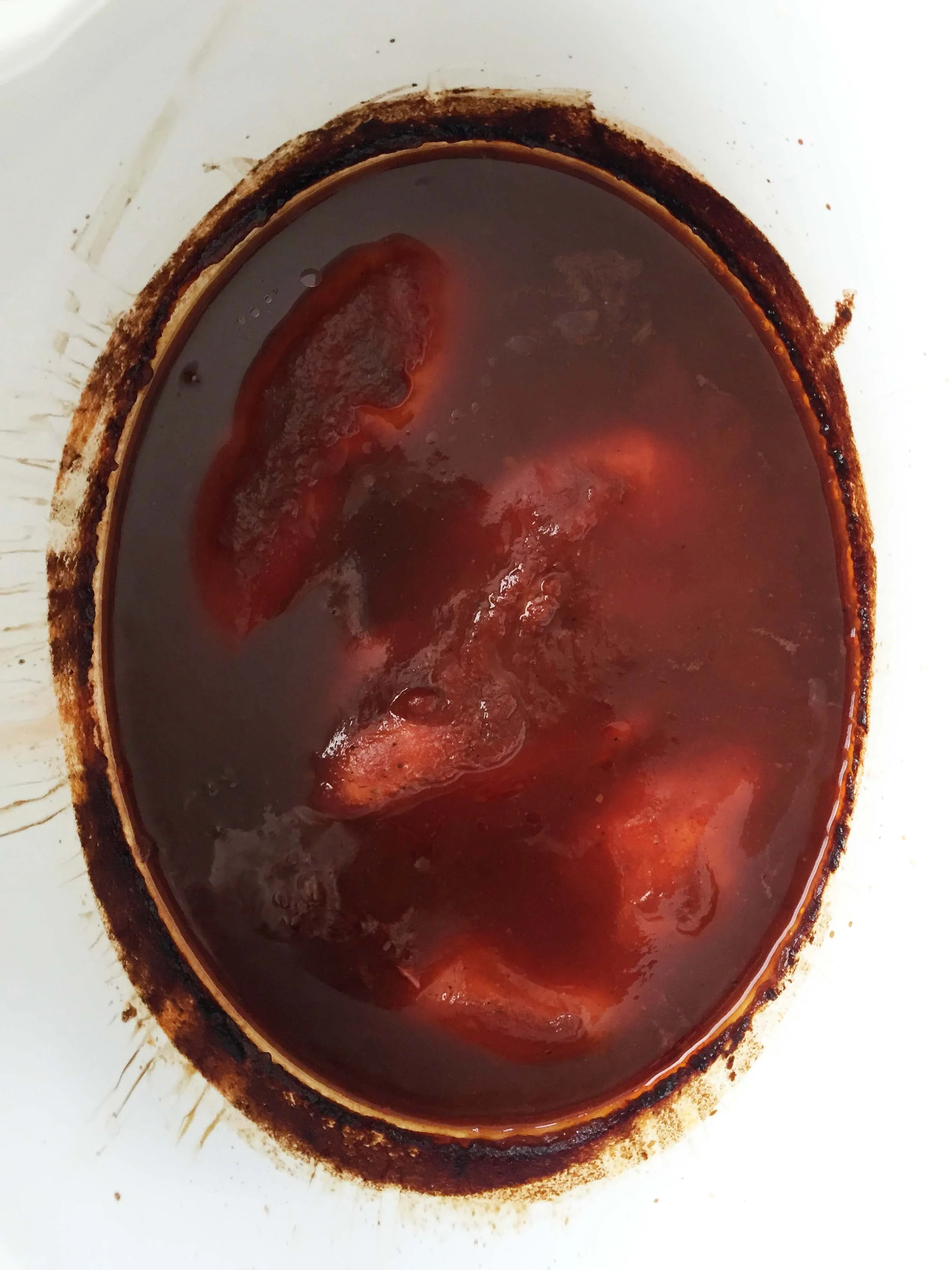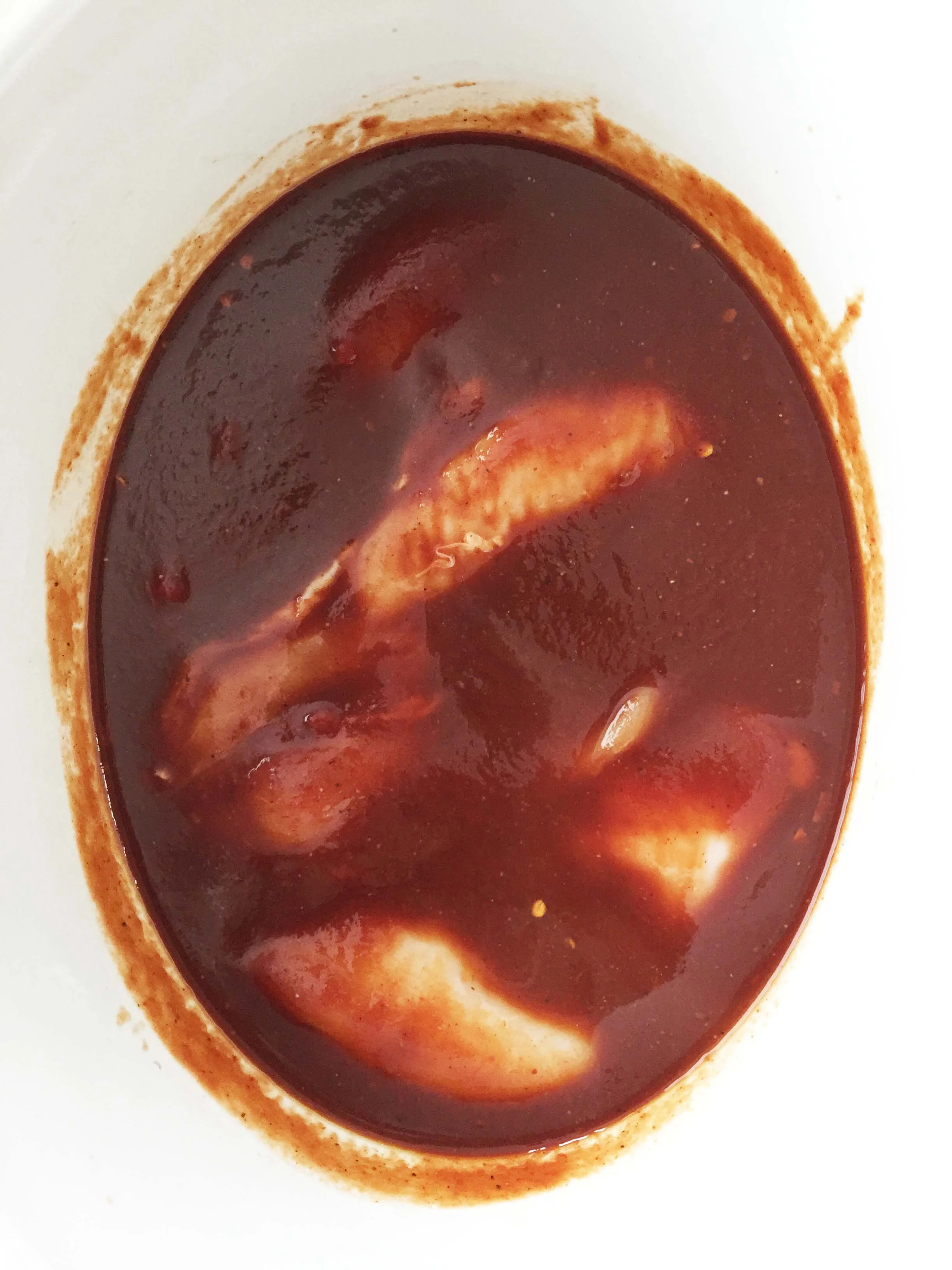 Pour 2 c. of the sauce into the bottom of a crock pot and add in the chicken.