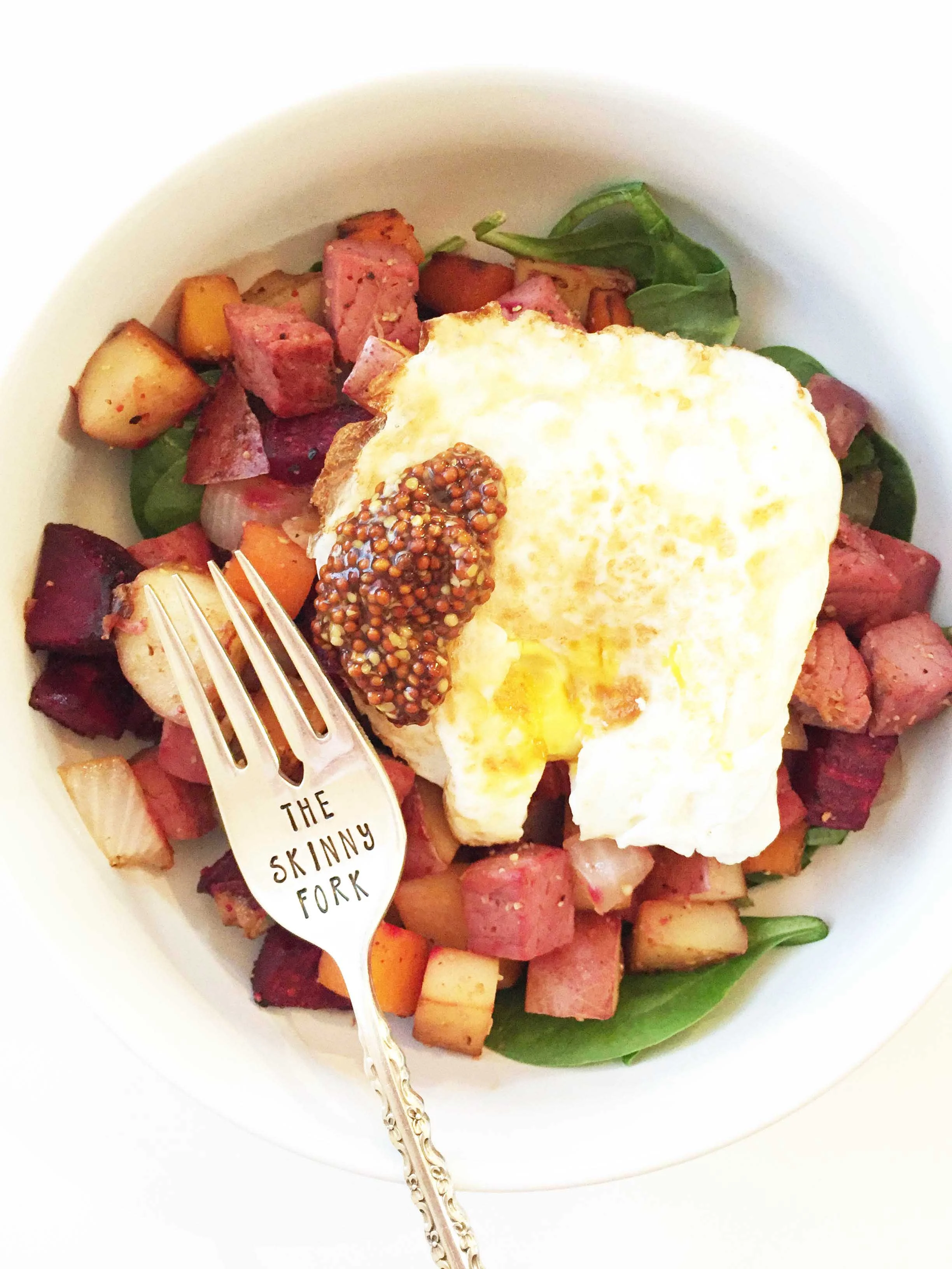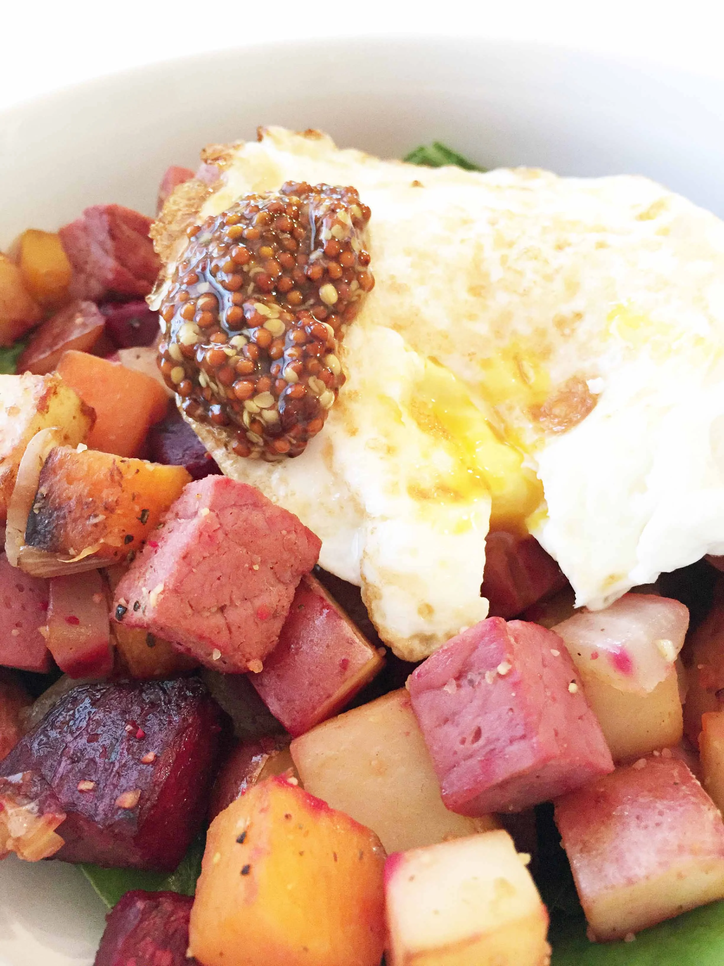 I served my hash over some fresh baby spinach for needed green color and vegetable goodness and also topped it off with an egg and some whole grain mustard.