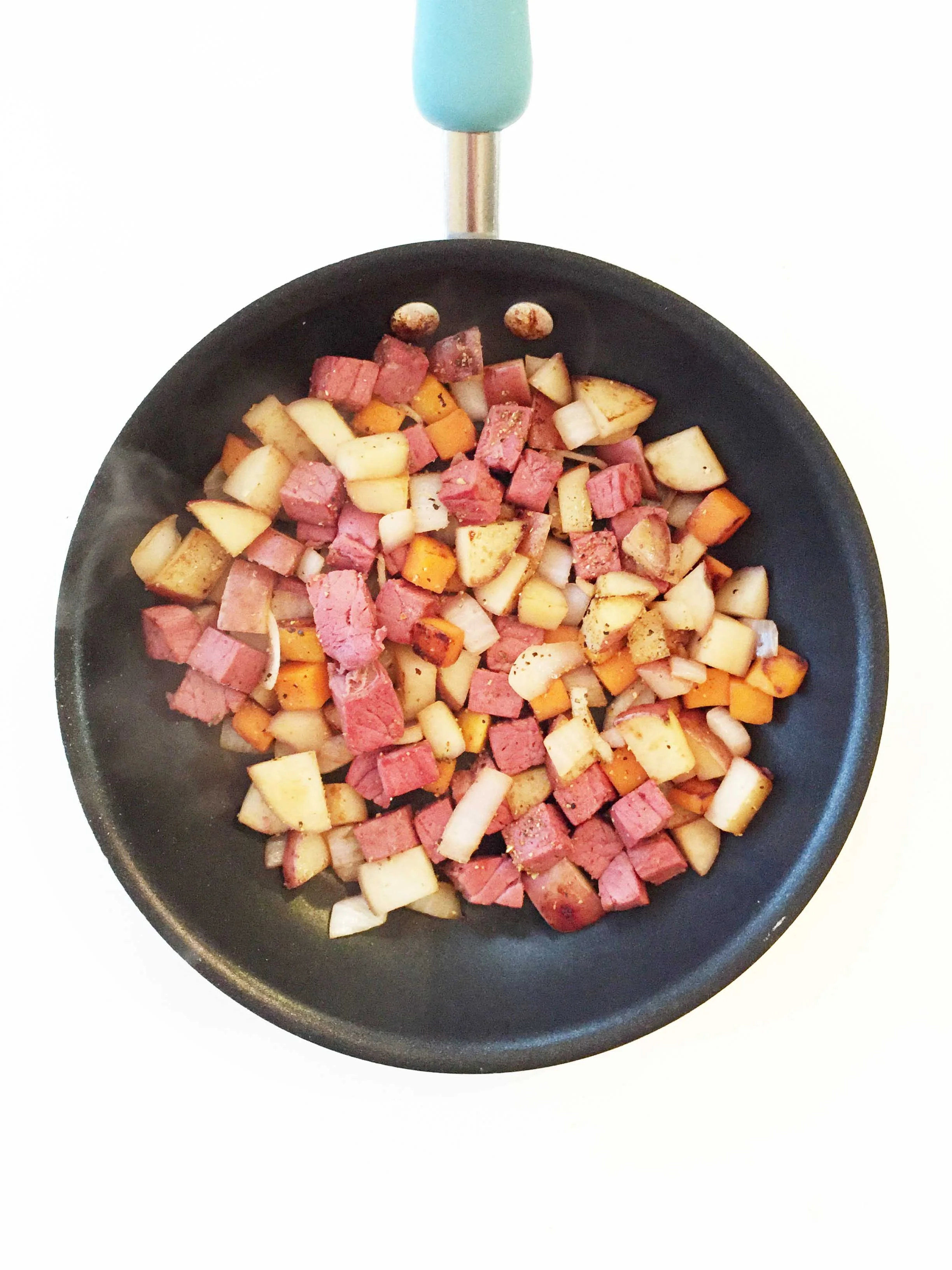 Add in the 6 Oz. Cooked Corned Beef, 2 Small Red Potatoes, 1/4 C. Butternut Squash, and 1/4 Medium White Onion; cook until the vegetables are starting to become tender, about 5 minutes.