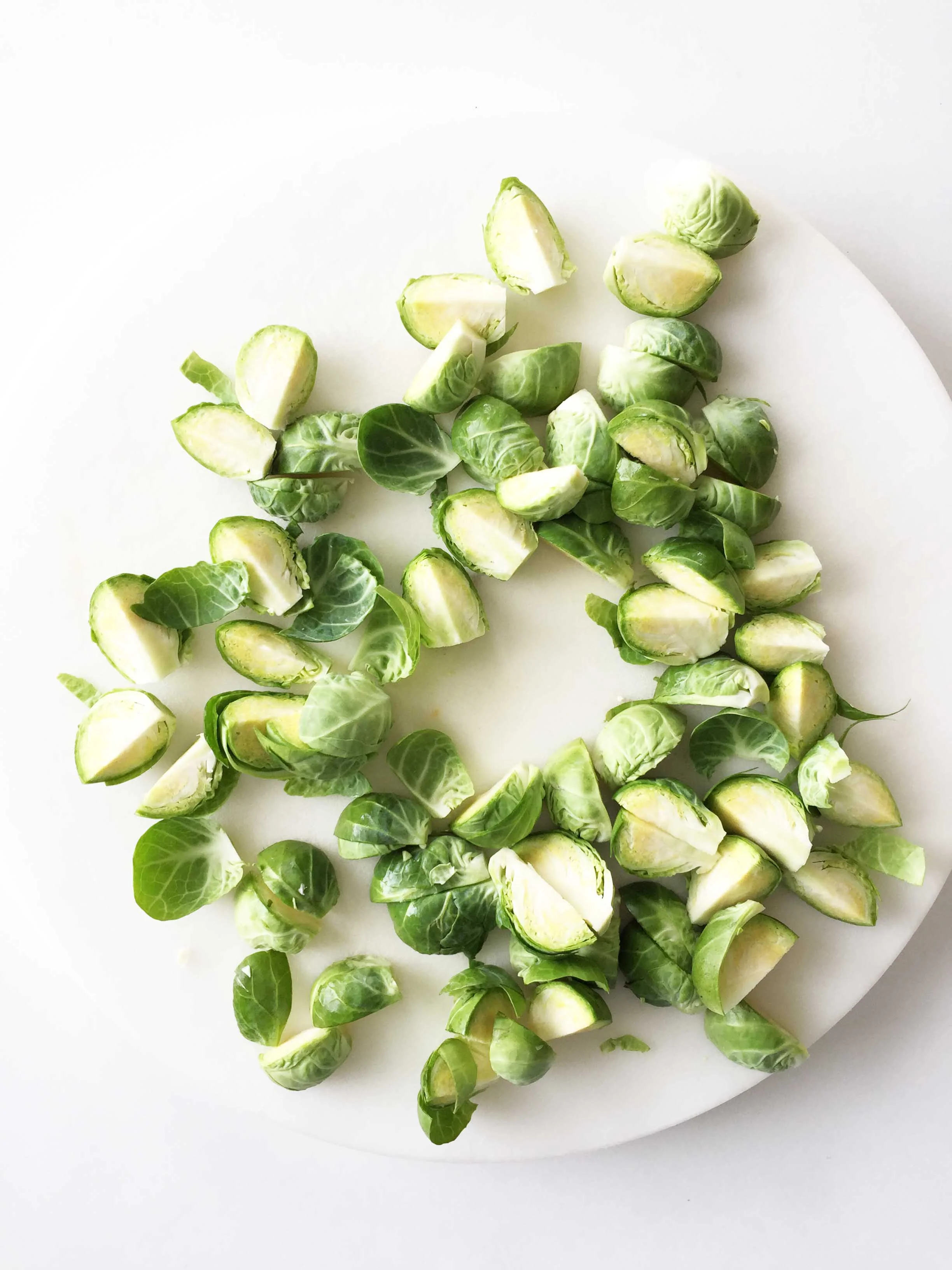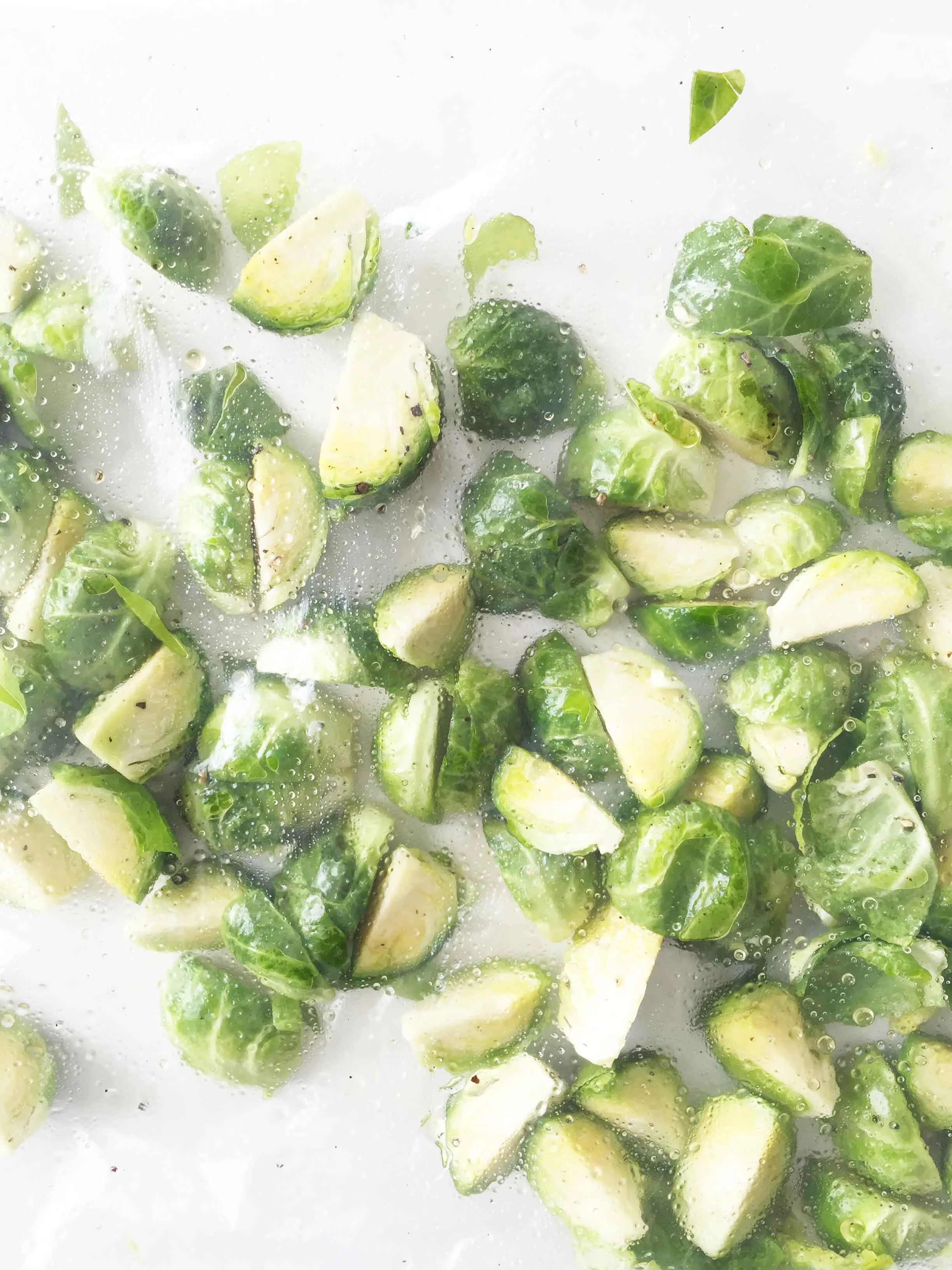 Rinse the brussel sprouts, cut the rough white end off and quarter them.