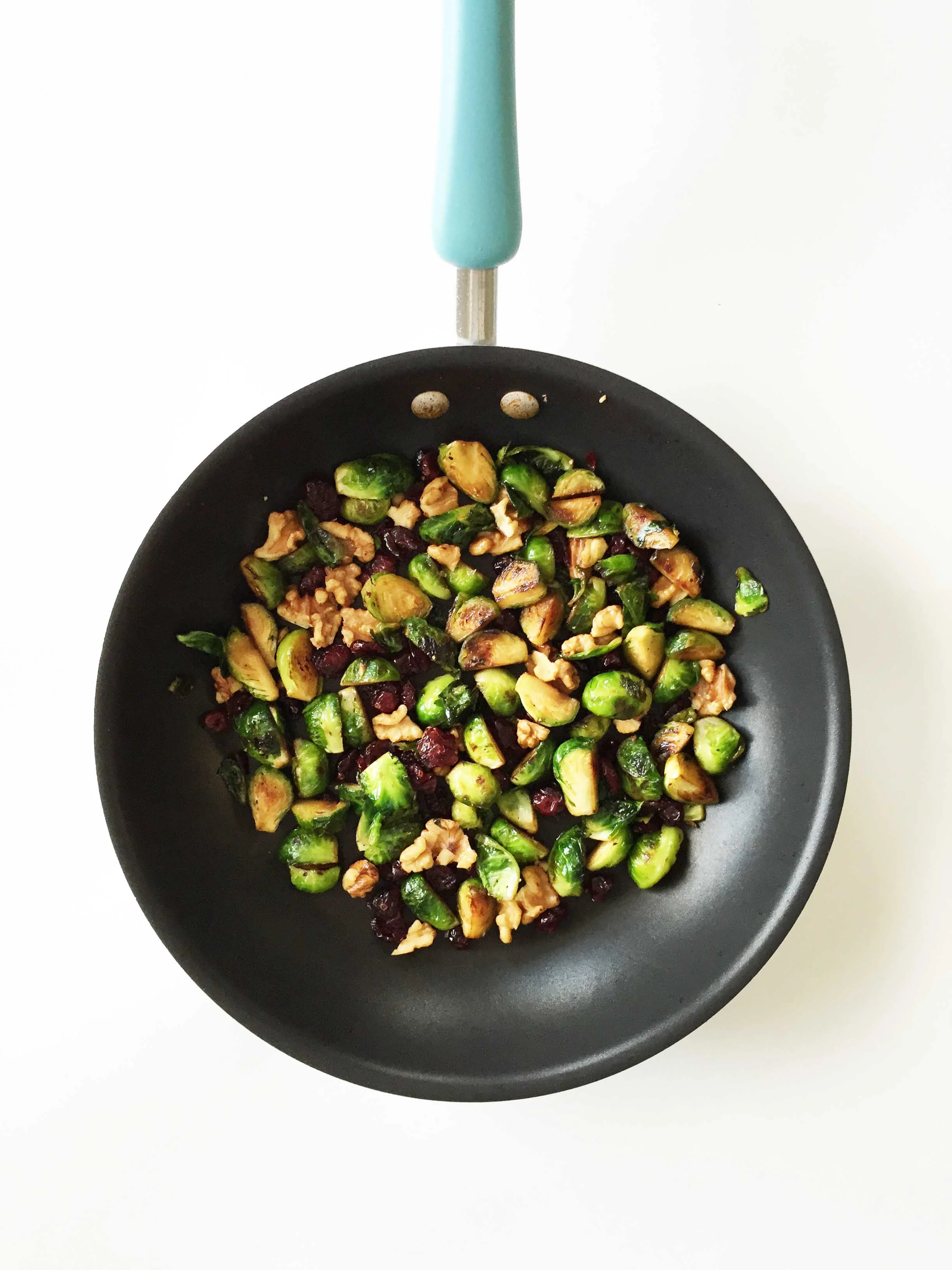 Add in the walnuts and cranberries and reduce heat to medium. Continue to cook for another few minutes until the walnuts begin to become fragrant.