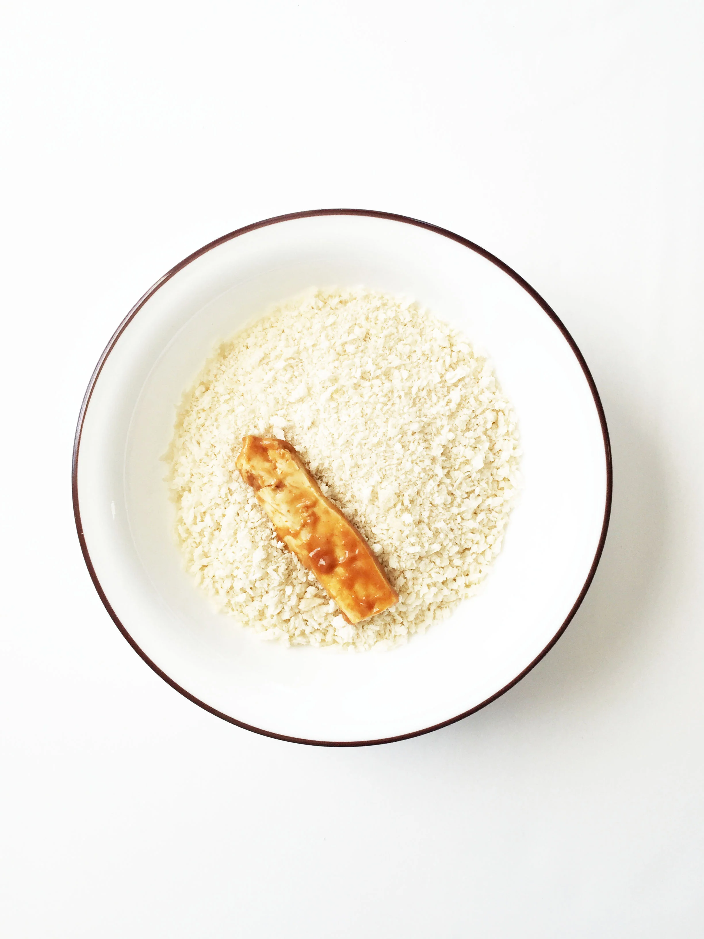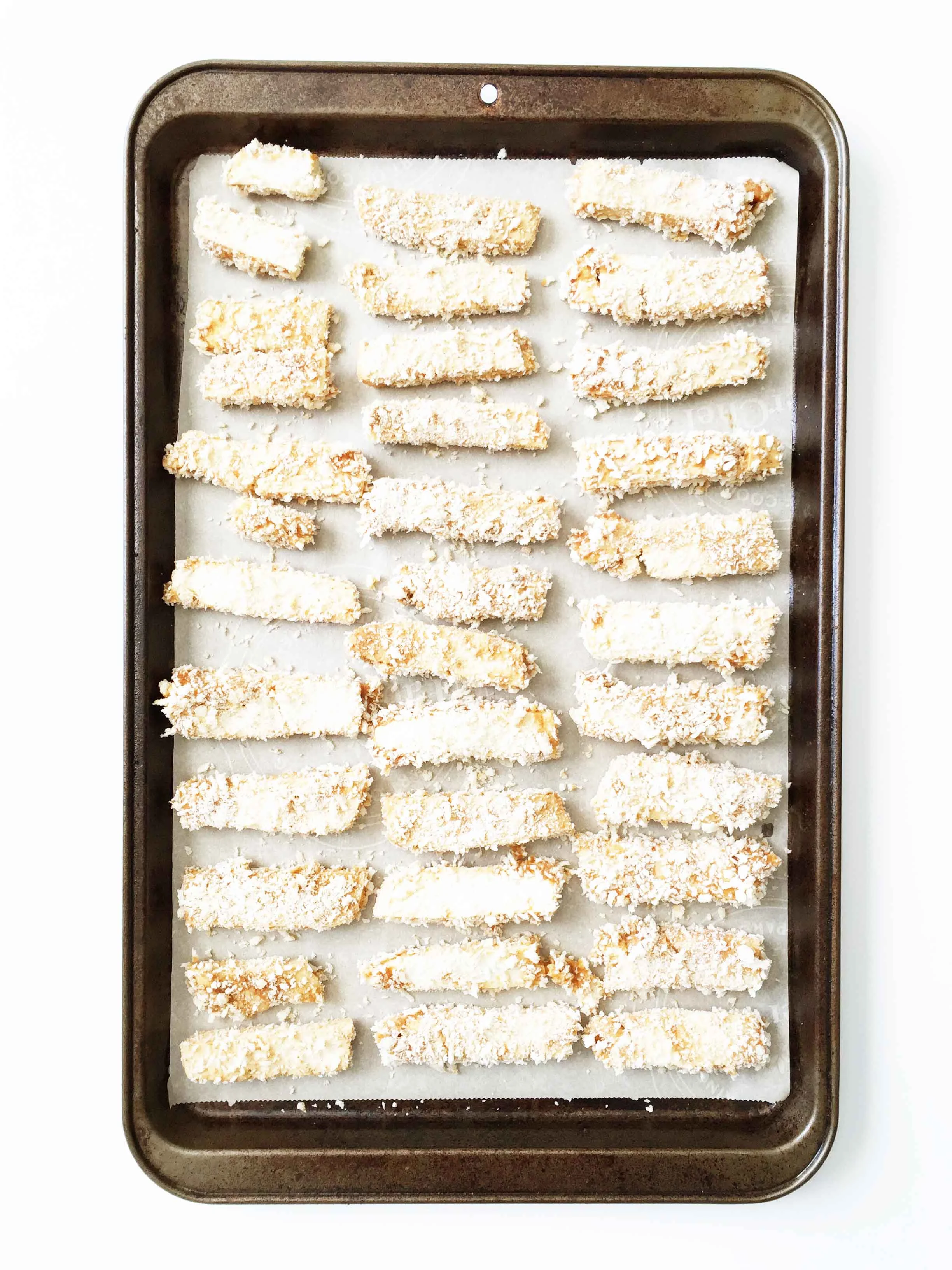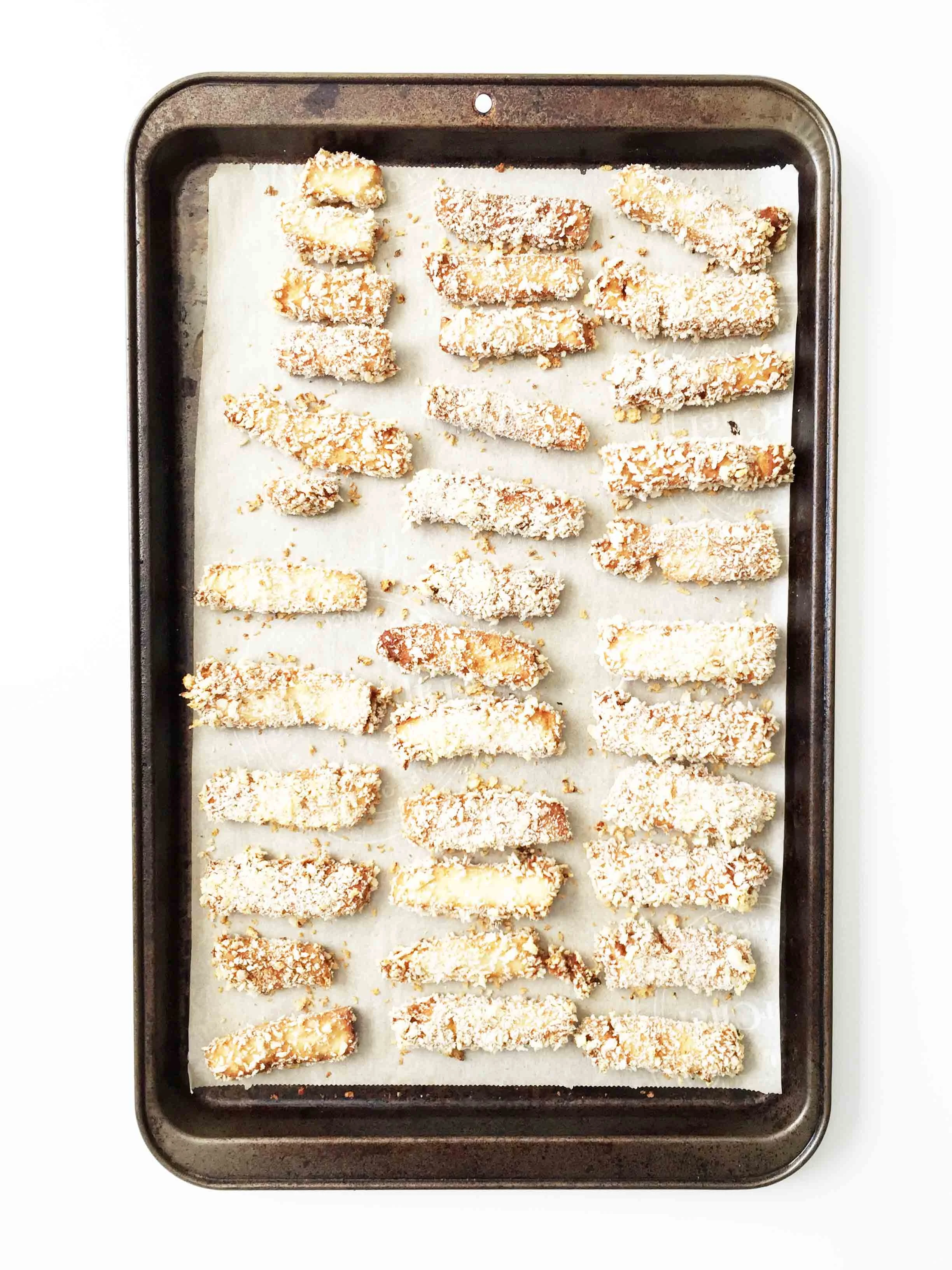 Pour the panko out into a bowl and press each tofu fry into the panko to crust all sides evenly; line them on one of the prepared baking sheets.