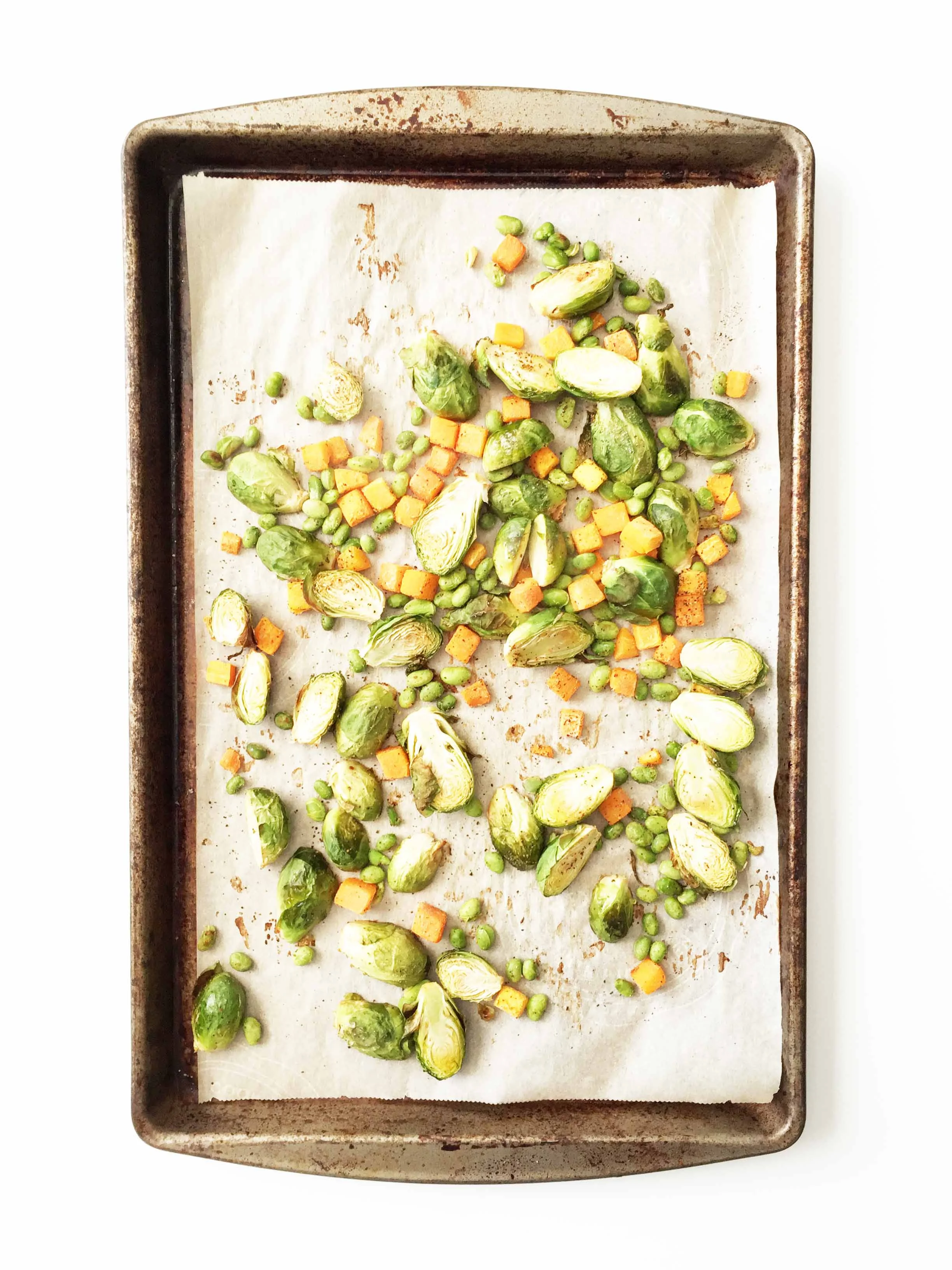 On the second prepared baking sheet, mix together the brussels sprouts, butternut squash, edamame, and the 1/2 tsp. seasoning.