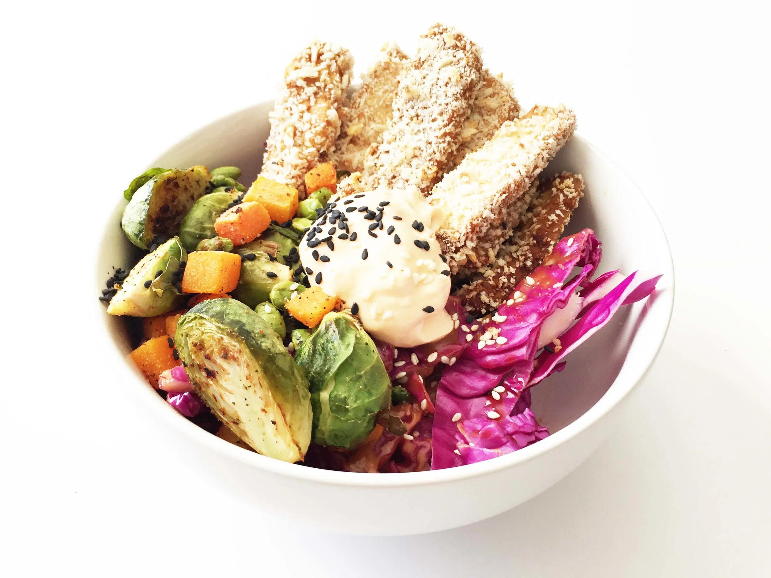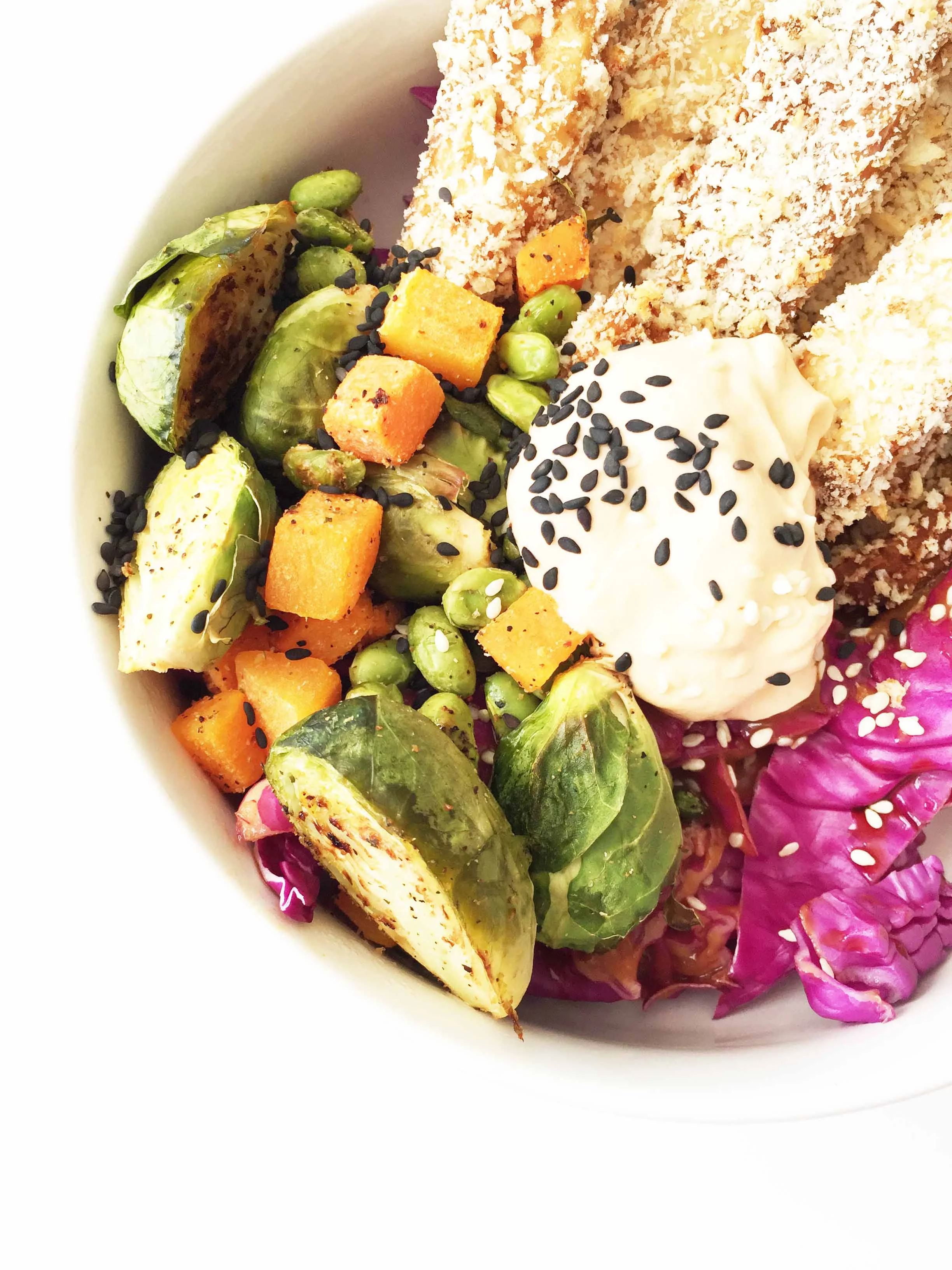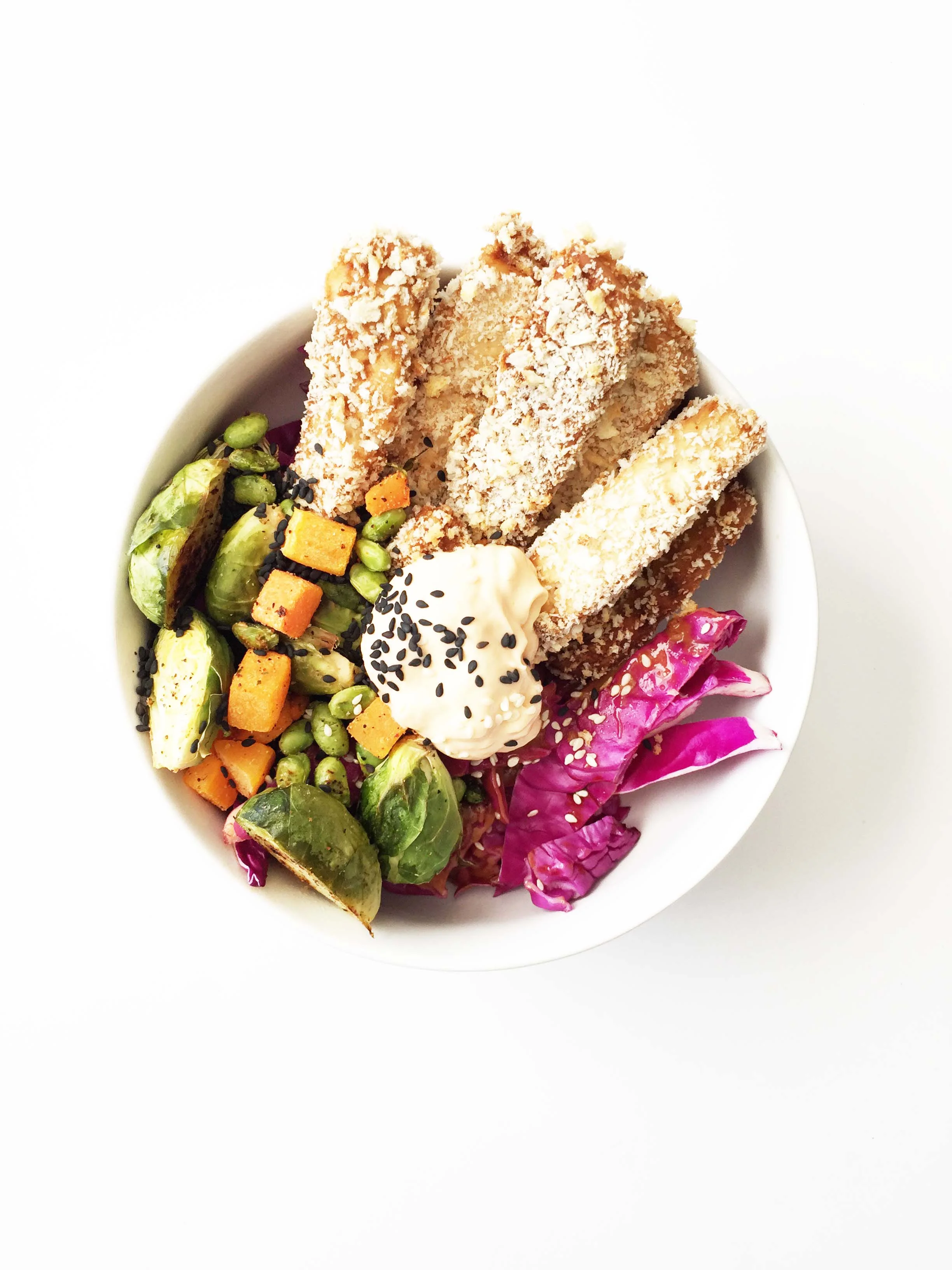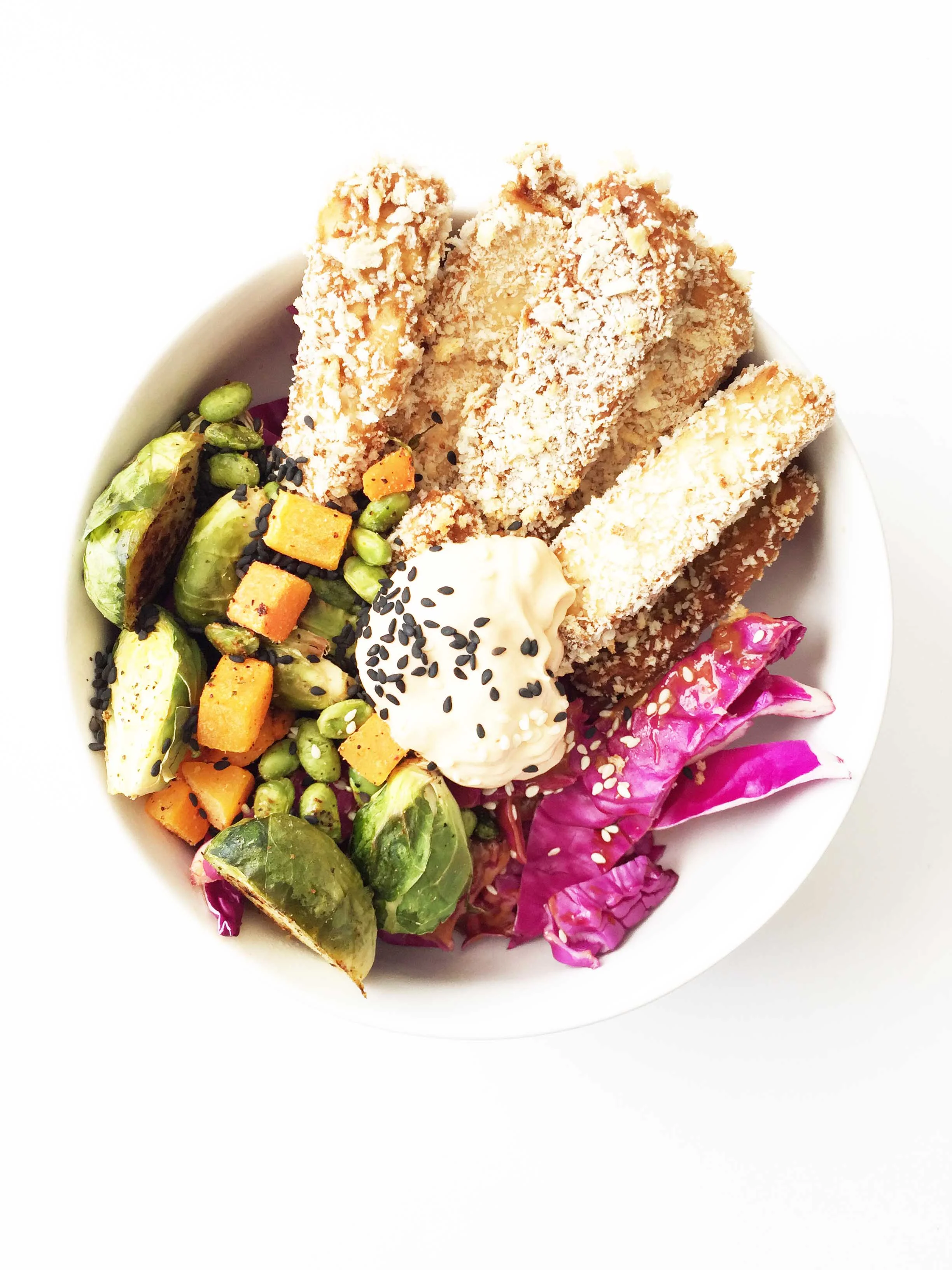 This Buddha bowl (or Hippie Bowl) has a base of purple cabbage, it's layered on top with roasted vegetables (brussels sprouts, butternut squash, and edamame) and crispy tofu fries that were paired with a perfectly spiced Skinny Sriracha Aioli - perfect for dipping! It's easy to make too! With just two baking sheets and the oven doing almost all of the work for you.