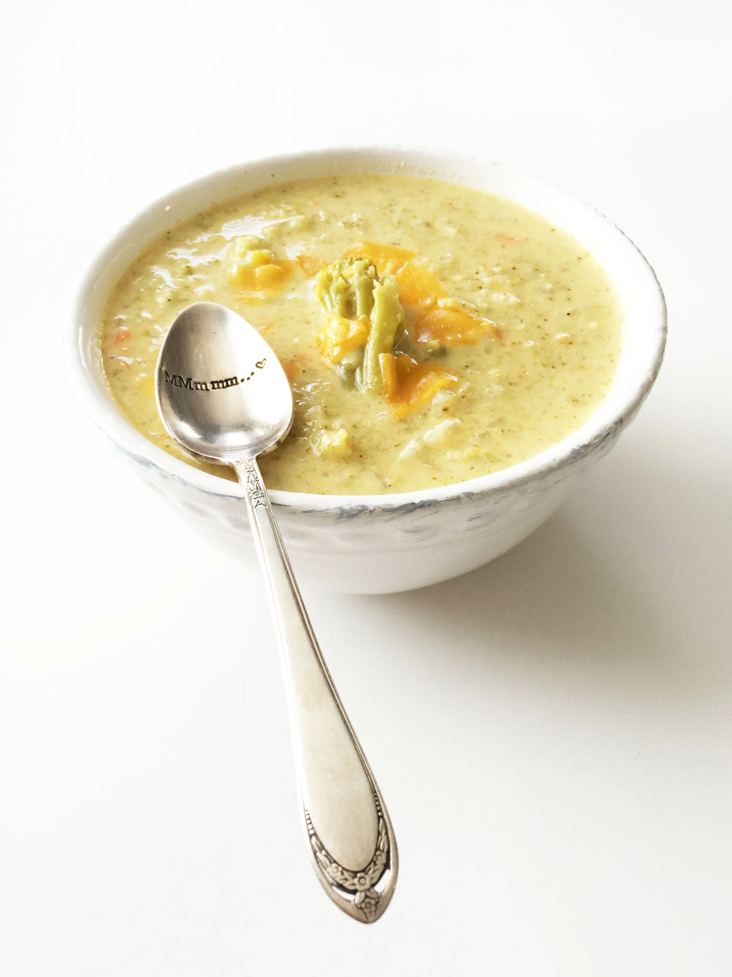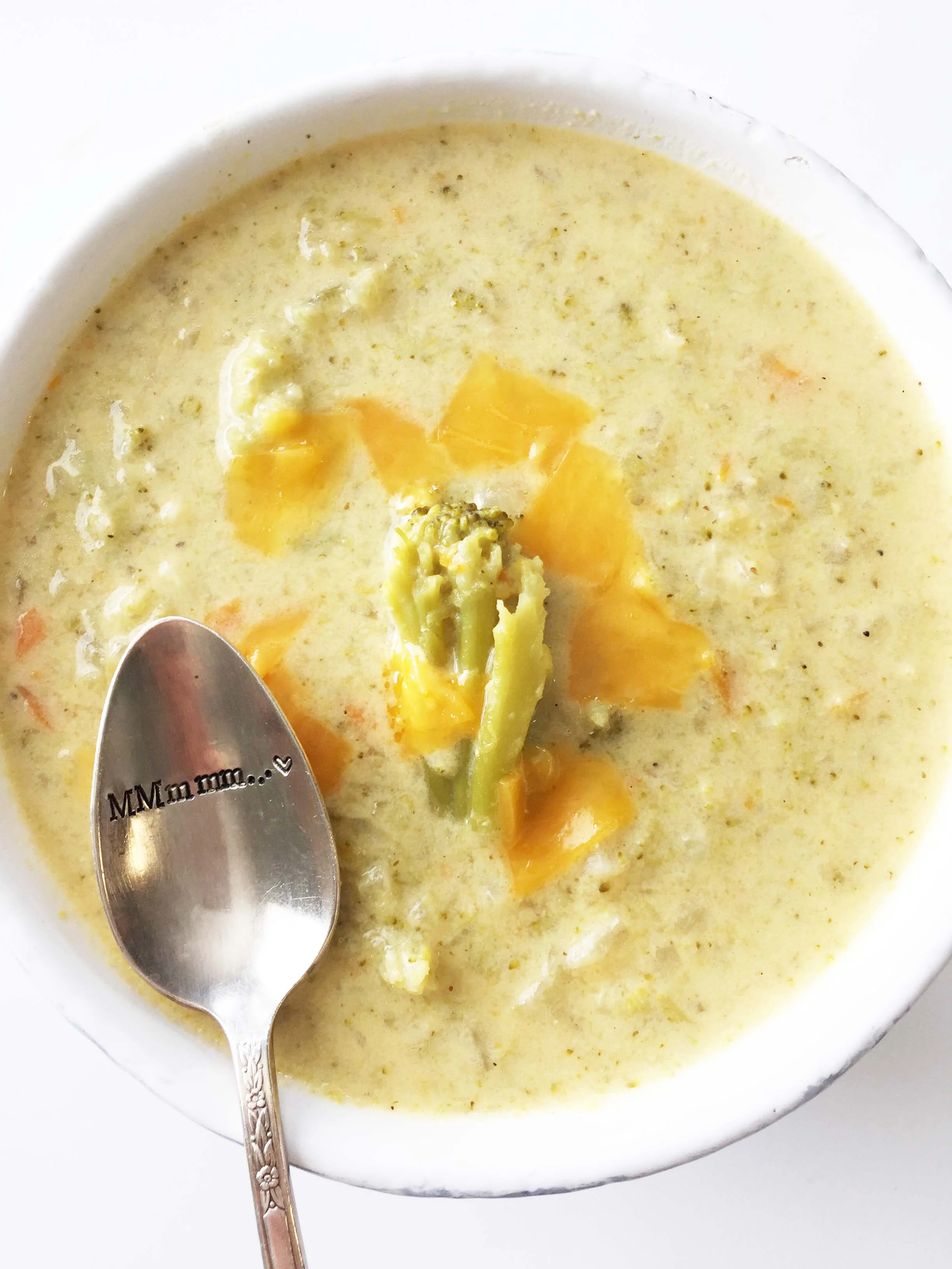 What puts you more in the mood for fall than a nice warm bowl of soup? Not just any soup though, but cheesy wonderful soup! This broccoli cheese soup is comfort food at it's finest. It's so easy to toss together, tastes amazing, and is full of vegetables. That's right, full of vegetables.