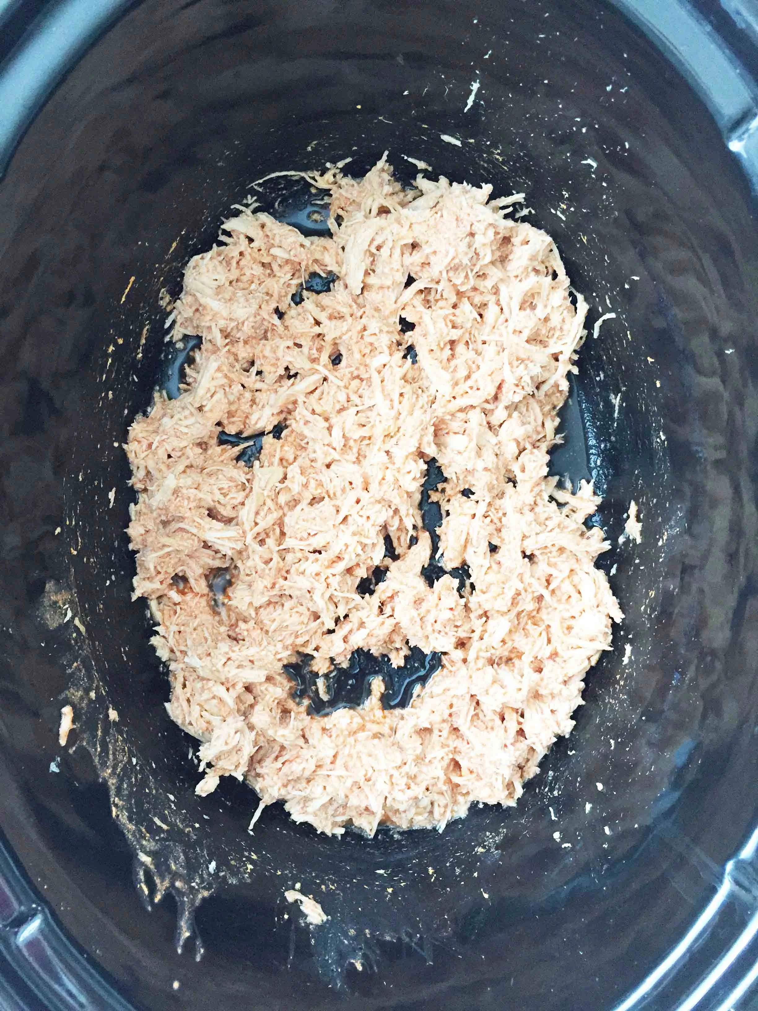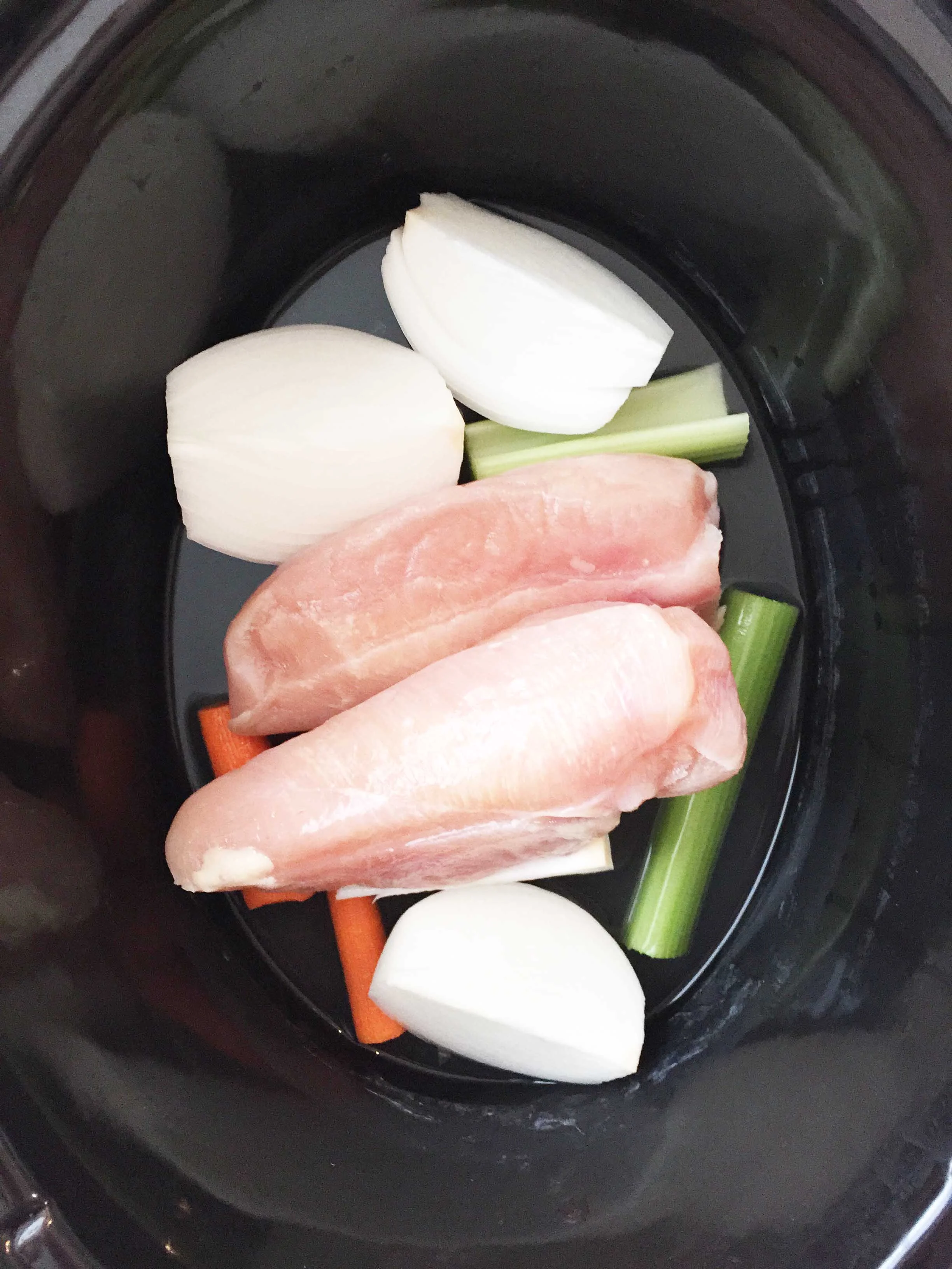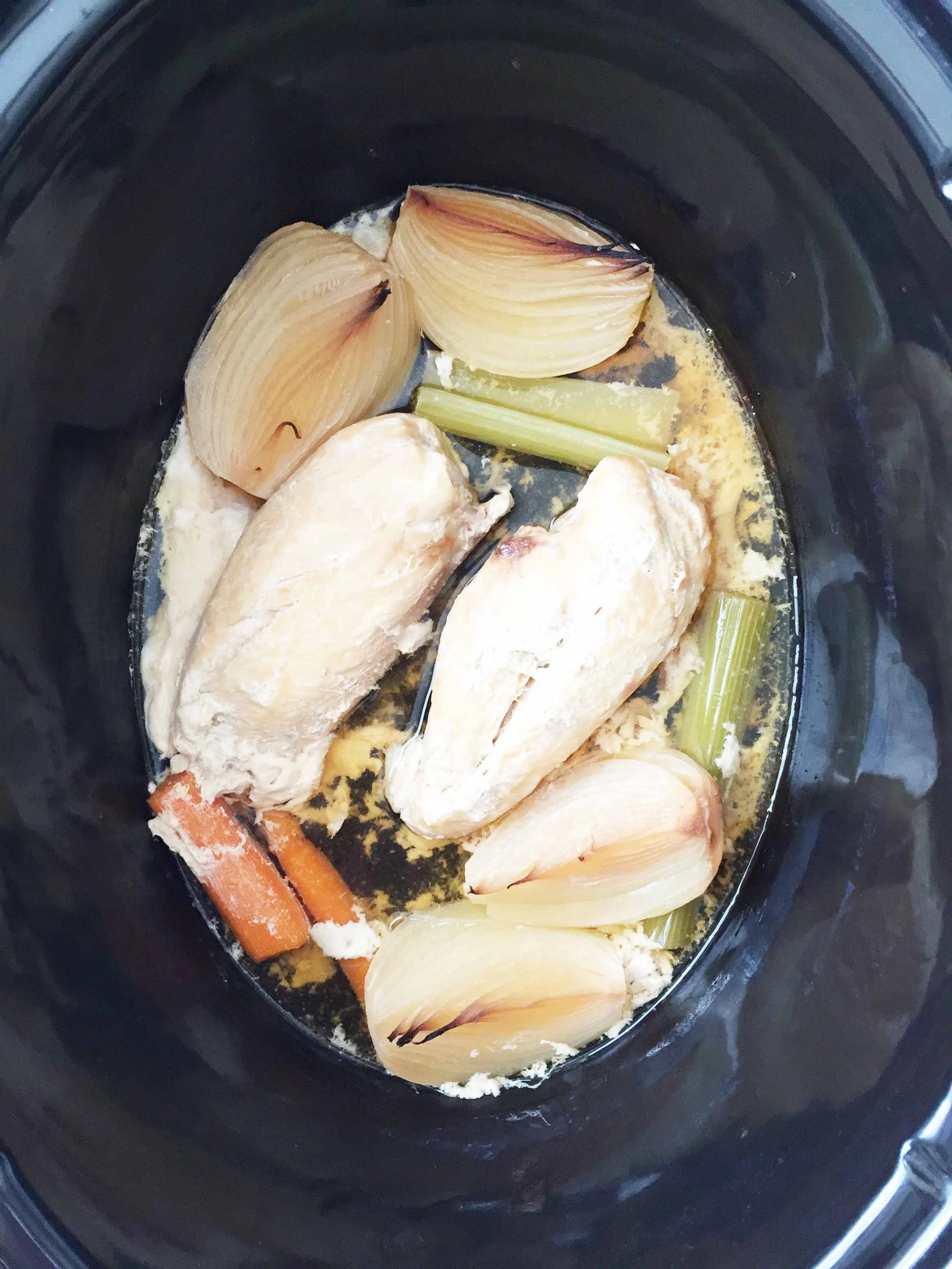 Once done, remove the chicken to shred and discard the remaining items from the crock pot (or use for another use); reserving about 1/2 cup of the chicken broth.