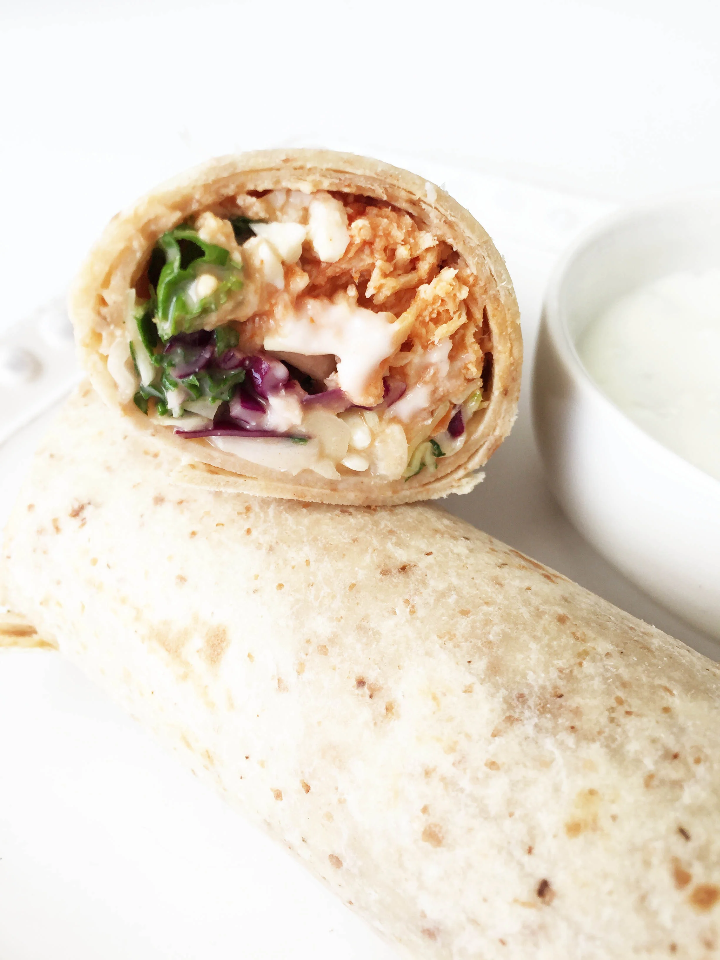 The wrap here was super easy, using the buffalo chicken, some chopped greens, cabbage and veggies along with added buffalo sauce and a super light greek yogurt blue cheese dressing all wrapped up whole wheat (80 calorie) tortilla. Portable, easy, and delicious!