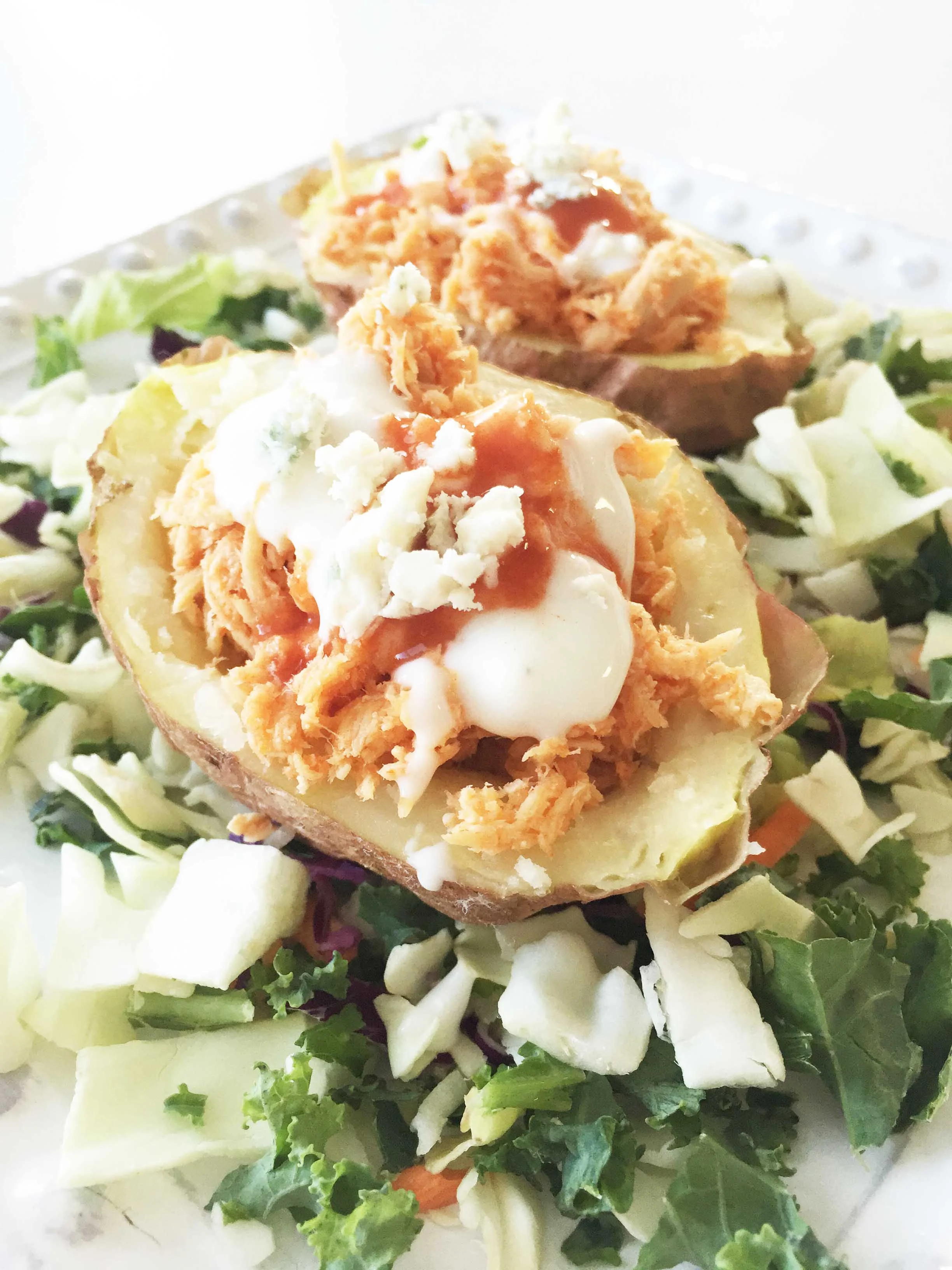 For my buffalo chicken potato skins I used some cooked red potatoes, stuffed them with the buffalo chicken and topped with more buffalo sauce, blue cheese dressing, and a few blue cheese crumbles; all served over some chopped salad. Yum!