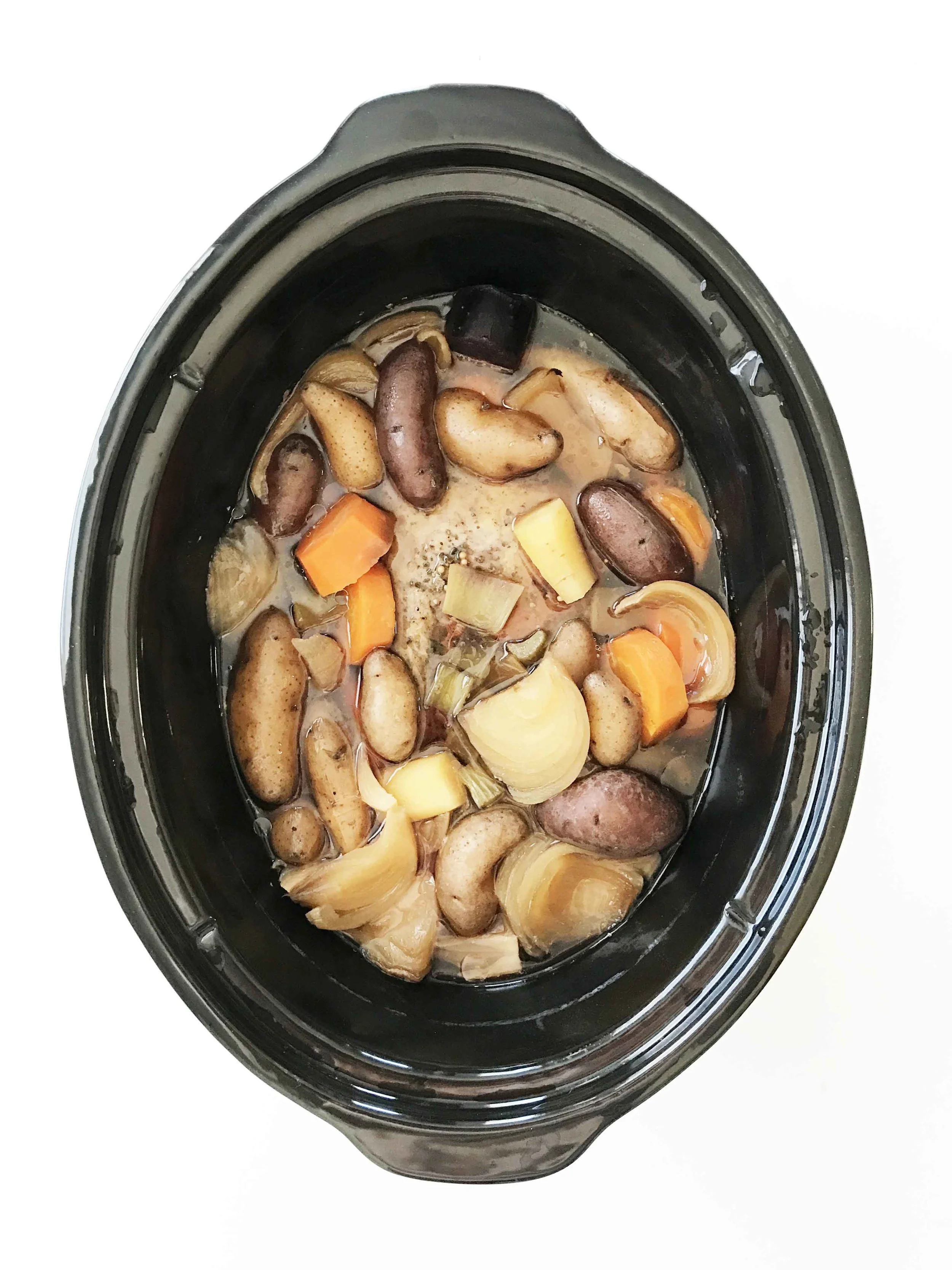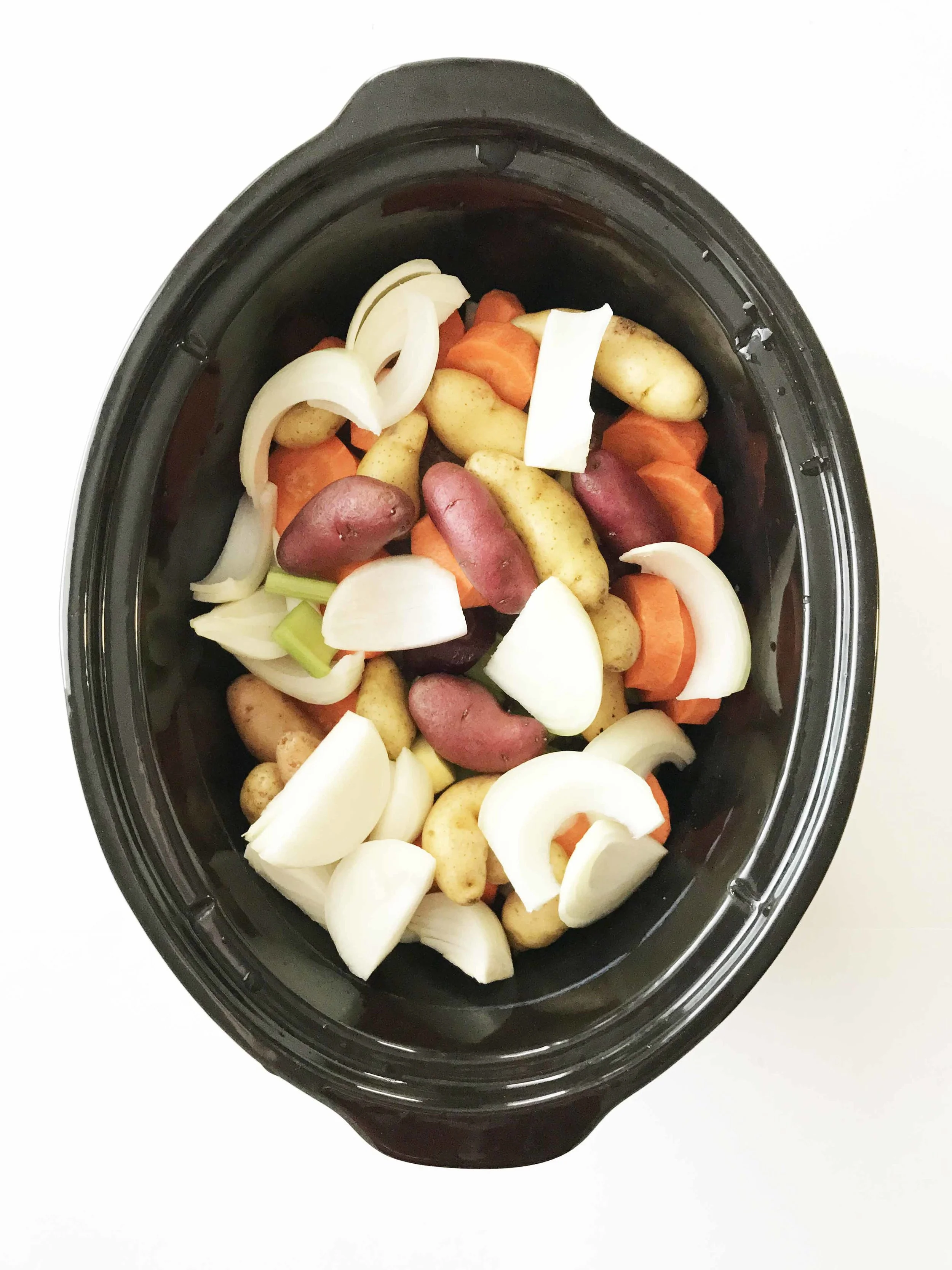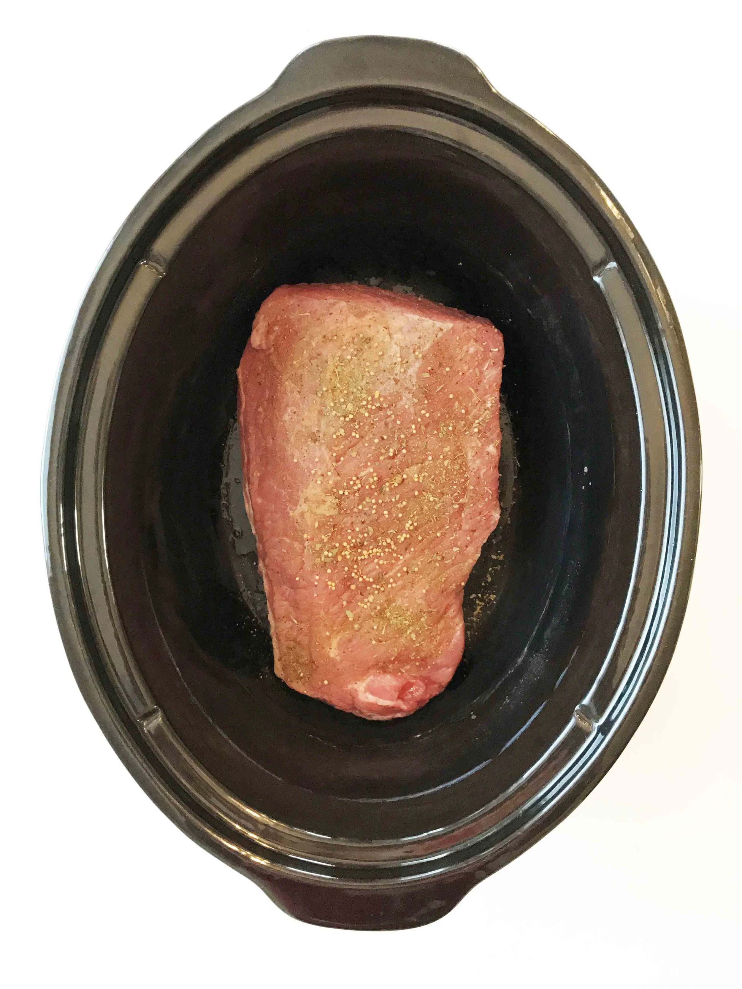 The thing I like most about this recipe is that it's basically hands free, and with the added water to the slow cooker - the meat doesn't dry out. It stays niiice and moist while taking on the flavors of the seasoning and vegetables that cook along with it.