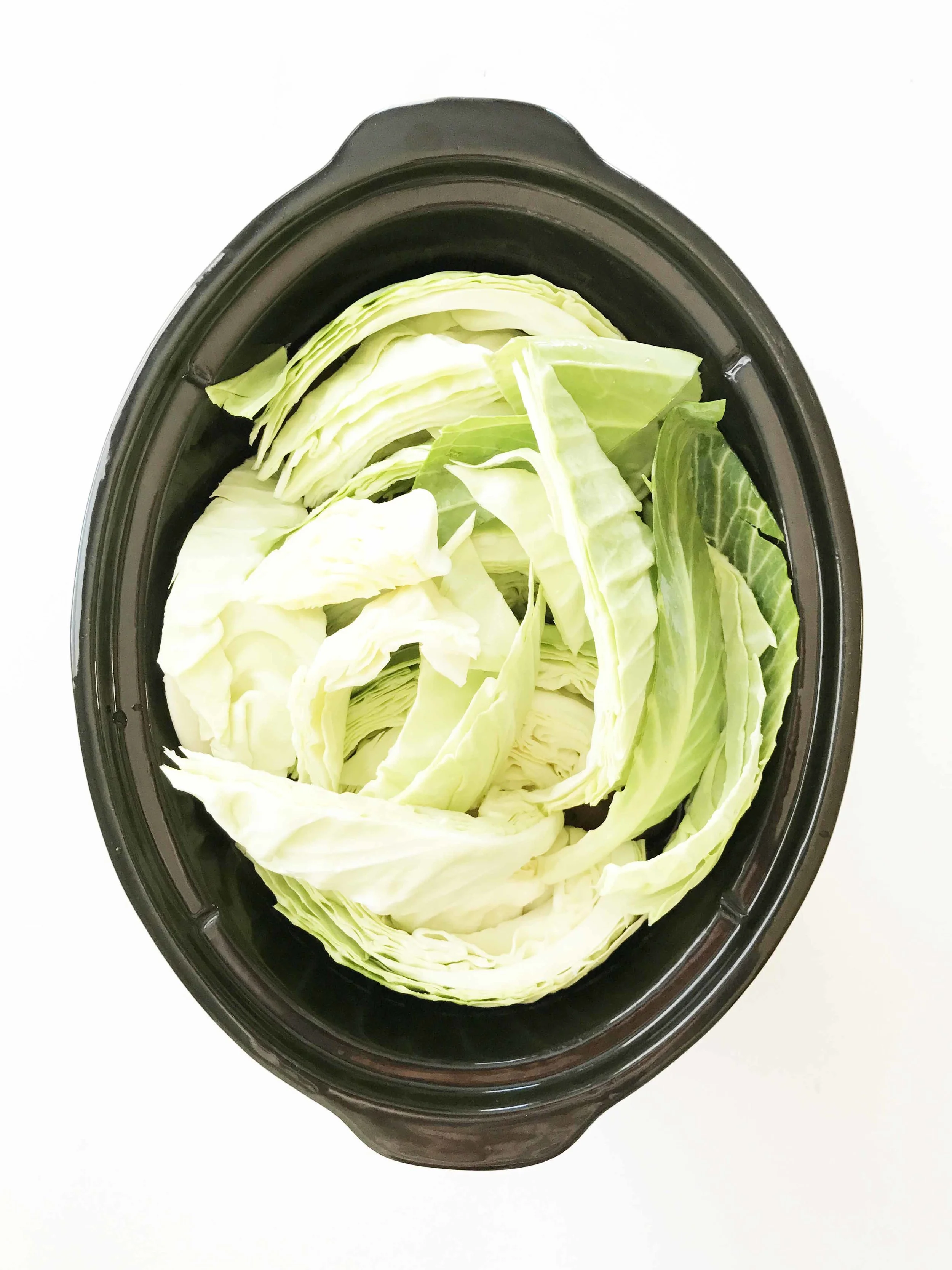 Remove the lid from the slow cooker and place the cabbage over the top of the veggies and brisket. Cover once more and cook for another 45 minutes on high (1 1/2 hours on low.)