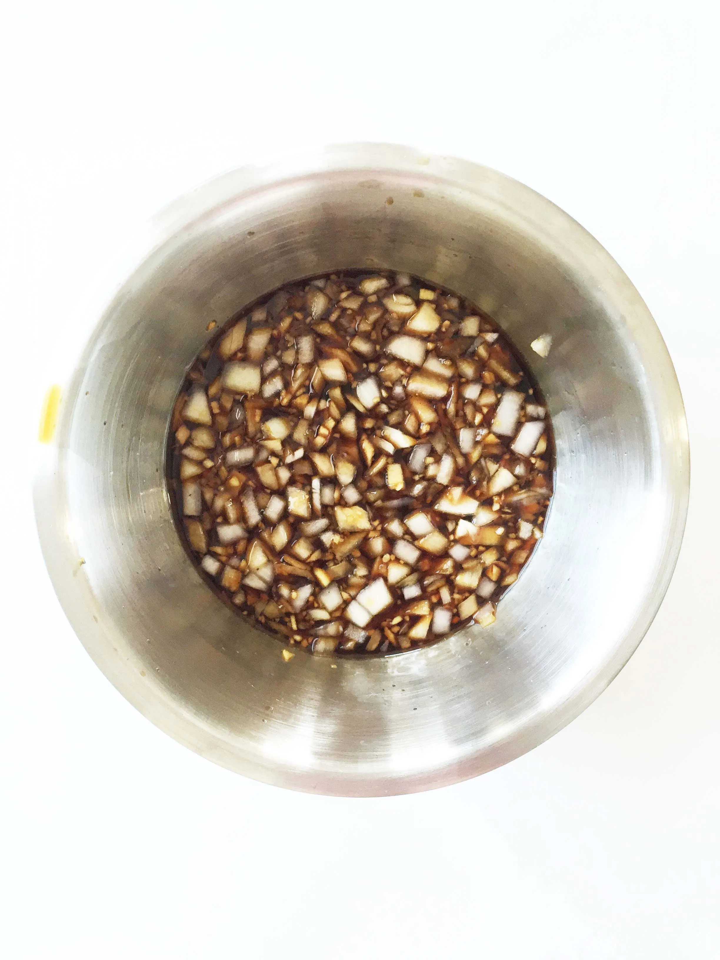 In a medium bowl, whisk together 1/2 C. Onion, 1/2 C. Agave, 1/2 C. Reduced Sodium Soy Sauce, 1/4 C. Rice Wine Vinegar, 2 Garlic Cloves, 1 Tbsp. Fresh Ginger, and a Pinch of Black Pepper.