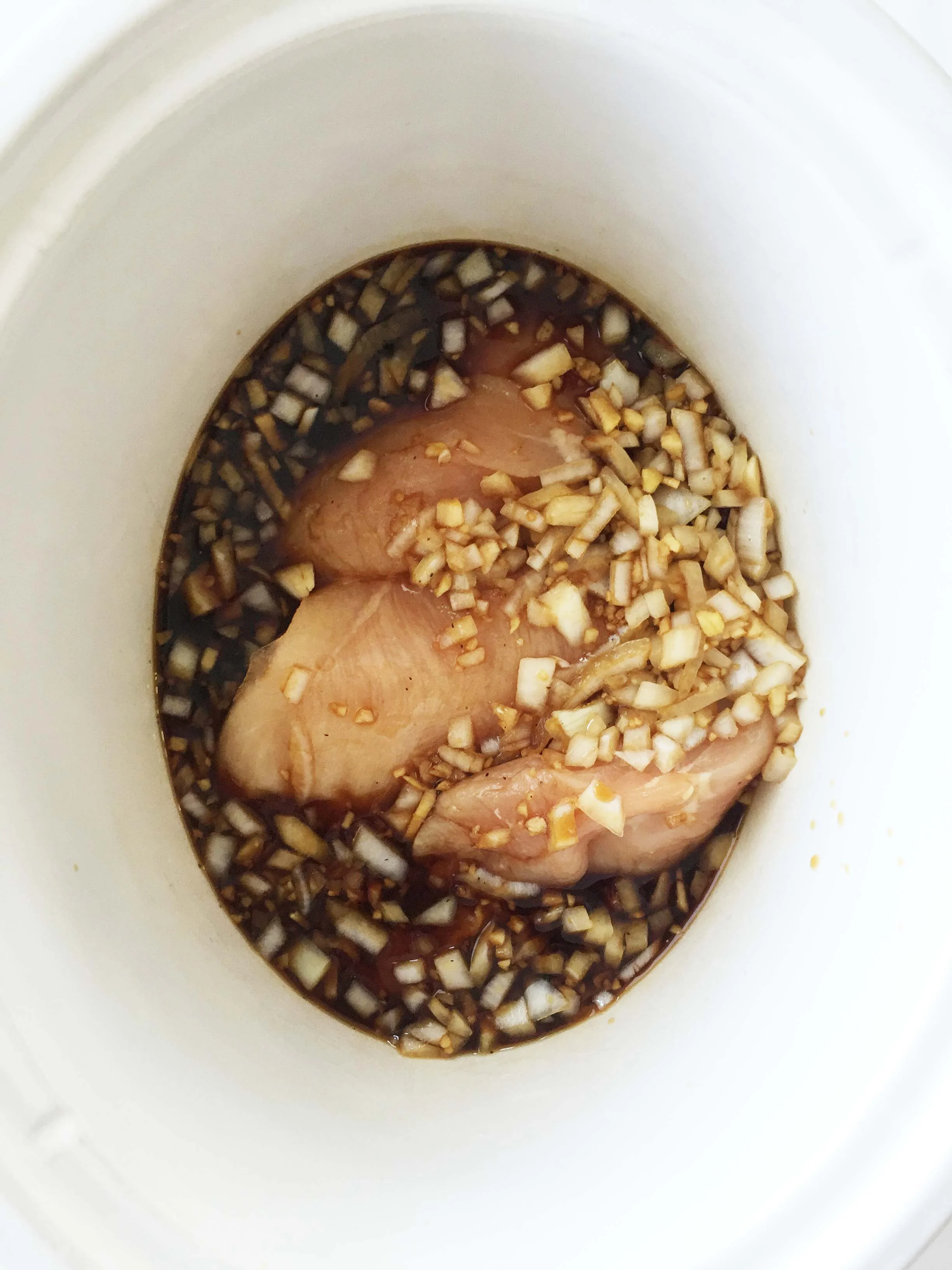 Place the 2 Lbs. chicken into the bottom of the crock pot in a single layer.
