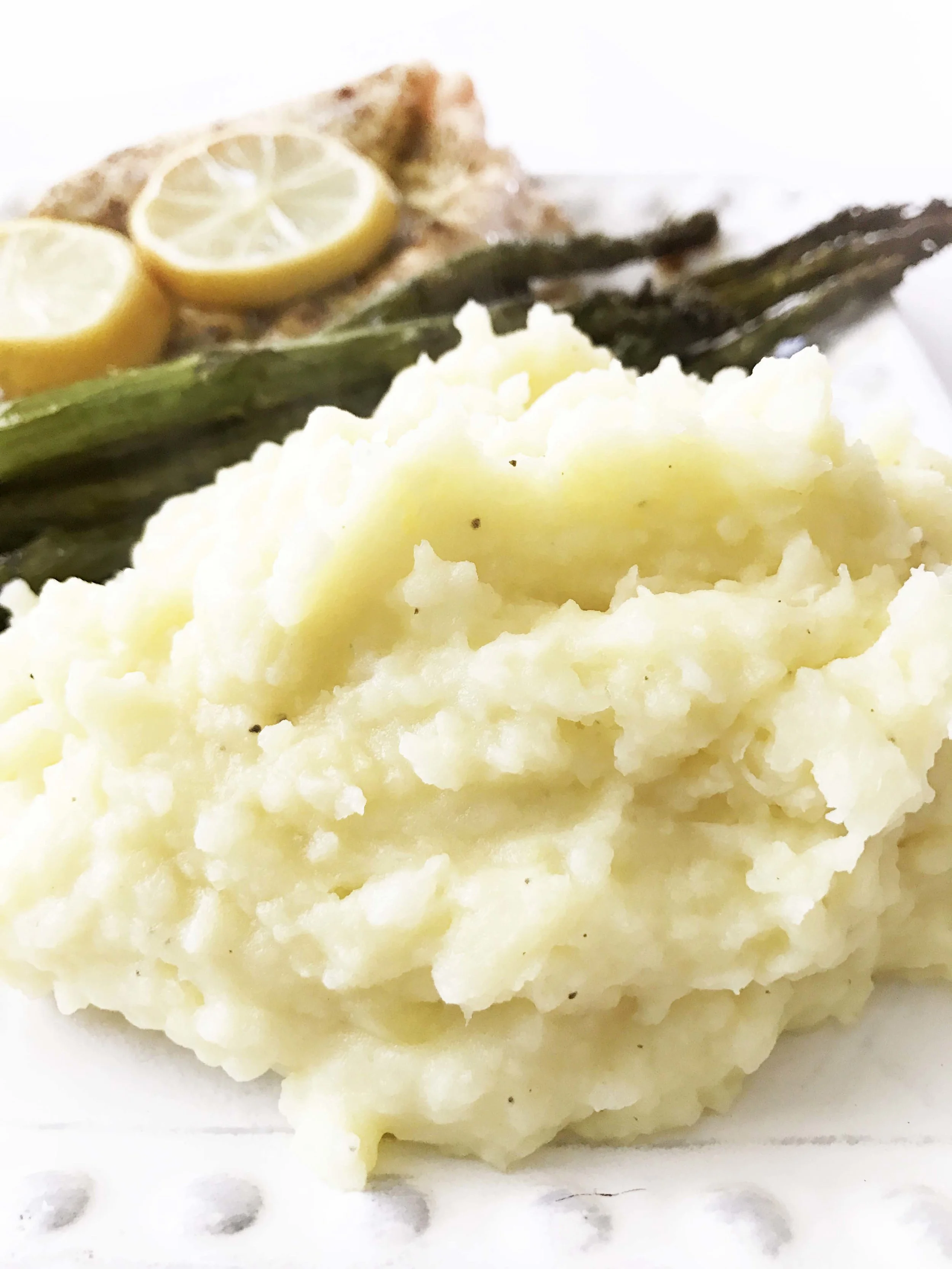 What's better about these mashed potatoes is that I've snuck some cauliflower in there to lighten them up and also give them a little more texture. But, trust me when I say that no one will be the wiser to the sneaky hidden vegetables. I promise. I think almost any time anyone has eaten mashed potatoes at my house, it's always had some amount of cauliflower in it. Hey, every vegetable counts when you have a picky 6 year old.