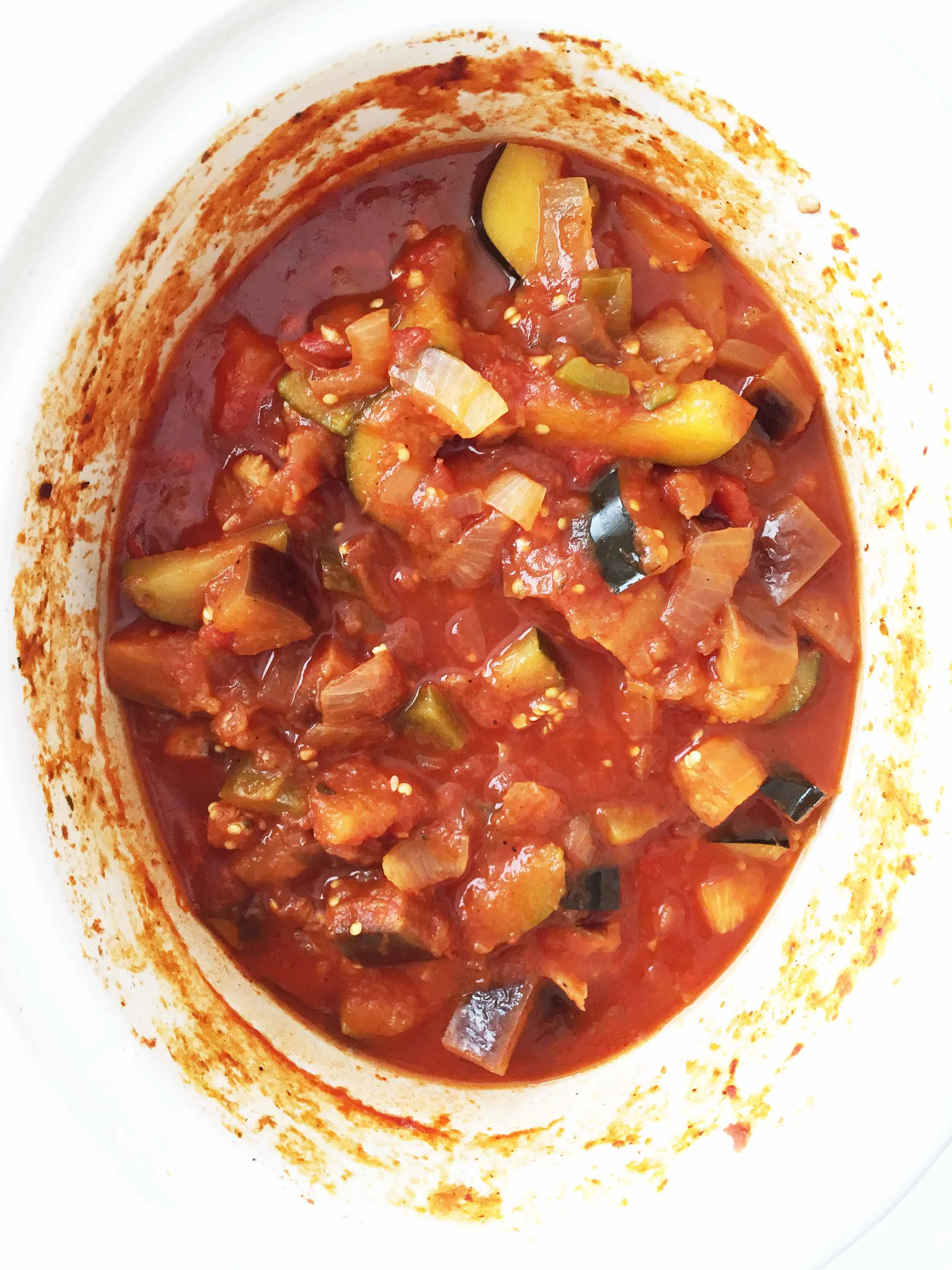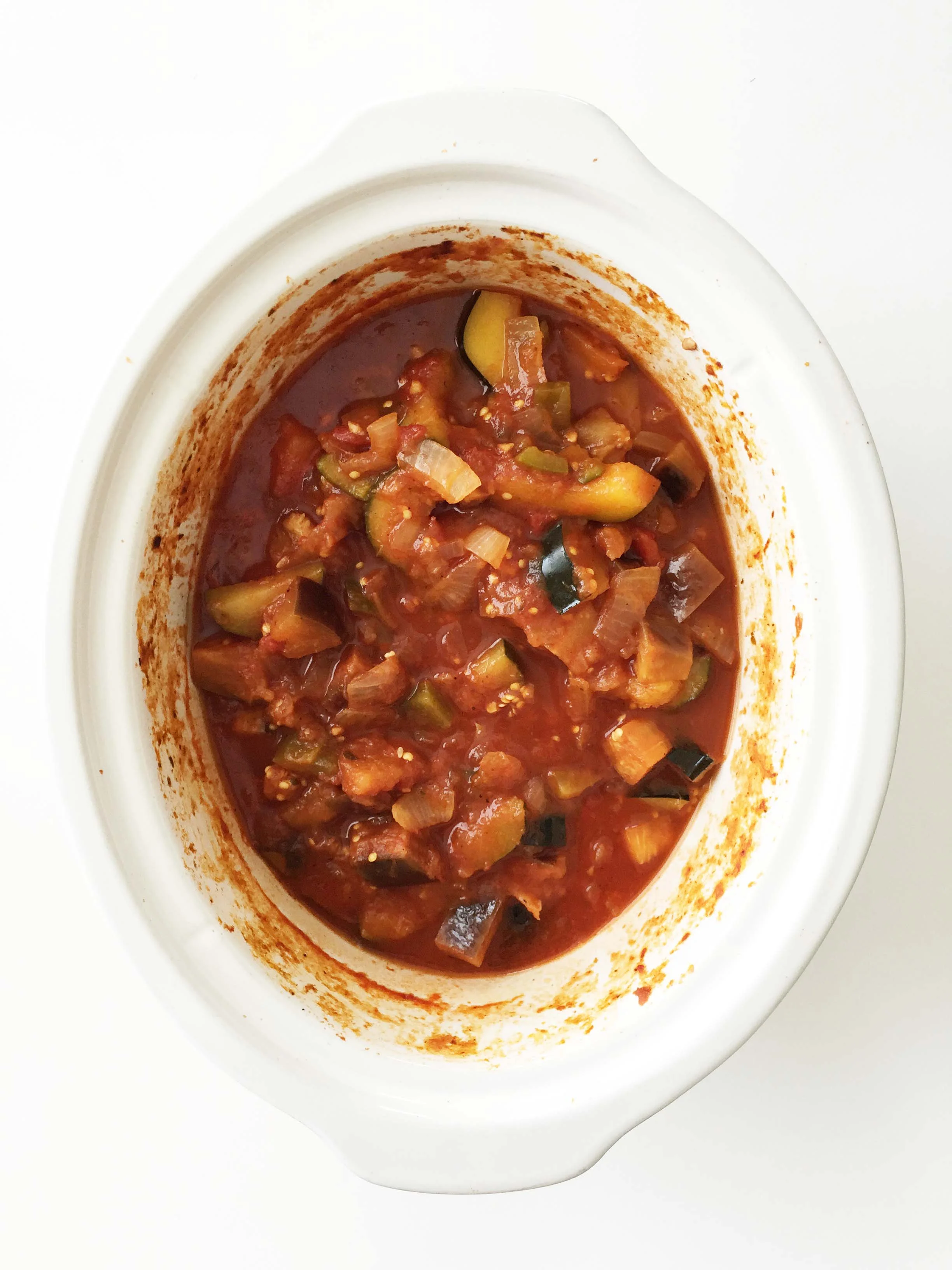 I also wanted to be extra sure that eggplant got cooked, and cooked well because I cannot stand the undercooked texture of an eggplant. To solve that problem, I again made use of my slow cooker. Why not? It's a set it and forget it sort of dish. Easy peasy!