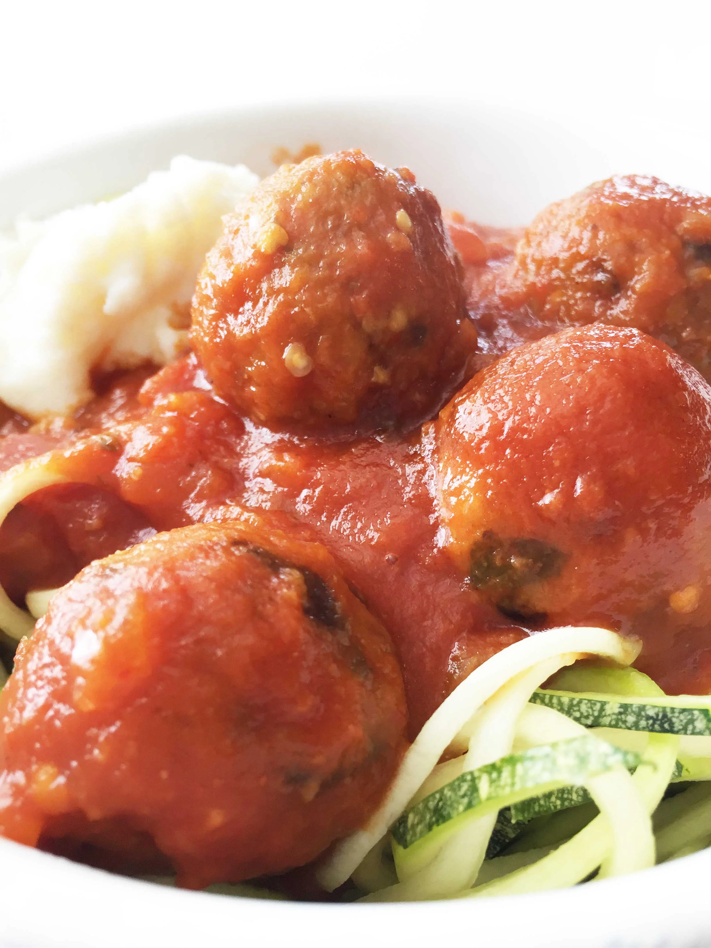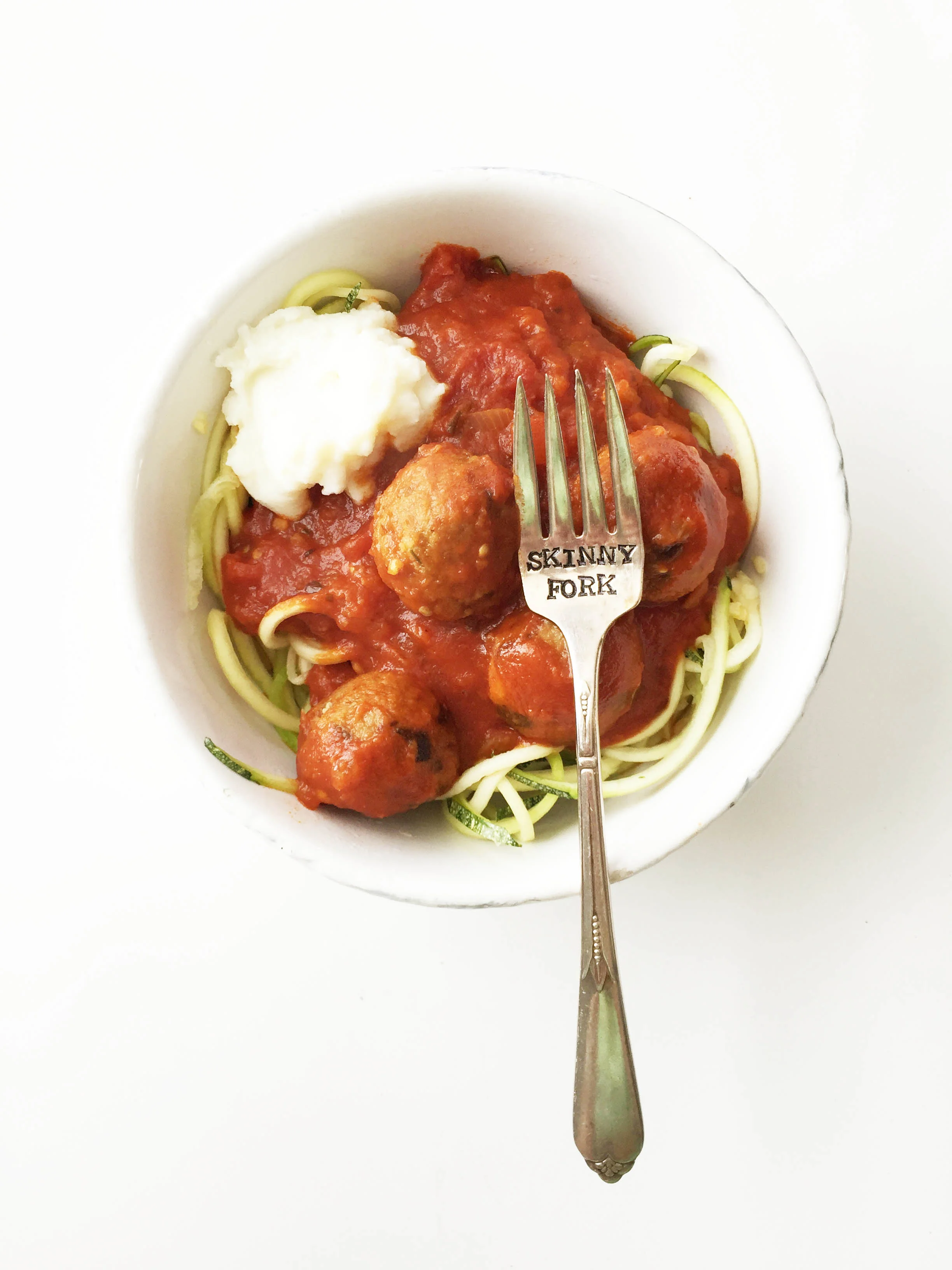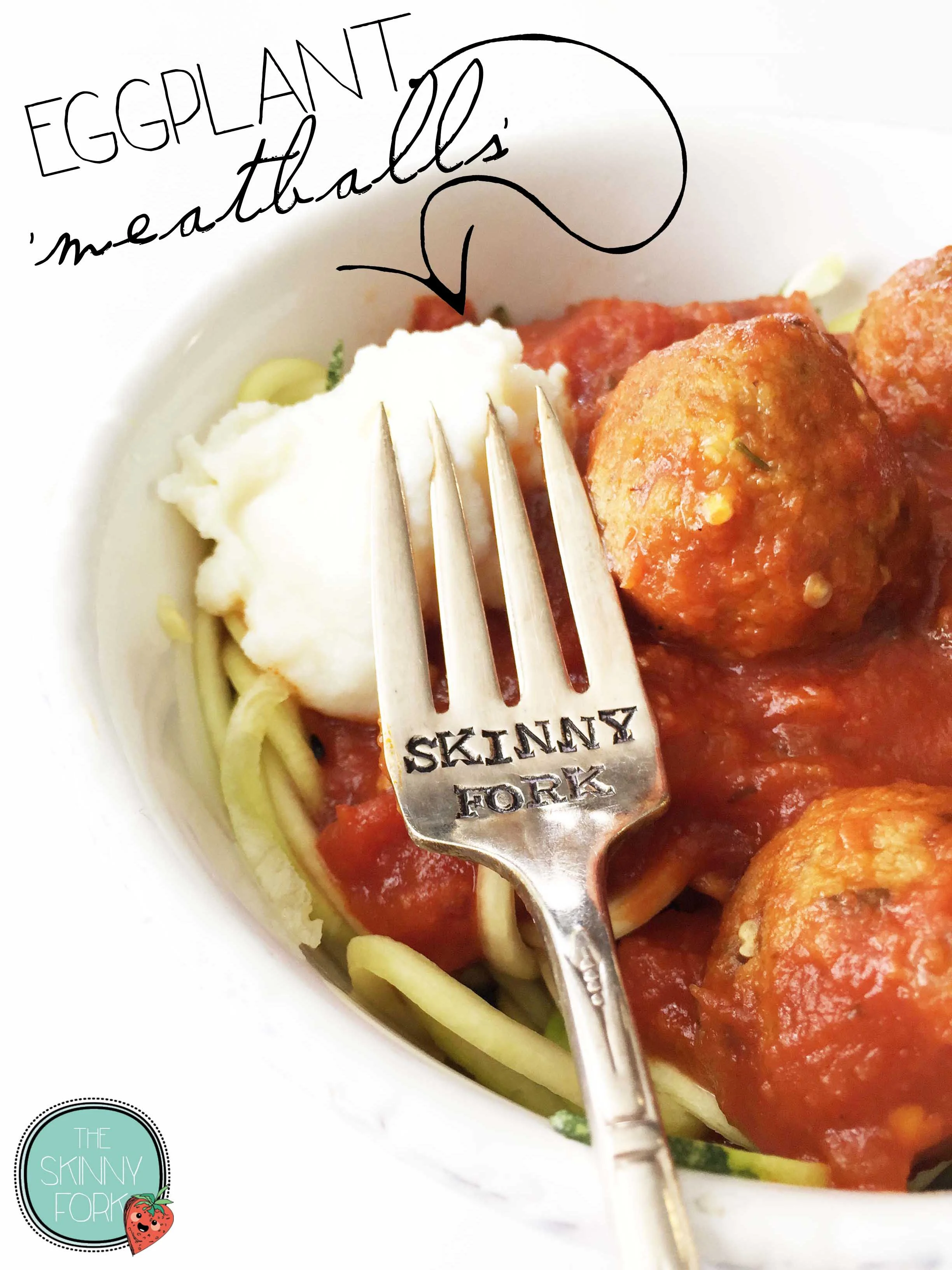 I served my eggplant 'meatballs' over some par-cooked spiraled zucchini squash noodles and topped with a dollop of fat free ricotta cheese, because why? Life is just better with more cheese in it.