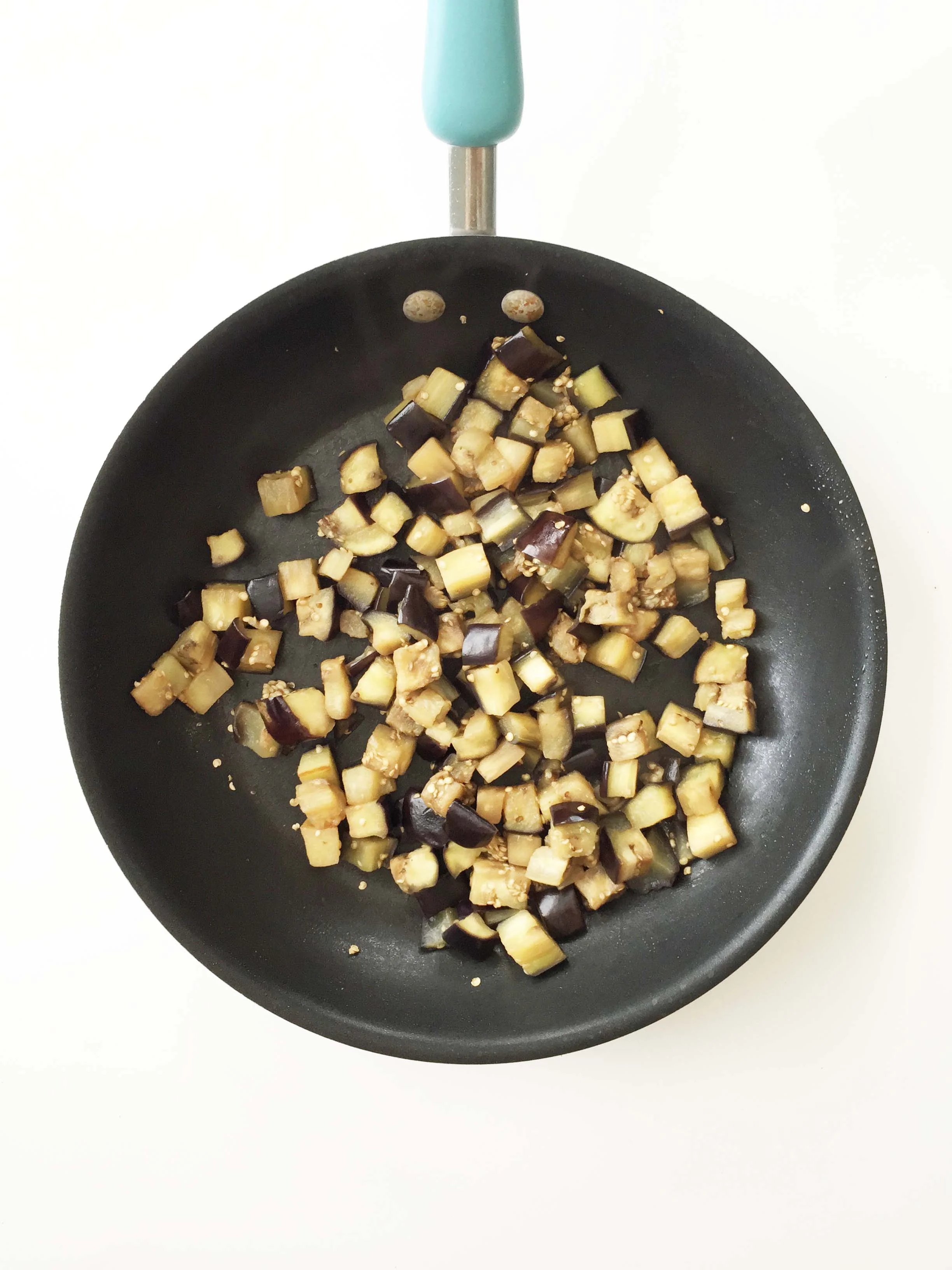 Add the oil to a skillet along with the eggplant and cook over medium heat for about 10 minutes or until the eggplant is tender.