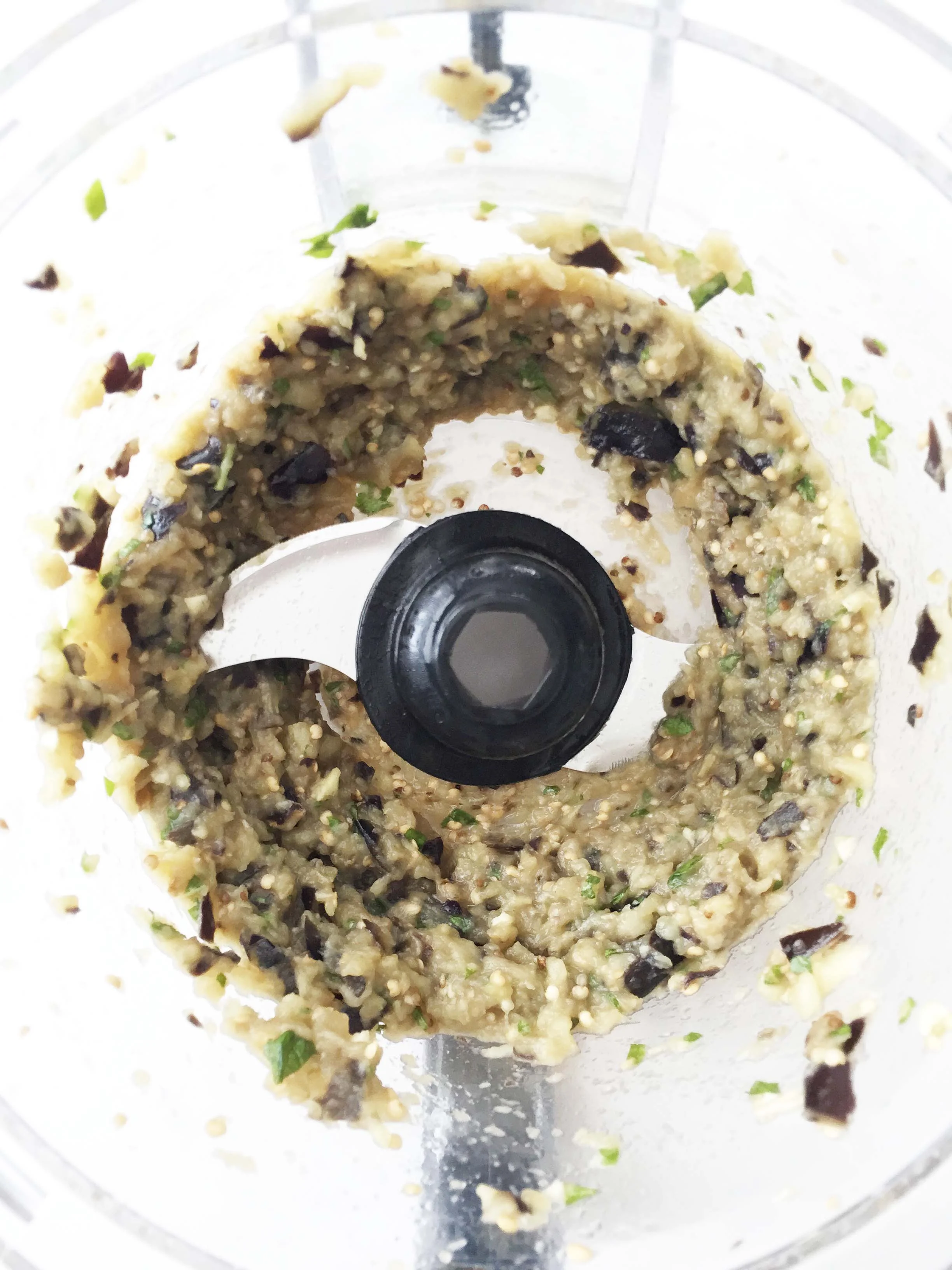 Place the cooked eggplant, garlic and fresh basil into a food processor and pulse to get a chunky and creamy sort of textured puree.