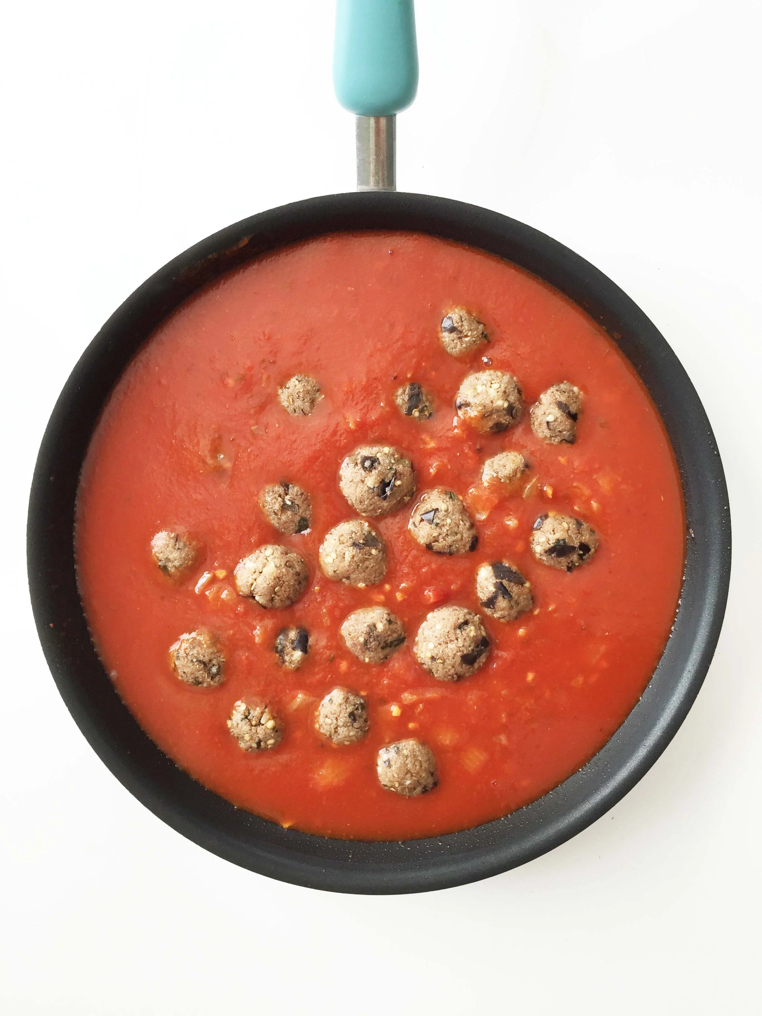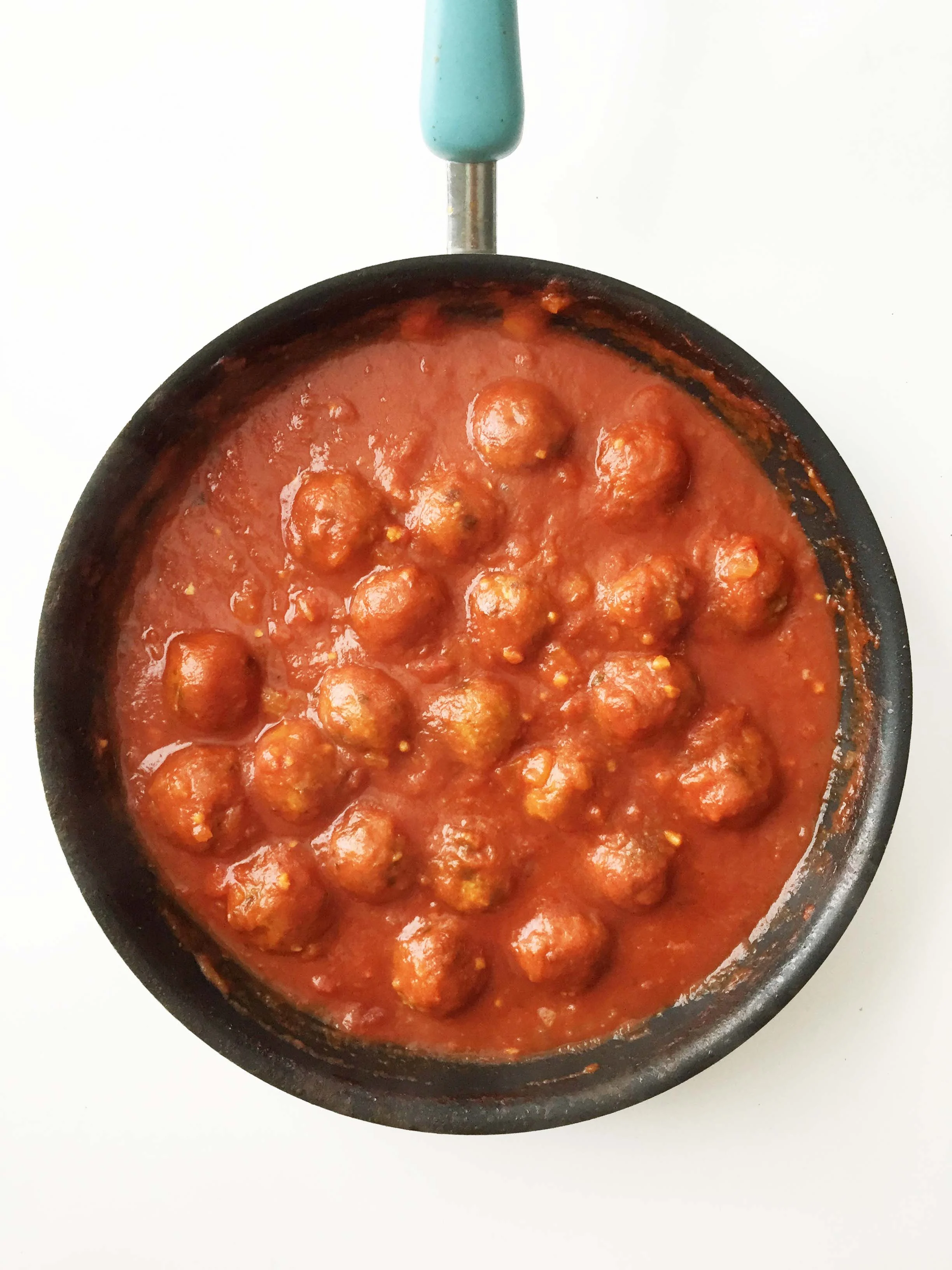 While I decided to use a jarred organic spaghetti sauce for ease of a busy work day, feel free to use the same amount of any Spaghetti Sauce of your choosing to cook these 'meatballs' up in.
