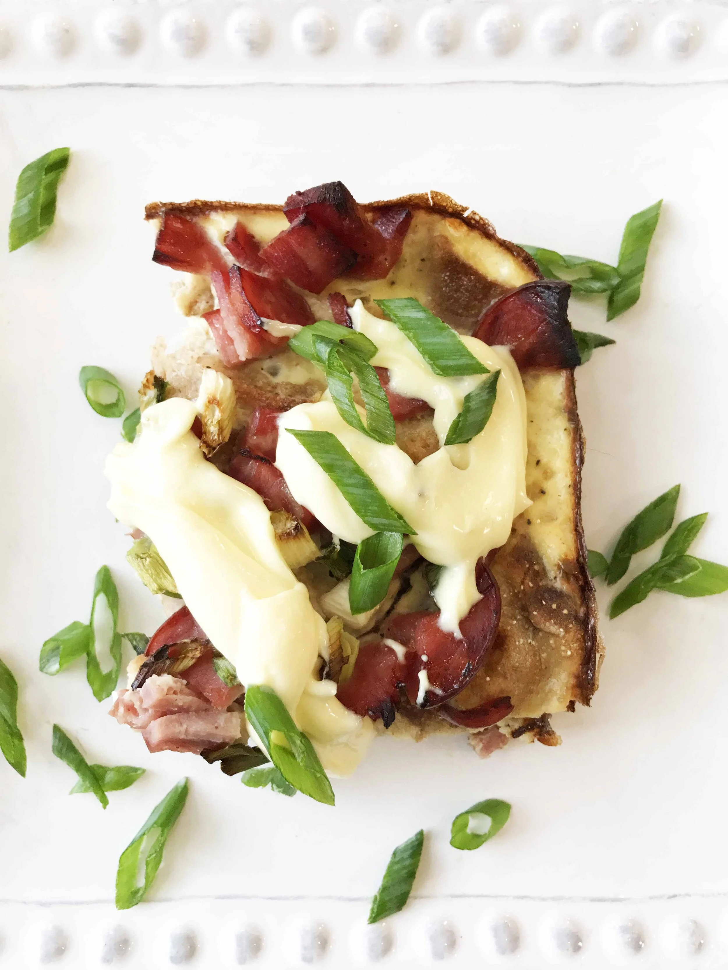 Pour the egg mixture over the english muffing and Canadian bacon in the baking dish and top it all off with the sliced green onions.