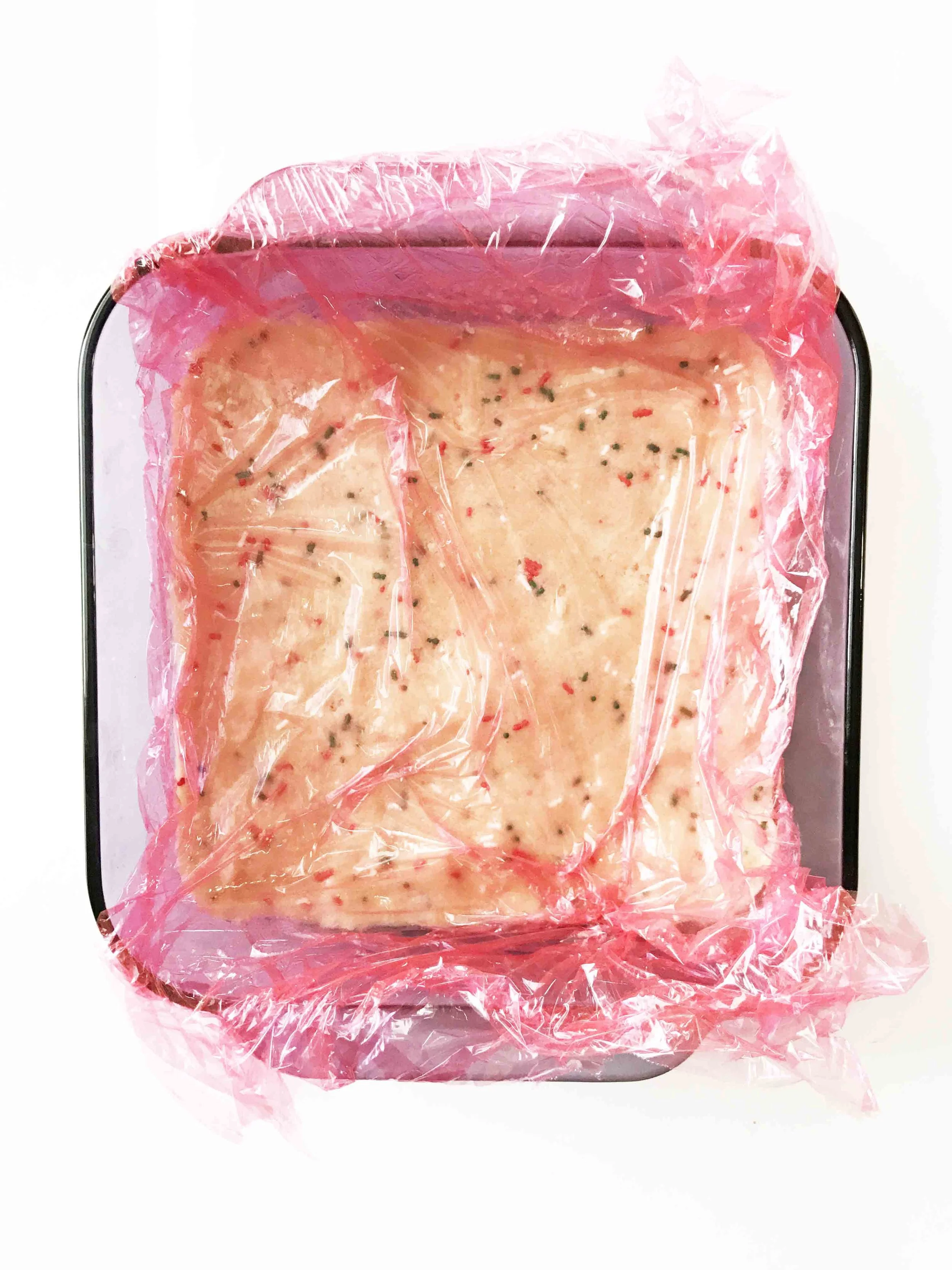 Line an 8x8 square baking dish with cling wrap, allowing for some overhang; lightly coat the cling wrap with non-stick spray.