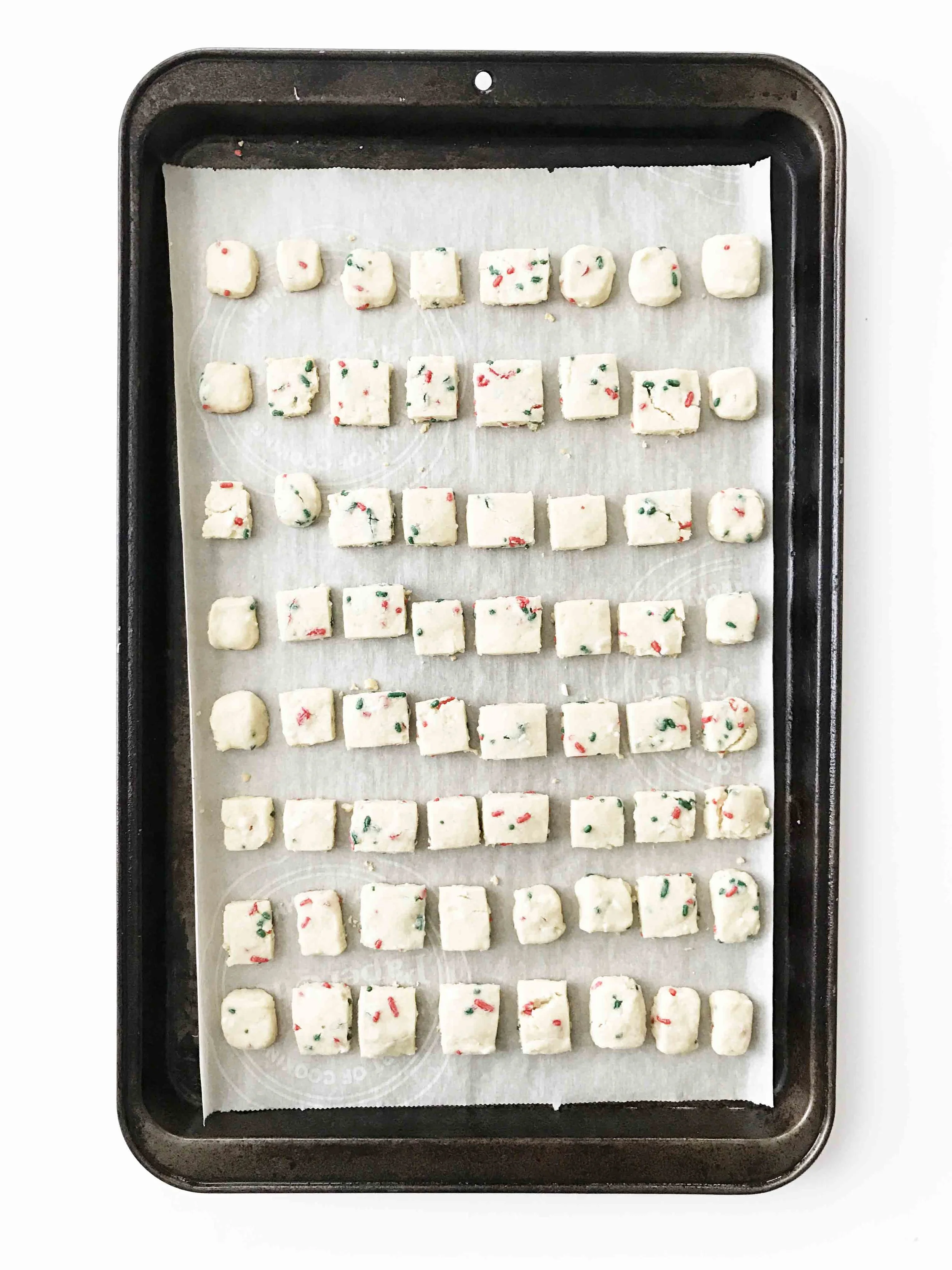 Set aside and use a pizza cutter or sharp chef knife to cut the dough into even squares, just under 1" in size.