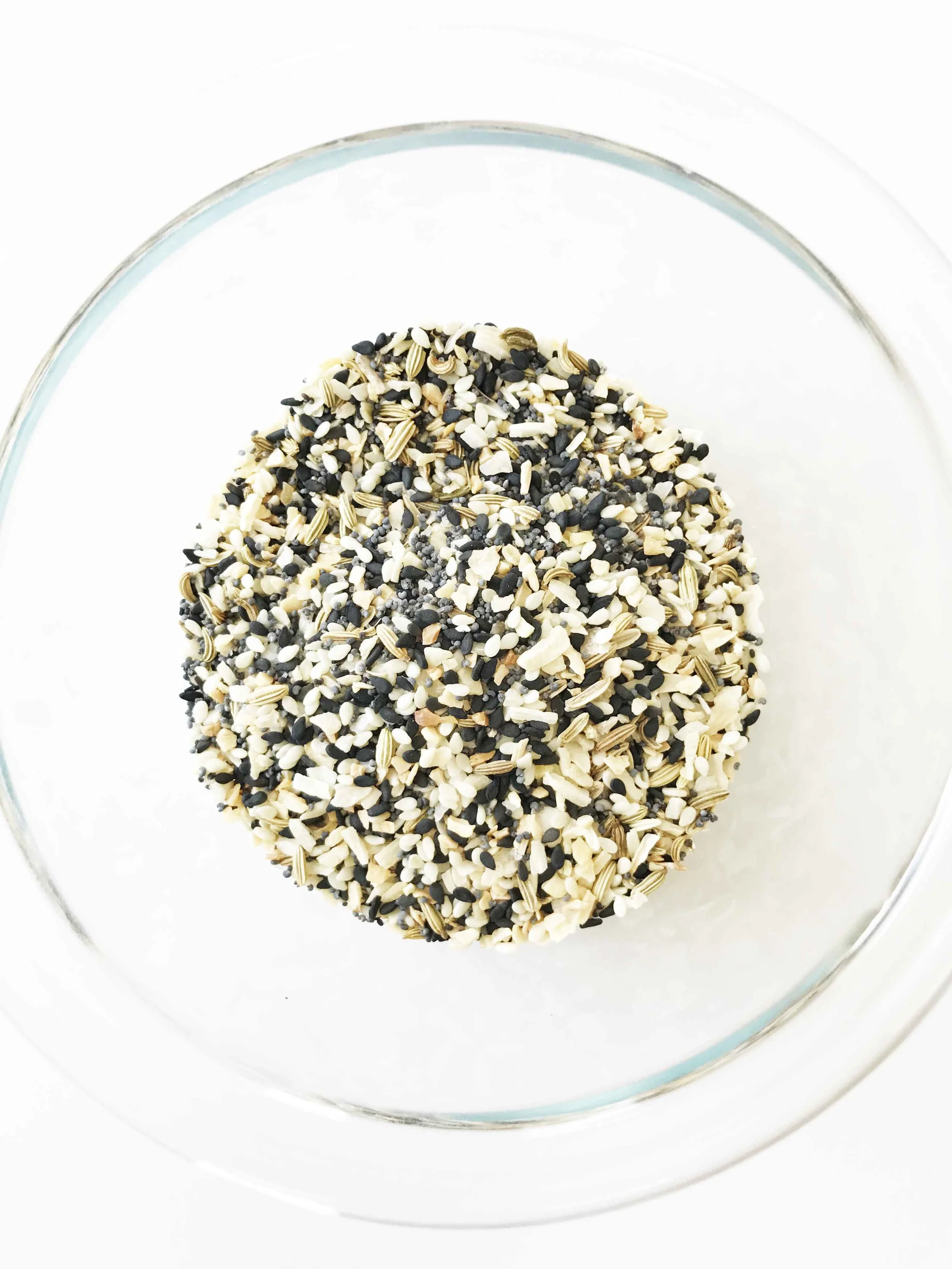 Combine the 1 Tbsp. Poppy Seeds, 1 1/2 Tsp. White Sesame Seeds, 1 1/2 Tsp. Black Sesame Seeds, 1 Tsp. Dried Onion, 1 Tsp. Dried Garlic, 1/2 Tsp. Sea Salt, and 1/2 Tsp. Fennel or Caraway together in a small bowl and mix until well blended.
