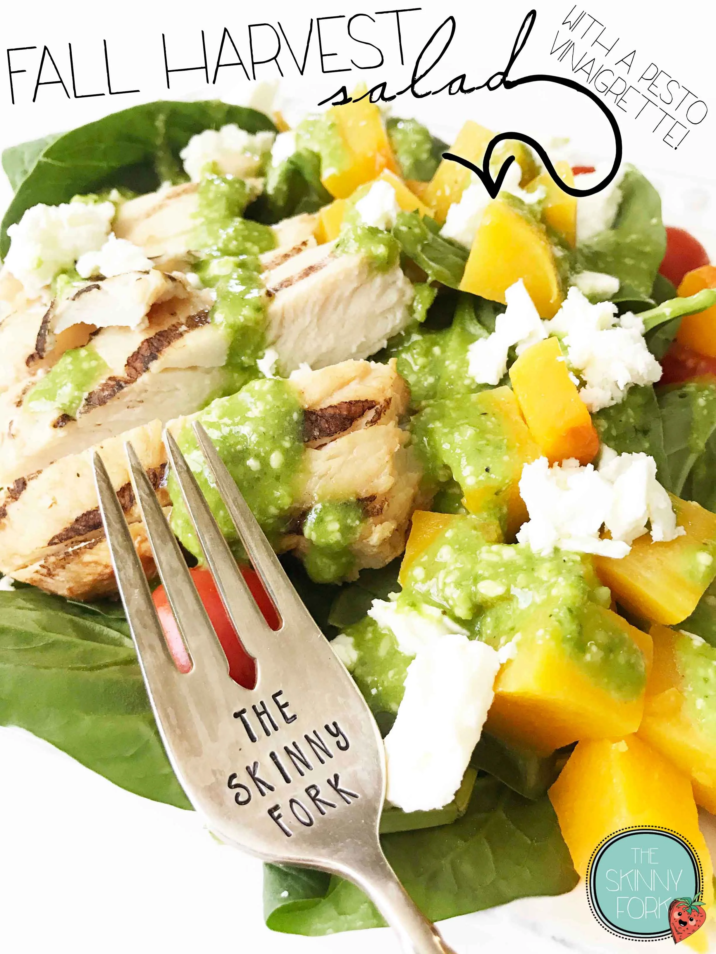 Top each salad with about 1/4 C. Butternut Squash, 4 Oz. Grilled Chicken Breast, 4 Cherry/Grape Tomatoes, and 1 Tbsp. Reduced Fat Feta crumbles.