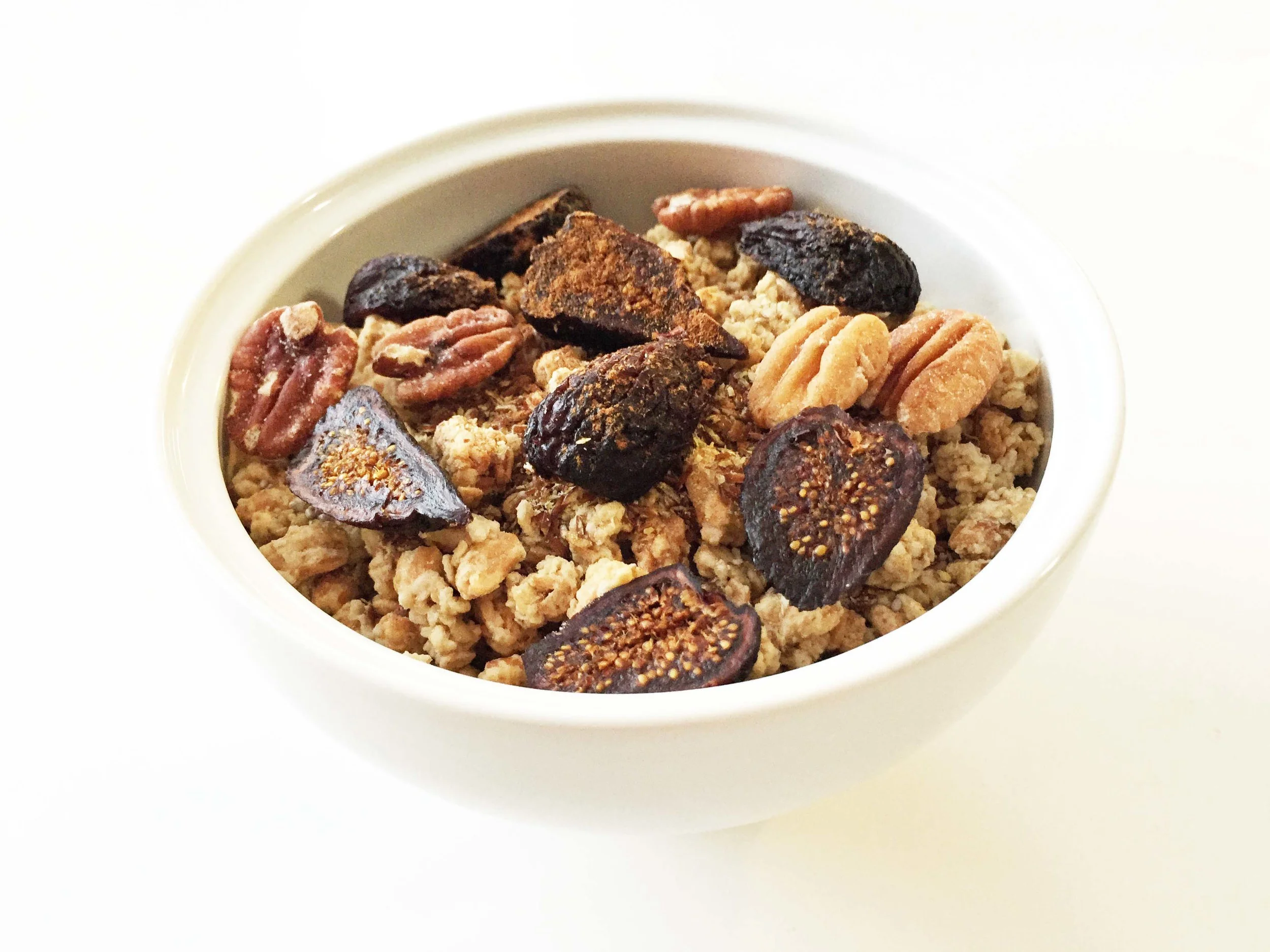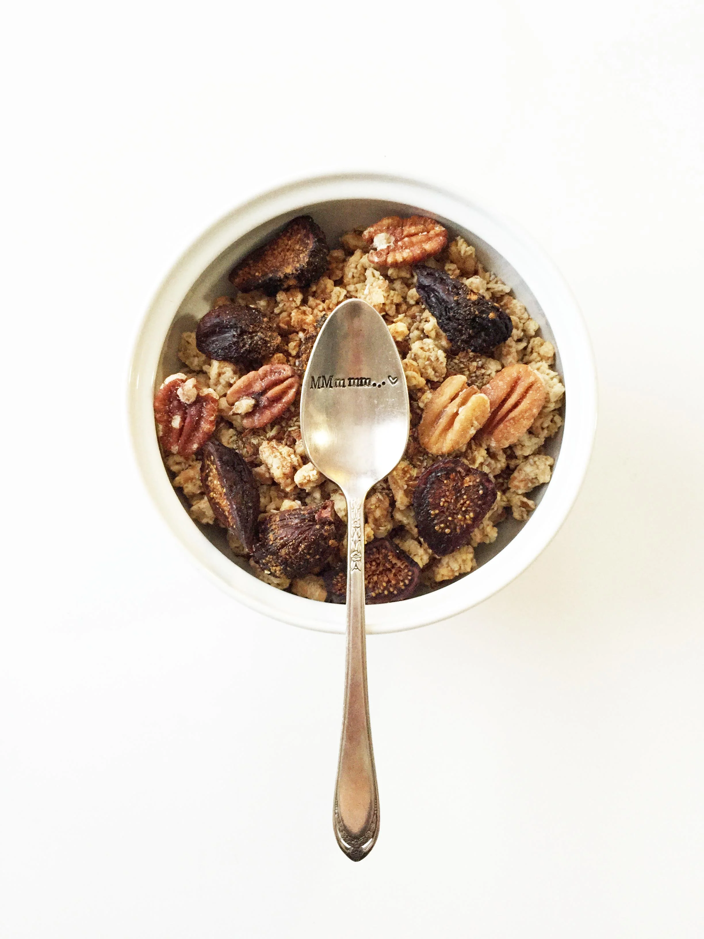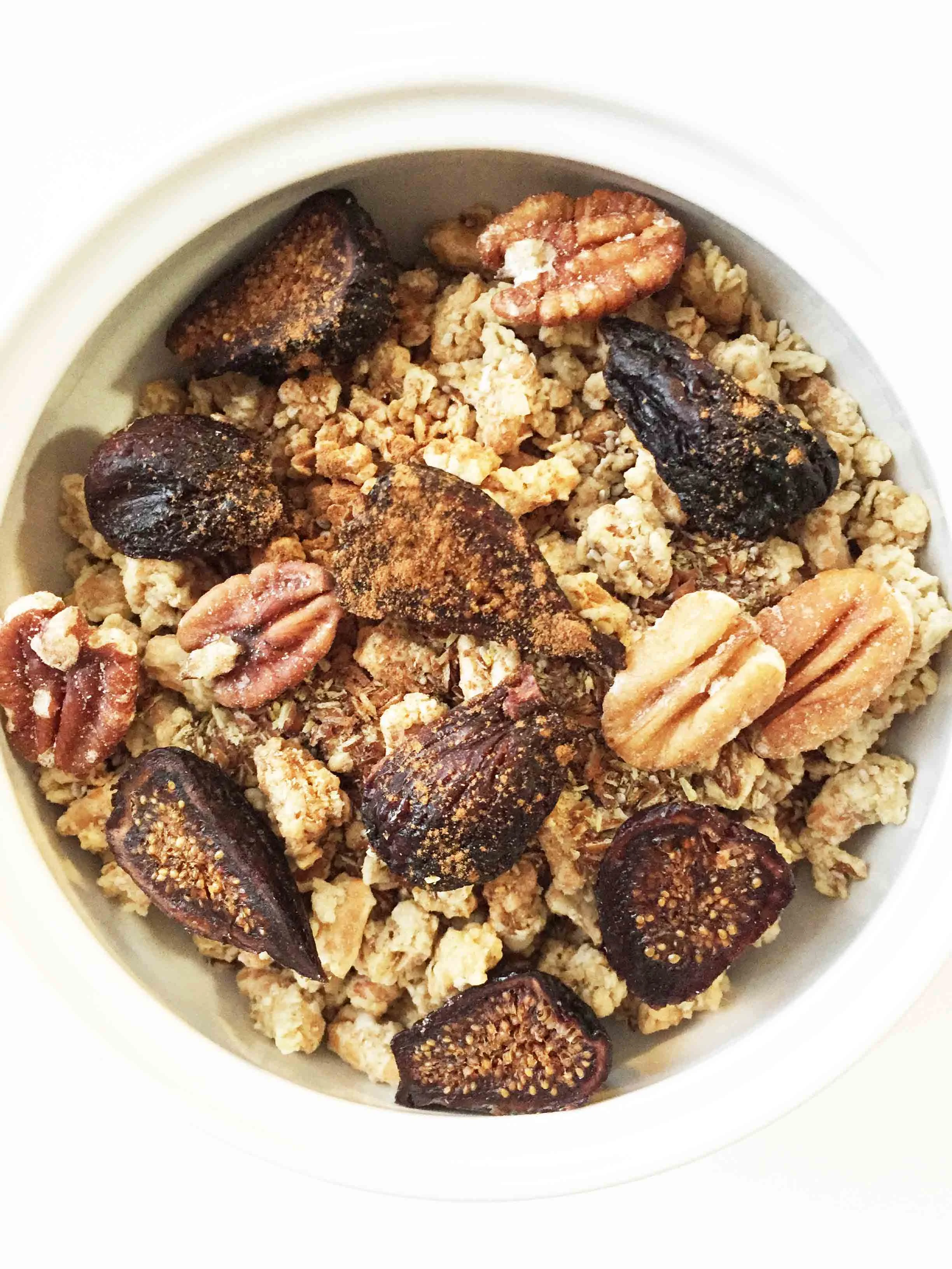 While it's still pretty warm here in Texas, I'm trying to start sneaking in fall flavors where I can and as I can without burning myself up with the oven or stove too much. This granola cereal is the perfect end to the summer and beginning transfer into fall; one of my most favorite seasons! The warm spice of cinnamon, pecan, and fig warm the tastebuds while the crisp of the granola and cool milk keep me grounded into the last few days of summer.