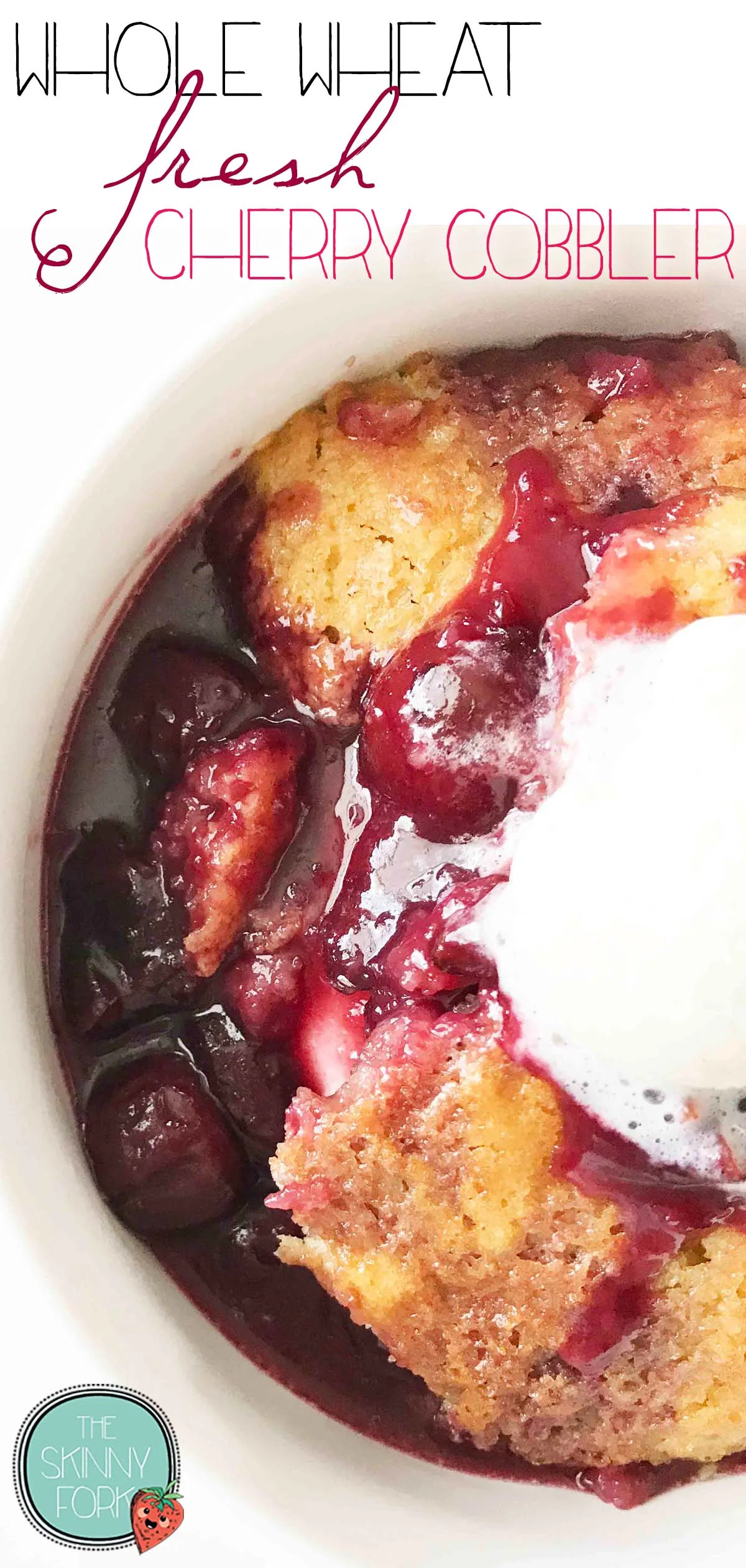 TheSkinnyFork.com A simple cherry cobbler that's made with some whole wheat and plenty of fresh cherries. Top it off with some vanilla bean ice cream for a real treat! Prep Time: 10 Minutes • Cook time: 30 Minutes