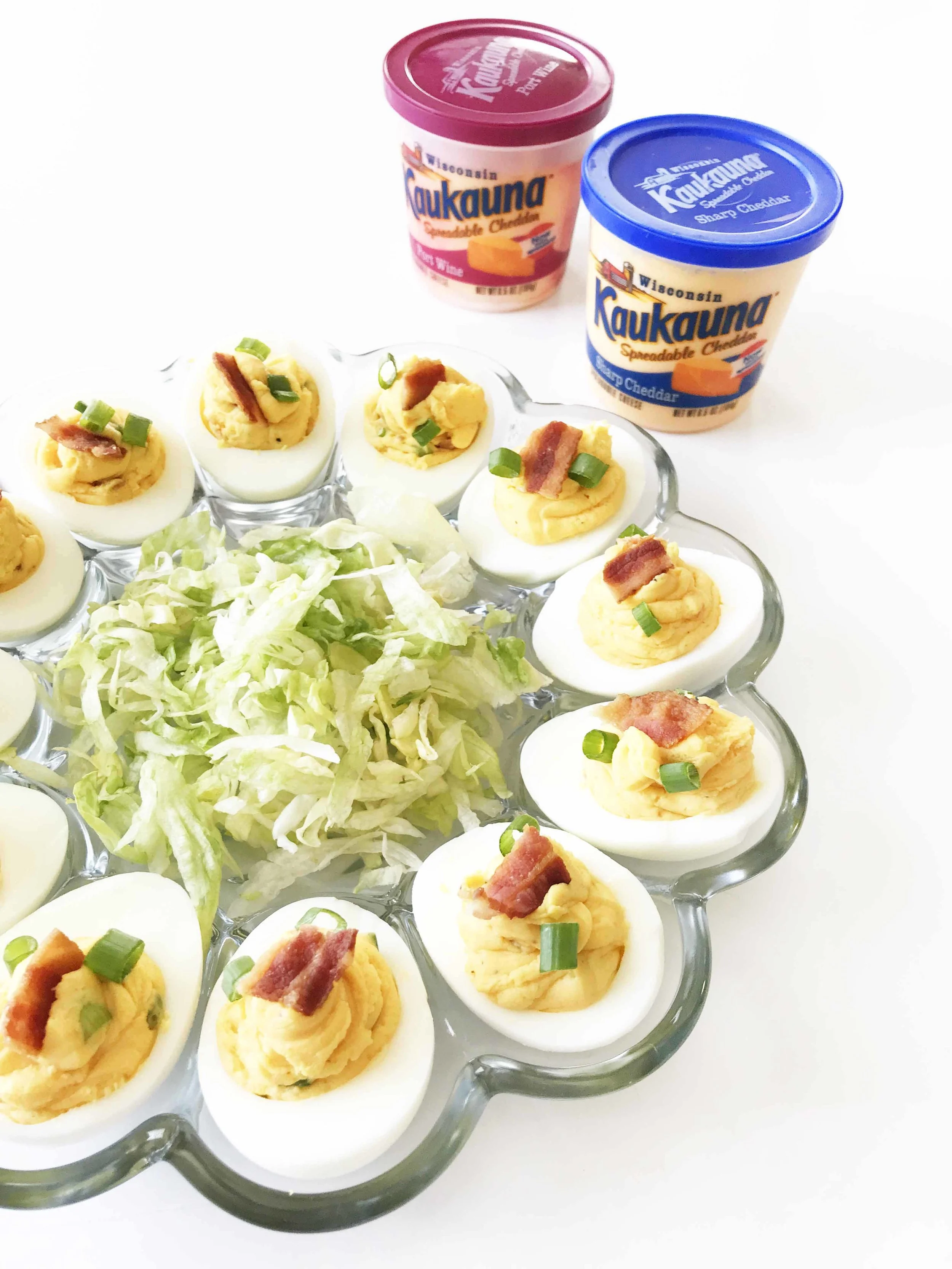 I used the Kaukauna® Sharp Cheddar Spreadable Cheddar for the base of these loaded deviled eggs, then added in the bacon, green onions, and not much else. They take no more than 15 minutes of prep time and the most of that is hands-off while the eggs are cooking!