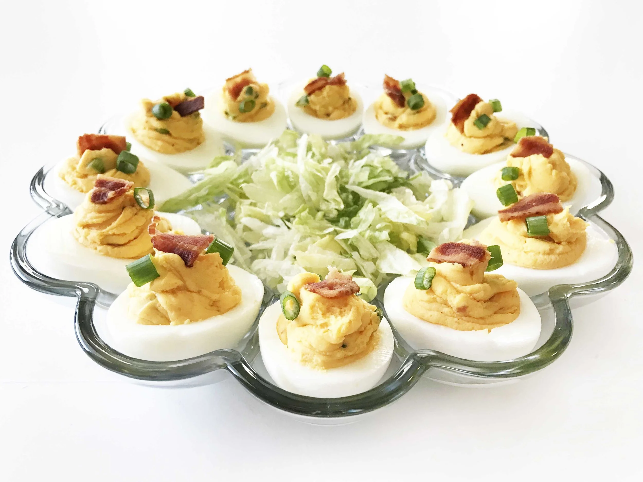 Deviled eggs are a go-to appetizer or snack for me anytime I'm playing hostess. Why? The reasoning is simple, just as simple as they are to make! The ease of making deviled eggs is what puts them at the top of my list; boil eggs, mix, fill and chill! That's all there is to it. Plus this 'fully loaded' version takes the classic up a notch (or several) for one beautiful bite of deliciousness!